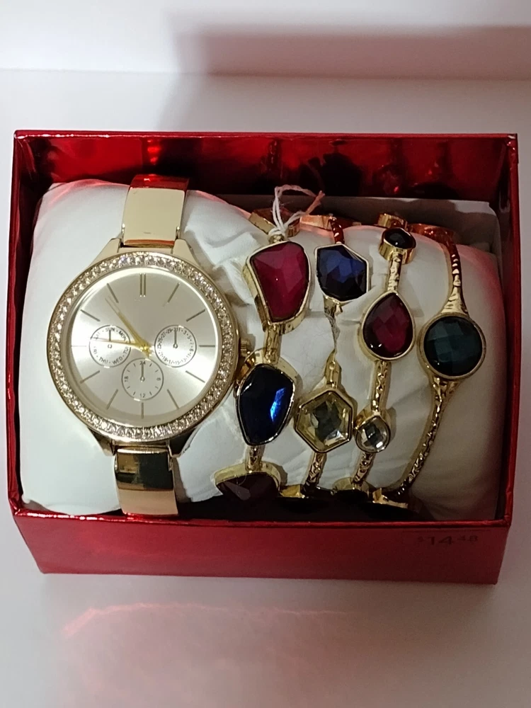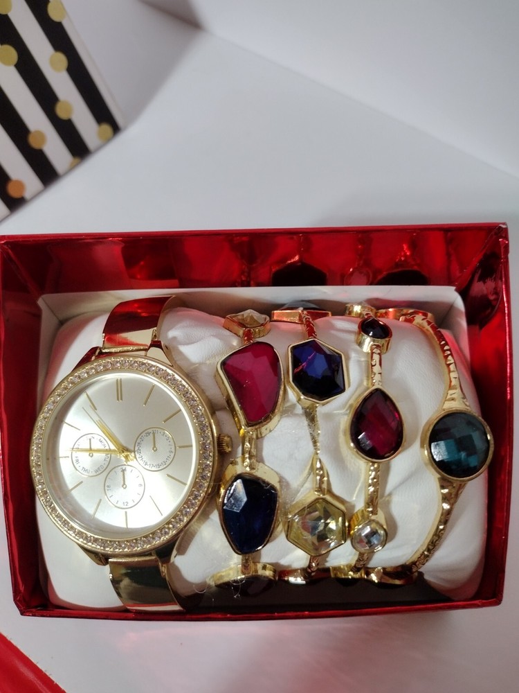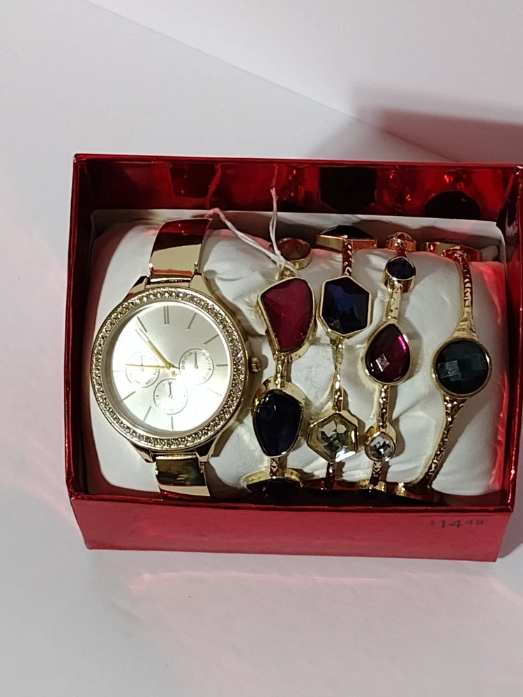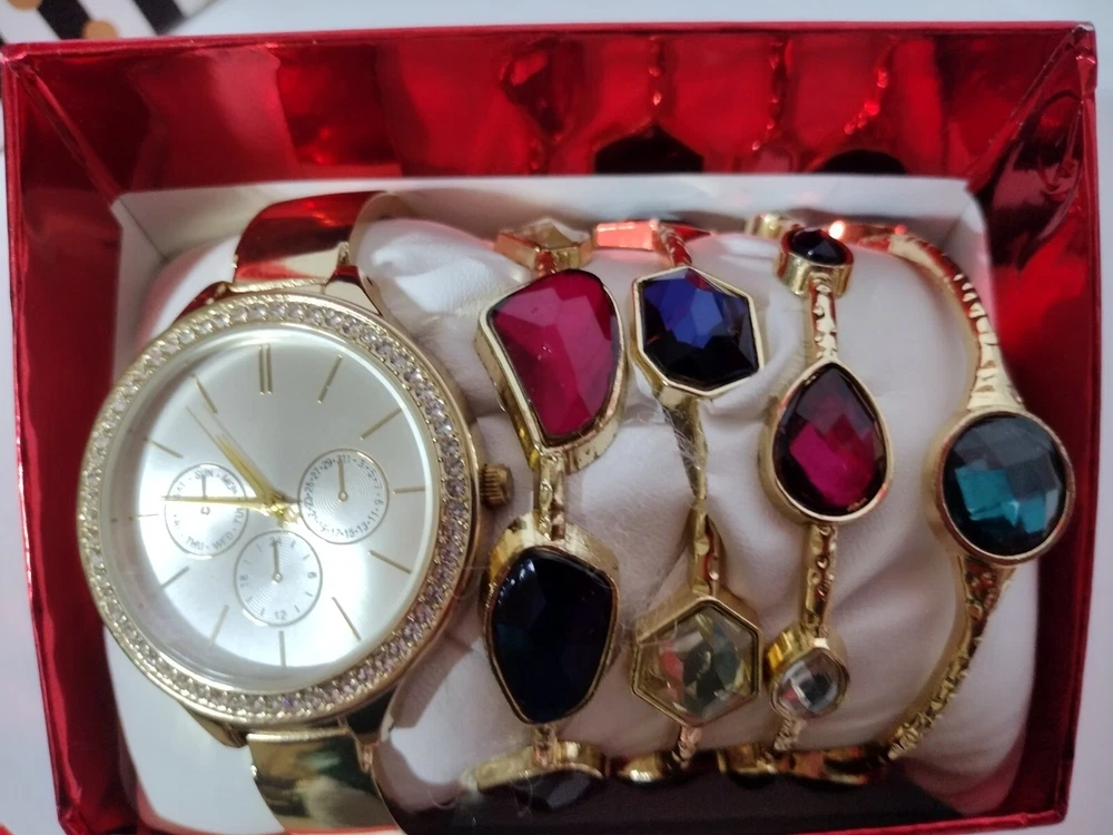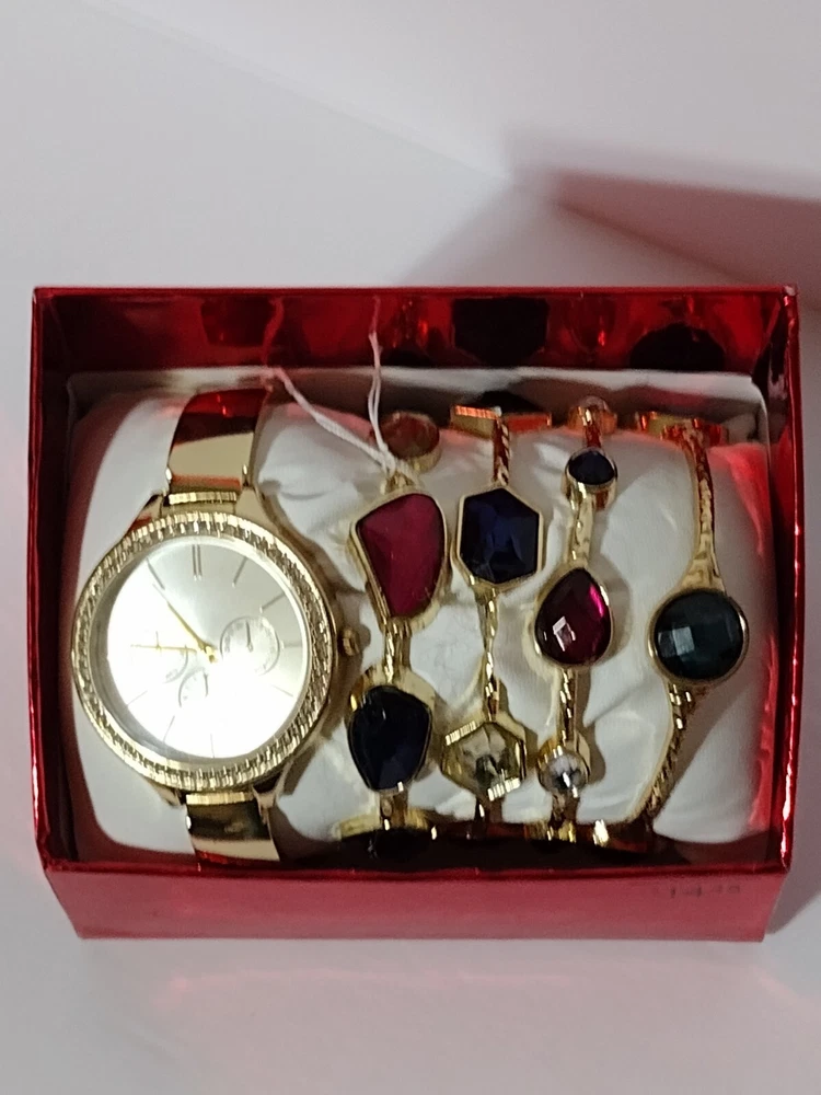 This stunning gold watch is absolutely gorgeous! It comes with four elegant bracelets, making it a perfect accessory for any outfit. The Japanese movement ensures reliable timekeeping, and the sleek design gives it a luxurious feel. Brand new in the box, it’s a fantastic gift for young ladies or anyone who loves chic jewelry. The packaging is elegant, and the watch itself looks even more beautiful in person—definitely worth it!