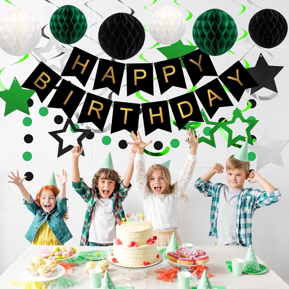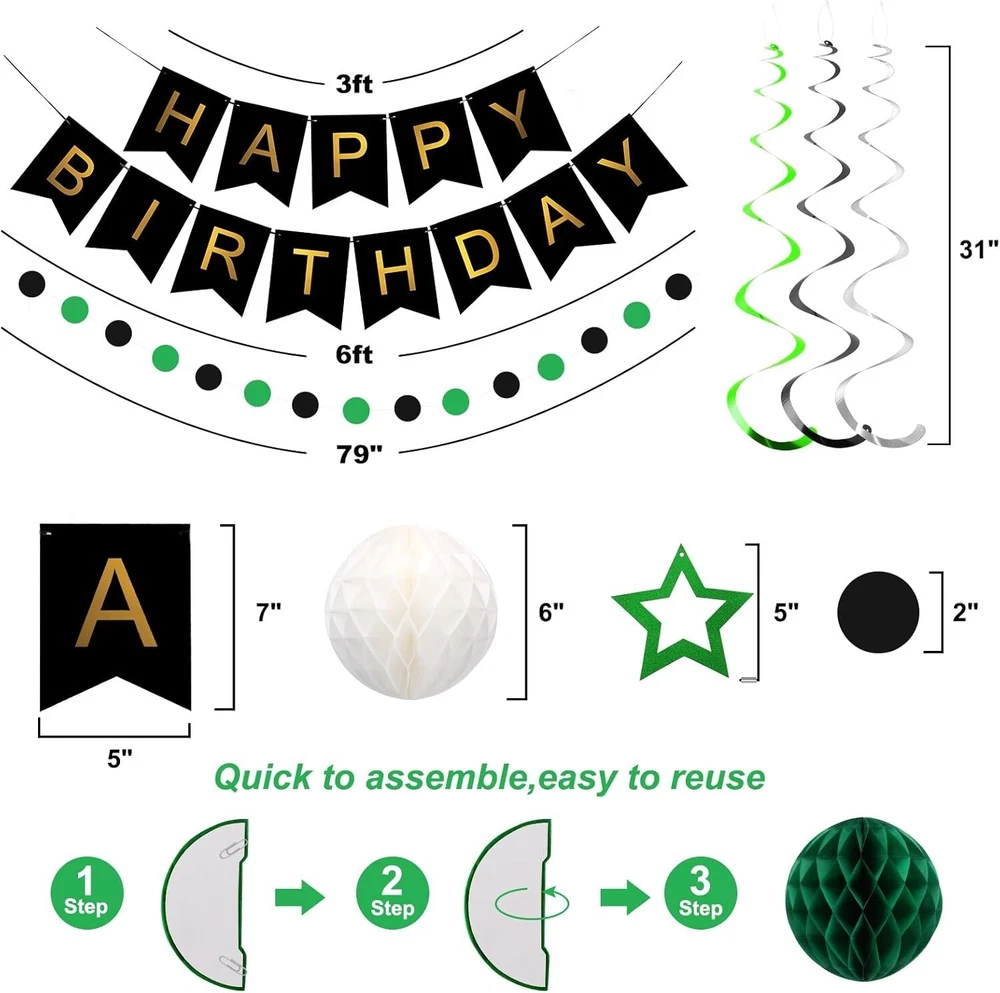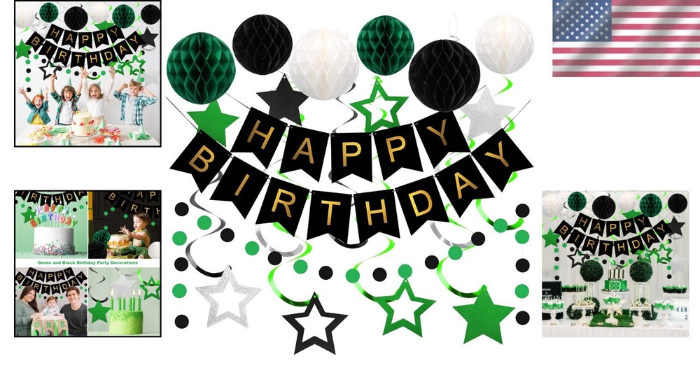 Elegant Green & Black Birthday Decorations Set - Banner, Honeycomb & Streamers ‹ › ‹ › ‹ › ‹ › ‹ › ‹ › ‹ › ‹ › ‹ › Elegant Green & Black Birthday Decorations Set Transform your birthday celebration into a vibrant festival of color and joy with our Elegant Green & Black Birthday Decorations Set. Vibrant Color: Bring a burst of color to your birthday party with our exquisite decorations. Featuring a stunning palette of bright green and bold black hues, our party decorations are designed to create a lively and festive atmosphere that children and adults alike will adore. Package Includes: 1 pcs Happy Birthday Banner 6 pcs Honeycomb Balls 8 pcs Star Swirls Streamers 1 pcs Circle Dots Decorations This all-in-one package ensures that you have everything you need to create the perfect party ambiance, eliminating the hassle of shopping for individual items. Easy to Assemble: Say goodbye to complicated setup processes and embrace the ease of our ready-to-use decorations. In mere moments, you can transform your space into a stunning event venue that will leave an unforgettable impression on guests of all ages. Versatile and Reusable: Our birthday decorations are crafted from materials, ensuring durability and longevity. These decorations are not only built to withstand the merriment of the day but are also reusable, making them a cost-effective choice for all your future celebration needs. Perfect for All Ages: Add a touch of whimsy and charm to any birthday party with our enchanting decorations set. Whether it’s for kids or adults, our colorful ensemble creates a magical atmosphere that will be remembered for to come. Warning: This product is designed by our company and is protected under U.S. copyright and design patents (Reg. No.: VA0002405781). Unauthorized use or sale is strictly prohibited and will be pursued. Don’t let your celebration go unadorned; elevate your party to new heights with our Elegant Green & Black Birthday Decorations Set today! Shipping Free & Fast Shipping - We offer free shipping to most of the USA with a normal delivery time of 3-7 days. However, due to the current situation, additional delivery time (up to 3 weeks) may be required for some items. Alternative Carriers - We may use alternative carriers (e.g. USPS, FedEx, UPS, etc.) to ensure your package arrives safely and on time. Due to the use of multiple carriers, we are unable to provide a tracking number automatically. Handling Time - Orders are processed and shipped within 1-2 business days of receiving cleared payment. Shipping Restrictions - Shipping to Alaska, Hawaii, Puerto Rico, Guam, and other US territories may incur shipping charges or delivery restrictions. Please contact us before ordering, or your order can be refunded/cancelled. State Restrictions - There may be restrictions based on your state of purchase. For example, certain items may not be shipped to California due to state regulations. Contact for Tracking Updates - If you require tracking updates or have any concerns about the delivery of your order, please feel free to contact us, and we will be happy to assist you. Return 30-Day Hassle-Free Returns - We want you to be completely satisfied with your purchase. If you are not, you can return the item within 30 days of receiving it for a full refund or exchange. Easy Return Process - To start a return, simply contact us and we will provide you with a prepaid return shipping label and detailed instructions. Restocking Fee - There are no restocking fees for returns. However, the buyer is responsible for return shipping costs if the return is not due to a seller's error. Refund Processing Time - Refunds will be processed within 5 business days of receiving the returned item in its condition. Payment We accept all major credit cards, PayPal, and Apple Pay for your convenience. Your payment information is secure and encrypted to ensure a safe and seamless transaction. Please complete your payment within 3 days of purchase to avoid any delays in shipping. Feedback Your feedback is extremely important to us. We strive to provide the best products and customer service possible. If you are satisfied with your purchase, please take a moment to leave us a positive review. If you have any concerns or issues with your order, please contact us before leaving negative feedback. We are committed to resolving any problems and ensuring your satisfaction. Contact Us If you have any questions or concerns, please feel free to out to our customer support team. You can contact us through the eBay messaging system. We are available Monday to Friday, 9:00 am to 5:00 pm EST, and we will do our best to respond to your inquiry within 24 hours. Buy it now and enjoy a pleasant shopping experience! Unit Quantity: 8 ounces Character: Birthday Decorations Material: Paper,cardstock Type: Backdrop Occasion: Birthday Color: Green Theme: Star Department: Kids Style: Contemporary Origin: Unknown Unit Type: oz
