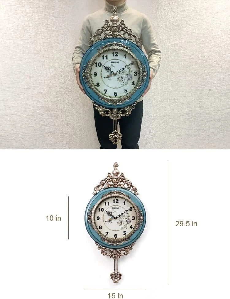 Elegant, Traditional, Decorative, Hand Painted Modern Grandfather Wall Clock Fancy Ethnic Luxury Handmade Decoration, Swinging Pendulum for New Room or Office. Large. Inch. Blue Polyresin, Plastic Made in USA or Imported Eye-catcher Design: If you are tired of boring wall or want to have more fun for life, this unique product will satisfy you. Brilliant geometrical design, classic style and mature craftsmanship, the decorative clock will be striking accents. Vintage Wall Clock: Polyresin and polymers (plastic) with glass front cover. Retro looking Polyresin wall clock in antique and modern colors. High-quality Materials: This clock is crafted of metal-look resin that won't rust. Made with fade-resistant, long lasting materials. The combination of handmade and polyresin creates extraordinary artistic charm. Dimensions: 15-inch clock face diameter; full length (with pendulum). Battery Operated: Powered by two AA Carbon battery. (Note: Batteries are not provided.).one for the clock, and the other one for the pendulum. High-quality Quartz Movement: Precision and reliability. The high quality clock movement also SATISFACTION GUARANTEEs the smooth movement of clock hands, thus ensuring better time accuracy and longer working life. Silent Clock: The silent clock movement prevents the clock from annoying ticking sound to provide you a noiseless environment to sleep and work. Unique Fancy Home Decoration:Try it for a vivid addition to inspire an Artistic atmosphere, make your life comfortable and relaxed. Multi Scenario Use: The perfect wall clock for an office, classroom, bedroom, living room, reading room, restaurant, office and more. Makes a Great Gift: A art deco gift for anyone who loves modern simplicity designs with a clean aesthetic.