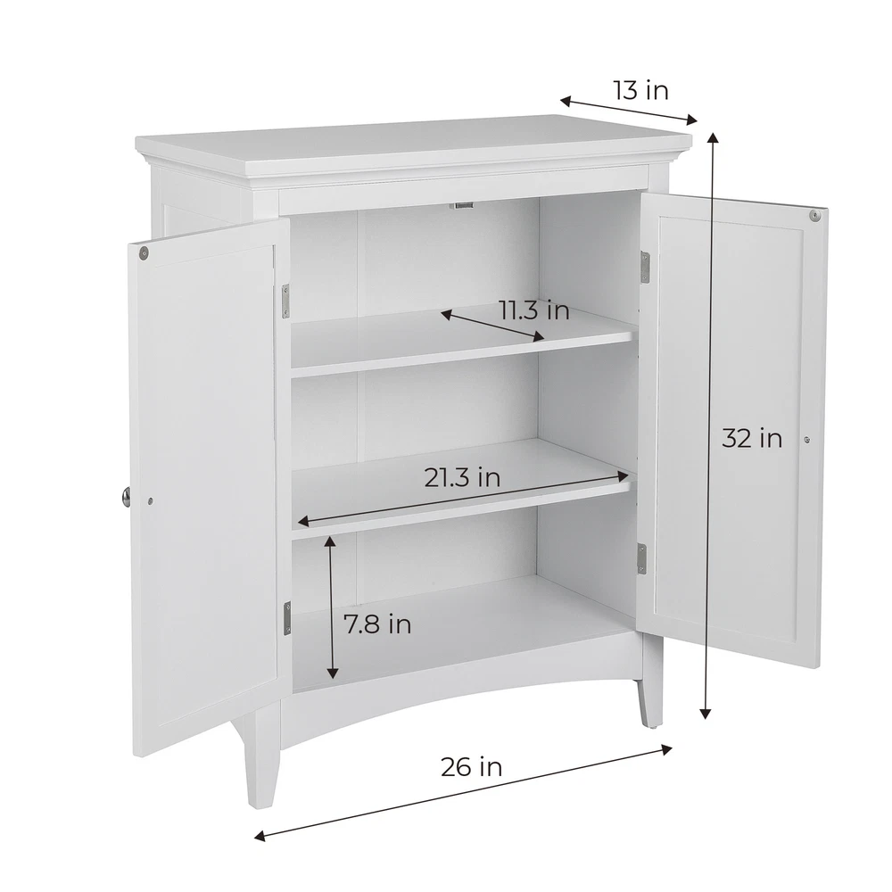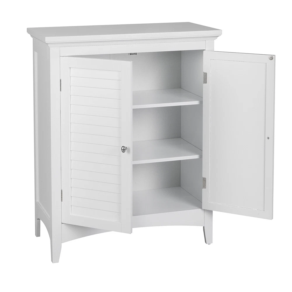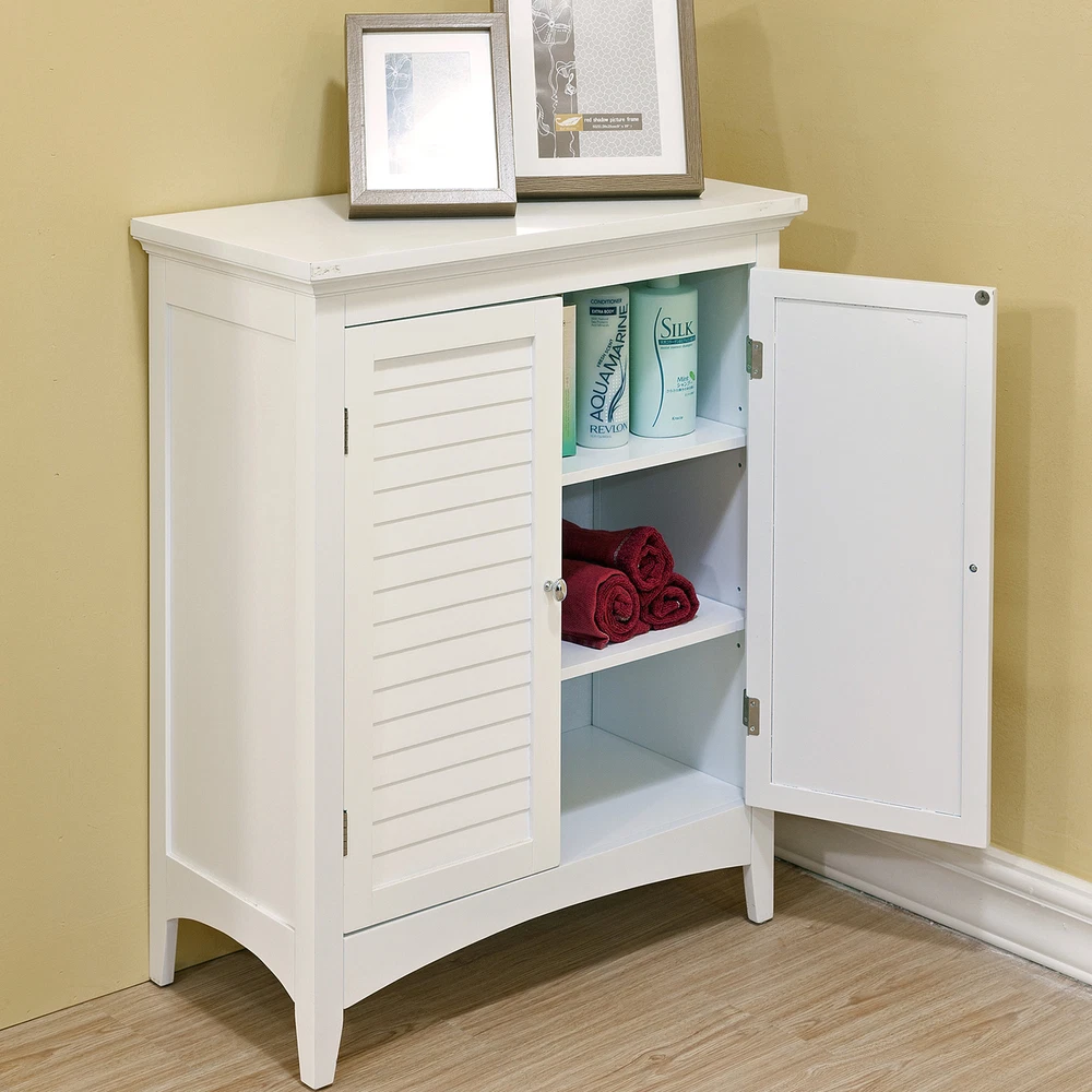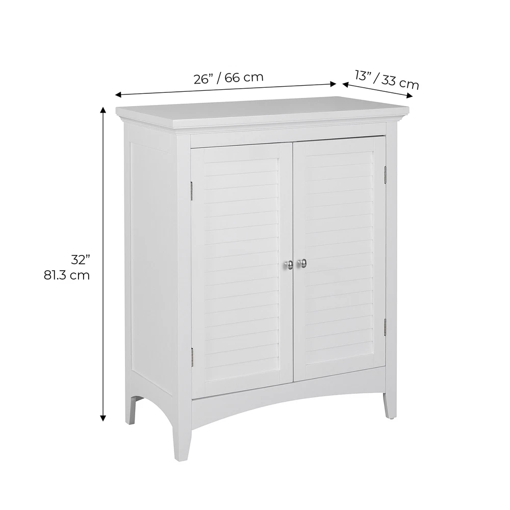 Upgrade your home storage while adding classic style with the Elegant Home Fashions Glancy Wooden Floor Cabinet with Shutter Doors. This decorative cabinet features a timeless white finish with a crown molded top and skirting, chrome-finished knobs, louvered doors, and shaker-style legs for a beautiful addition to your space. The included fixed shelf and an adjustable shelf make this cabinet functional and customizable to suit your storage needs. Constructed from durable engineered wood with included anti-tipping hardware, this storage unit is built to provide you with long-lasting organization. Easy, step-by-step instructions and all of the hardware needed for installation are included for quick assembly Elegant Home Fashions Glancy Two Shutter Doors Wooden Storage Stand Floor Cabinet White Features Featuring crown molded top, shaker-style legs and a pair of faux louvered doors in white Two interior adjustable shelves to help reduce clutter and keep your home tidy, without making permanent changes Made of sustainable engineered wood that is less likely to warp, crack, or rot than solid wood Magnetic latch ensures a gentle, silent close, eliminating door slamming Dimensions: 25.98" L x 12.99" W x 32.01" H SKU:ELG-585 The Teamson Home Glancy Freestanding Floor Cabinet is a versatile storage solution featuring a white finish and faux louvered doors that stay closed with a magnetic latch. Shaker-style legs, crown molding on top, and a pair oval-shaped satin nickel knobs blend to create a decorative, functional cabinet. Made of engineered wood, a pair of interior adjustable shelves can be used to customize storage.