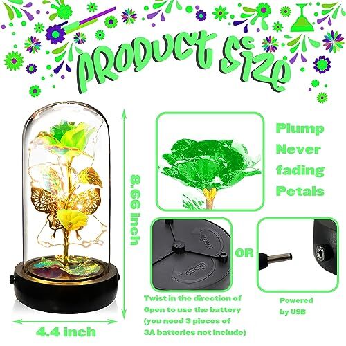 Return Policy Fast Delivery Trusted seller Valentines Rose Flower Gifts for Women, Valentines Day Gifts For Her, Colorful Green Rose in Glass Dome with Music Box, Valentines Flower Gifts for Mom Girlfriend Grandma, Light Up Rose in Glass Dome Product Description 【Green Rose Gifts】Forever rose music box is suitable as romantic gifts for a wife from a husband, personalized gifts for a mom from a daughter/son, unique gifts for grandma from a granddaughter/grandson/grandkids, and funny gifts for a best friend. 【Music Box】The rotating rose music box does not require batteries, just gently turn the music base, and you can play wonderful music. Colorful eternal roses, and built-in music box songs, create a romantic atmosp and make people feel very warm. 【Rose Forever Suitable for Multi-Occasions】The eternal rose in the glass dome is the best gift for women like Moms, wives, lovers, girlfriends, sisters, and grandmas to show your infinity love. Good idea to decorate your home, office, bar, or any place to increase the romantic atmosp with this light-up rose. 【Two Power Supply Modes】Can be powered by a USB cable, or twist in the direction of Open to replace the battery at the bottom; Notes: the battery is not in the package, you need 3 pieces 3A batteries with remote control to turn on, off, and switch the 3 type light mode. 【After Sales Service】Get the package, you will get a rose in a glass dome, a USB cable, remote control, a gift box, and a greeting card. If t is any problem with this product, you can always contact us by email, we have professional customer service staff to answer for you. Shipping Returns Payment Shipping Shipping is FREE to all addresses other than APO/PO boxes in the lower 48 states. All our stock ships from US-based warehouses. Shipped via USPS or UPS (depending on location and package weight) Unless stated otherwise, all orders will ship within 24-72 hours of your payment being processed. Check our feedback to see the great reviews of FAST shipping we offer. Returns Seller does not accept returns Payment We currently accept payment via eBay managed payments only. Once payment is cleared, we will dispatch your shipment within 1-3 business days. Please refer to the "Shipping" tab for more information regarding shipping speed to your destination.