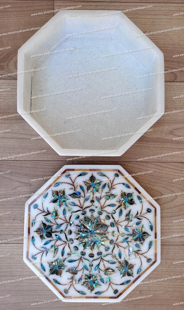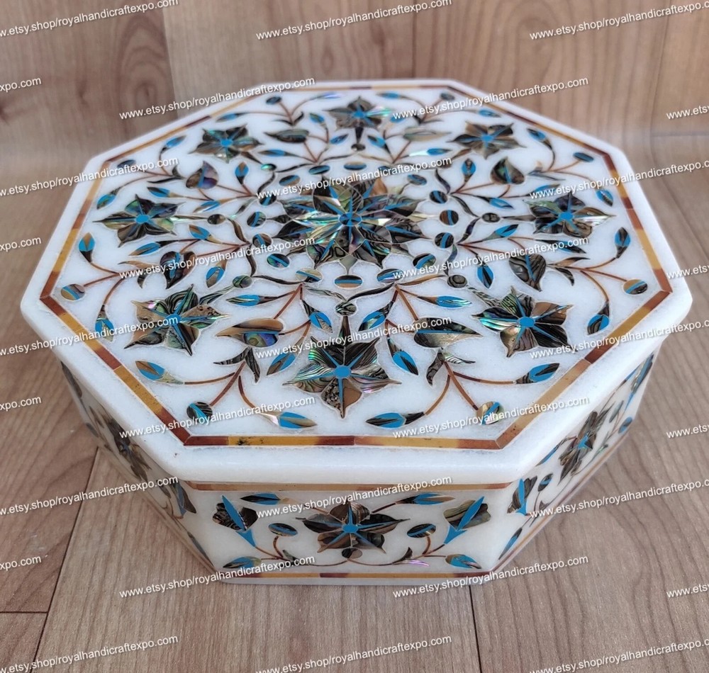 This stunning marble jewelry box is a masterpiece of traditional Pietradura craftsmanship, just like the intricate work seen in the Taj Mahal! The hand-cut semi-precious stone inlays create a dazzling floral or geometric pattern, each piece carefully fitted into the marble for a flawless finish. It's not just a jewelry box—it's a piece of history and art, perfect for adding elegance to any home. The attention to detail is incredible, making it a true heirloom. Highly recommended for anyone who appreciates fine craftsmanship!