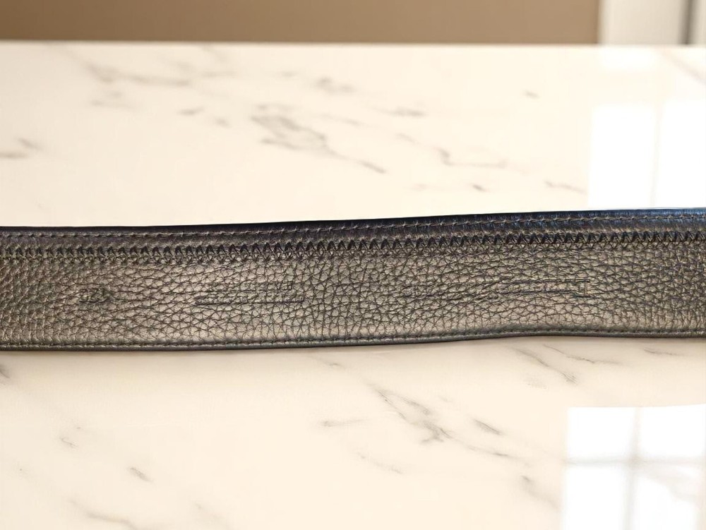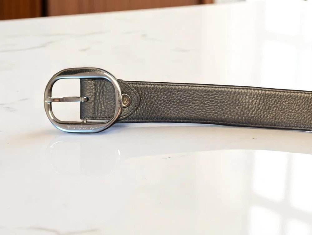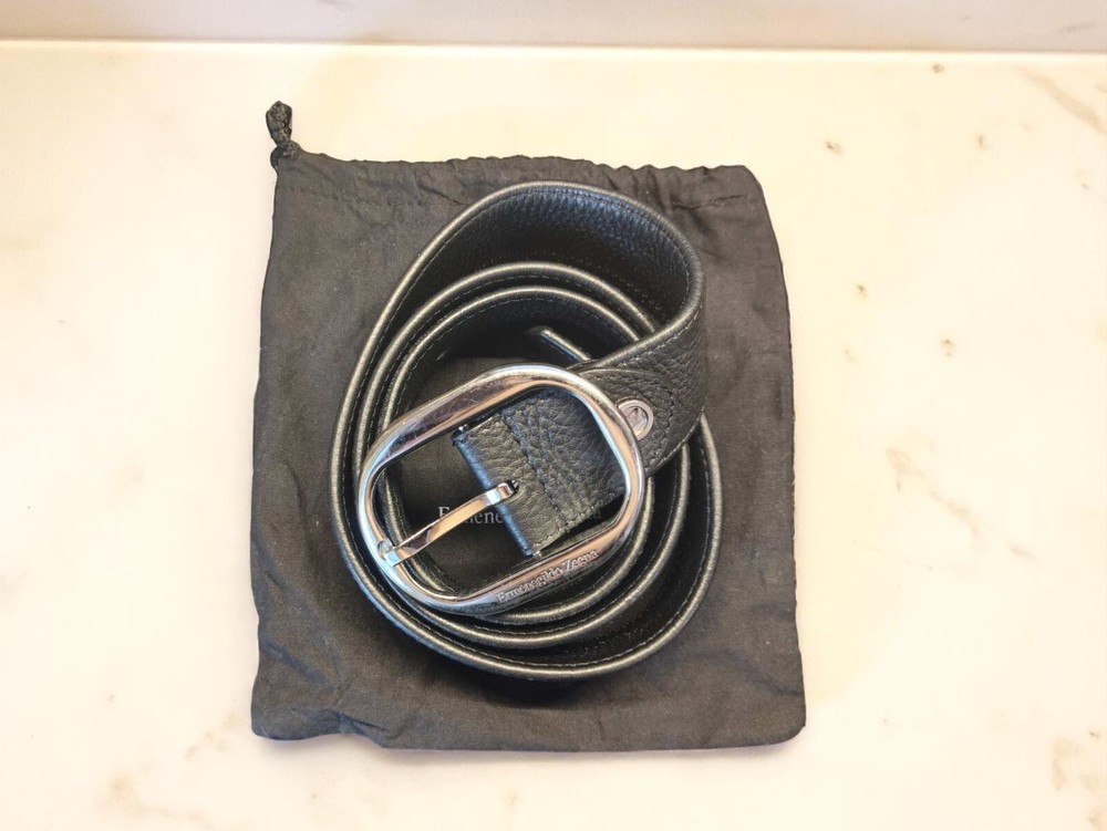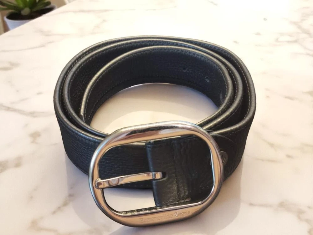 For sale is a luxurious men's belt from the world-renowned Italian brand Ermenegildo Zegna. Crafted from premium genuine leather, it is exceptionally soft and pleasant to the touch, ensuring unparalleled comfort. The classic black color and stylish silver-tone buckle make it a perfect addition to any wardrobe. Details: Brand: Ermenegildo Zegna Color: Black Material: Premium genuine leather Manufacture: Italy Condition: Excellent, almost pristine Length: 109 cm Width: 3.5 cm Features: Smooth leather texture, elegant metal buckle, includes original dust bag for storage (as pictured). This belt will be a superb addition to both business suits and casual outfits. A true investment in your style!