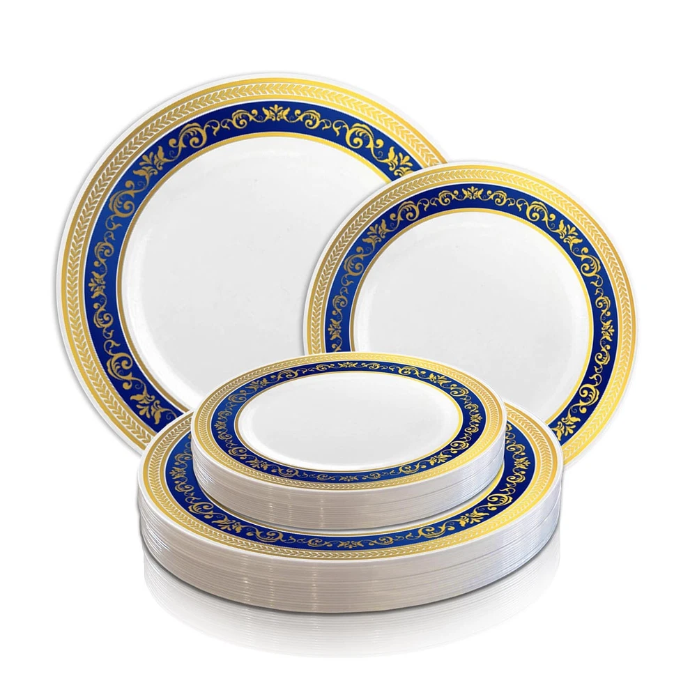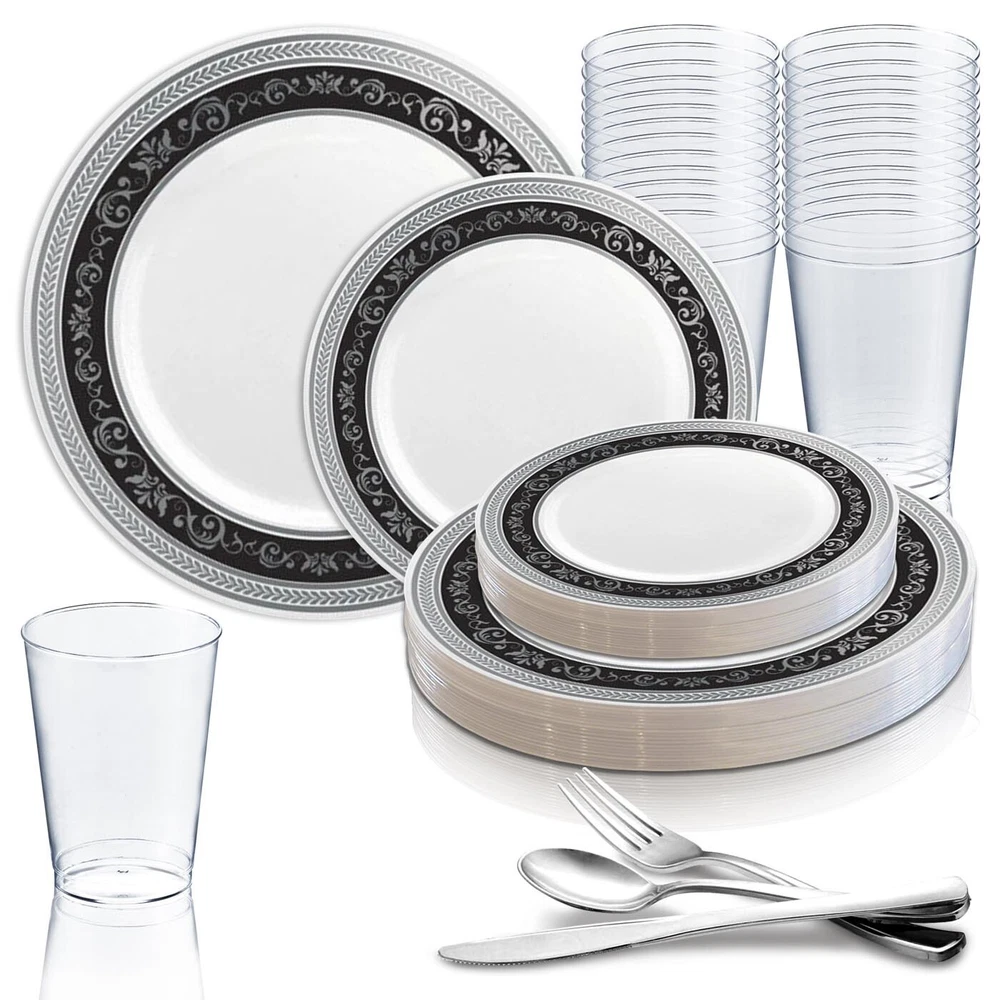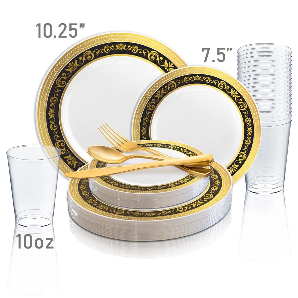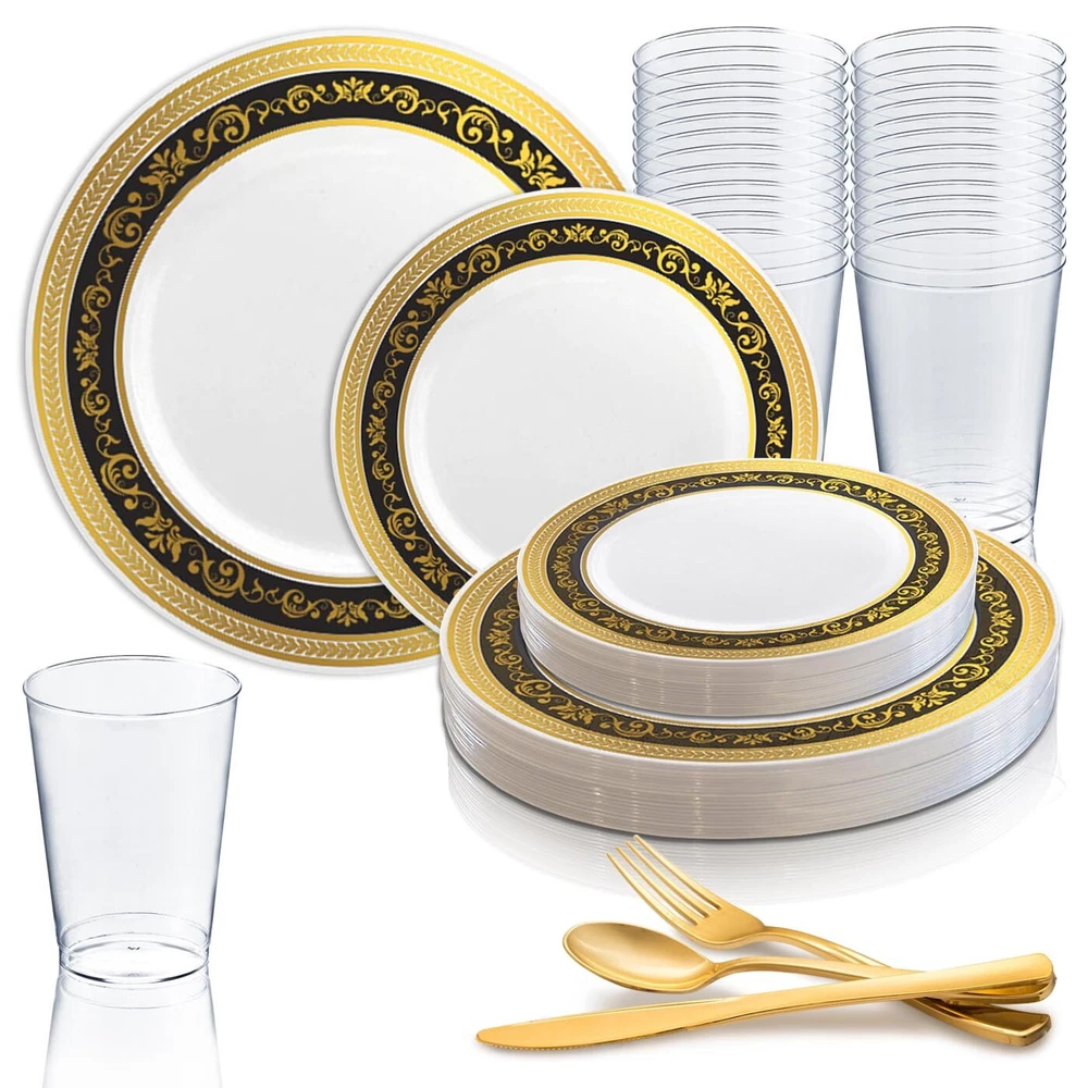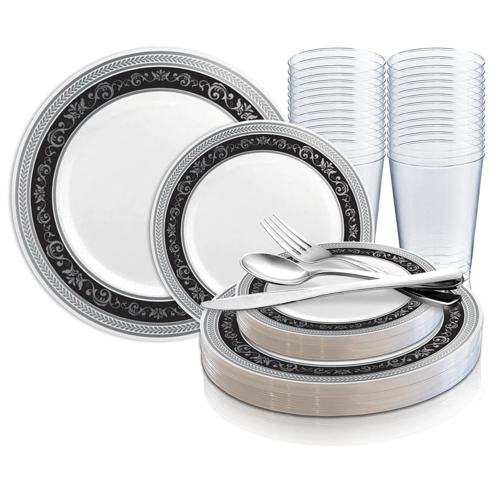 Disposable Plastic Dinnerware Set Wedding Party Package Elegant Royal Plates Item Details Smarty Had a Party The Elegant Smarty Had a Party Smarty Had a Party party package sets your table to perfection with its exquisite and classic elegant presentation. Smarty Had a Party party settings transform every meal into an occasion by ensuring all the convenience of plastic. Our products are uniquely designed and utilized by acclaimed chefs and party planners sparing the extra expenses of an event planner. They are designed for all occasions and events such as, Banquets, Weddings, Engagements, Birthdays, Parties, Baby Showers, Upscale Catering and Home Dinners. Smarty Had a Party Royal Round 10.25" Dinner Plates and 7.5" Salad/Dessert Plates. The rippled design offers a comfortable strong grip. The wide rim of these plates provide easy handling and prevents any unwanted accidental spills or stains. Smarty Had a Party Plastic Silverware. Our disposable high quality plastic gold/silver silverware are delicate in appearance but are heavy weight, durable and don't break easily. Smarty Had a Party Disposable Round Hard Plastic Cups. These cups are 10oz, Heavy Weight, Hard Durable Plastic, making them perfect for parties. HIGH-END & DURABLE . This premium dinnerware party package is uniquely designed and used by acclaimed chefs and party planners. The plastic plates, cups and cutlery included in this package are all made of high quality and durable heavy plastic. They are BPA-free and safe to use. DISPOSABLE & RECYCLABLE . No need to sacrifice elegance for budget and safety. With these disposable plastic plates, cups and flatware, you don't need to worry of rental fees, broken dishes or long hours of cleaning. This plastic dinnerware set is disposable making your parties safe and hassle-free. PERFECT SIZE & QUANTITY . Worry no more of running out of dinnerware, flatware and tumblers at your next party or upscale event. Smarty Had a Party offers you a perfect Dinnerware Party Package for 60 or even 120 Guests! This package includes 10.25" Dinner Plates, 7.5" Salad/Dessert Plates, Forks, Spoons, Knives and 10oz Round Tumblers. DESIGNED FOR ALL EVENTS & OCCASIONS . When it comes to any celebration, we want only the best for our guests. With this Deluxe Dinnerware Set, you can easily add a touch of elegance to any party. They're perfect for Banquets, Anniversaries, Weddings, Engagements, Birthdays, Baby Showers, Housewarming & Thanksgiving Parties. They are also ideal for Holiday Events, Corporate Gathering, Upscale Catering and Home Dinner. About the Seller Smarty Had a Party is a leading manufacturer designer, distributor and wholesaler of the highest quality plastic party supplies. Smarty Had a Party is a family owned business that takes enormous pride providing world class customer service. As an internationally renowned special event supplies company, Smarty Had a Party carries an extensive selection of top of the line plastic plates, dishes, bowls, cutlery, cups and glasses. Smarty Had a Party's philosophy is to maintain an eye towards future trends in the event planning industry. Payment We accept payment by any of the following methods: Immediate payment is preferred in all transactions. Shipping FREE Priority Shipping on all orders! Your order will be dispatched within 1 working day of receiving payment (Monday-Friday). In the very unlikely event that your item is lost/damaged during post, then WE are responsible and will issue either a full refund or replacement. Returns If you are not 100% satisfied with your purchase, you can return the product and get a full refund or exchange the product for another one, be it similar or not. You can return a product for up to 30 days from the date you purchased it. Any product you return must be in the same condition you received it and in the original packaging.