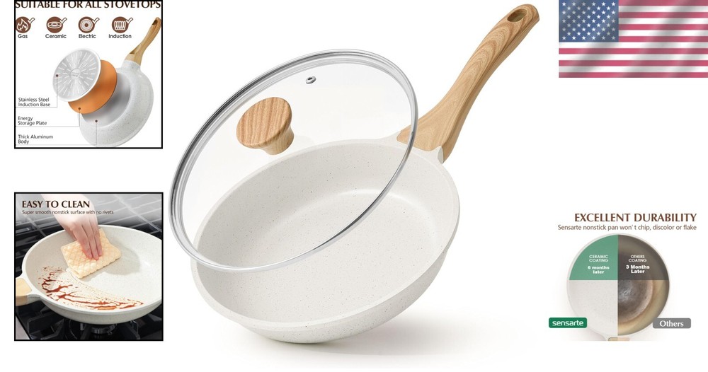 Elegant Nonstick Ceramic Frying Pan with Comfortable Grip Handle - 8-12.5” Sizes ‹ › ‹ › ‹ › ‹ › ‹ › ‹ › ‹ › ‹ › ‹ › ‹ › ‹ › Elegant Nonstick Ceramic Frying Pan Available in 8-12.5” Sizes Features: Healthy Ceramic Skillet: Crafted with a natural ceramic coating, free from harmful substances like PFOA, PTFE, PFAS, lead, and cadmium. Enjoy safe and healthy cooking without any toxic fumes. Super Nonstick Surface: Experience cooking like never before; pancakes slide effortlessly from the pan, requiring less oil for healthier meals. Induction Compatible: Constructed from heavy-duty cast aluminum, this frying pan resists warping and is suitable for all stovetops, including induction, ensuring even heating. Heat Resistant Handle: The bakelite handle, designed with a stylish wood grain finish, provides a comfortable grip while remaining cool to the touch during cooking. Tempered Glass Lid: Keep oil splatters at bay and maintain a clean stovetop with the included lid that allows for easy monitoring of your culinary creations. Ease of Cleaning: The nonstick surface and no rivets design ensure fuss-free cleaning. Rinse with warm water, a tiny amount of soap, or place it in the dishwasher for added convenience. Benefits: Promotes healthy cooking by eliminating the need for harmful coatings. Makes cooking enjoyable and easy, elevating your culinary experience. Quick and even heating on all stovetops for consistent results. Stylish design contributes to your kitchen aesthetics. Simple cleanup saves you time, allowing more moments to savor your creations. Why Choose Our Nonstick Ceramic Frying Pan? Upgrade your kitchen essentials with the Elegant Nonstick Ceramic Frying Pan—a perfect blend of health and elegance. Designed for the discerning cook, this skillet promises a seamless cooking experience with its nonstick capability and safe materials. Whether you’re flipping pancakes, sautéing vegetables, or crafting your next gourmet dish, this pan ensures you do it with grace and ease. Reimagine your cooking journey—make the intelligent choice today and add our Stylish Nonstick Ceramic Frying Pan to your kitchen collection! Shipping Free & Fast Shipping - We offer free shipping to most of the USA with a normal delivery time of 3-7 days. However, due to the current situation, additional delivery time (up to 3 weeks) may be required for some items. Alternative Carriers - We may use alternative carriers (e.g. USPS, FedEx, UPS, etc.) to ensure your package arrives safely and on time. Due to the use of multiple carriers, we are unable to provide a tracking number automatically. Handling Time - Orders are processed and shipped within 1-2 business days of receiving cleared payment. Shipping Restrictions - Shipping to Alaska, Hawaii, Puerto Rico, Guam, and other US territories may incur shipping charges or delivery restrictions. Please contact us before ordering, or your order can be refunded/cancelled. State Restrictions - There may be restrictions based on your state of purchase. For example, certain items may not be shipped to California due to state regulations. Contact for Tracking Updates - If you require tracking updates or have any concerns about the delivery of your order, please feel free to contact us, and we will be happy to assist you. Return 30-Day Hassle-Free Returns - We want you to be completely satisfied with your purchase. If you are not, you can return the item within 30 days of receiving it for a full refund or exchange. Easy Return Process - To start a return, simply contact us and we will provide you with a prepaid return shipping label and detailed instructions. Restocking Fee - There are no restocking fees for returns. However, the buyer is responsible for return shipping costs if the return is not due to a seller's error. Refund Processing Time - Refunds will be processed within 5 business days of receiving the returned item in its condition. Payment We accept all major credit cards, PayPal, and Apple Pay for your convenience. Your payment information is secure and encrypted to ensure a safe and seamless transaction. Please complete your payment within 3 days of purchase to avoid any delays in shipping. Feedback Your feedback is extremely important to us. We strive to provide the best products and customer service possible. If you are satisfied with your purchase, please take a moment to leave us a positive review. If you have any concerns or issues with your order, please contact us before leaving negative feedback. We are committed to resolving any problems and ensuring your satisfaction. Contact Us If you have any questions or concerns, please feel free to out to our customer support team. You can contact us through the eBay messaging system. We are available Monday to Friday, 9:00 am to 5:00 pm EST, and we will do our best to respond to your inquiry within 24 hours. Buy it now and enjoy a pleasant shopping experience! Unit Quantity: 2 lb Stove Type Compatibility: Electric,Gas,Induction Set Includes: Frying Pan,Lid,Tempered Glass Lid Material: Aluminum,Ceramic Features: Dishwasher Safe,Easy to Clean,Non-Stick,With Lid Type of Oven: Electric,Gas,Induction Type: Frying Pan Surface Coating: Ceramic Item Diameter: 10 in Color: White Shape: Disc Item Depth: 2.7 in Number of Items in Set: One-Piece Heat Resistance: Up to 450°F Item Weight: 2 lb Unit Type: lb