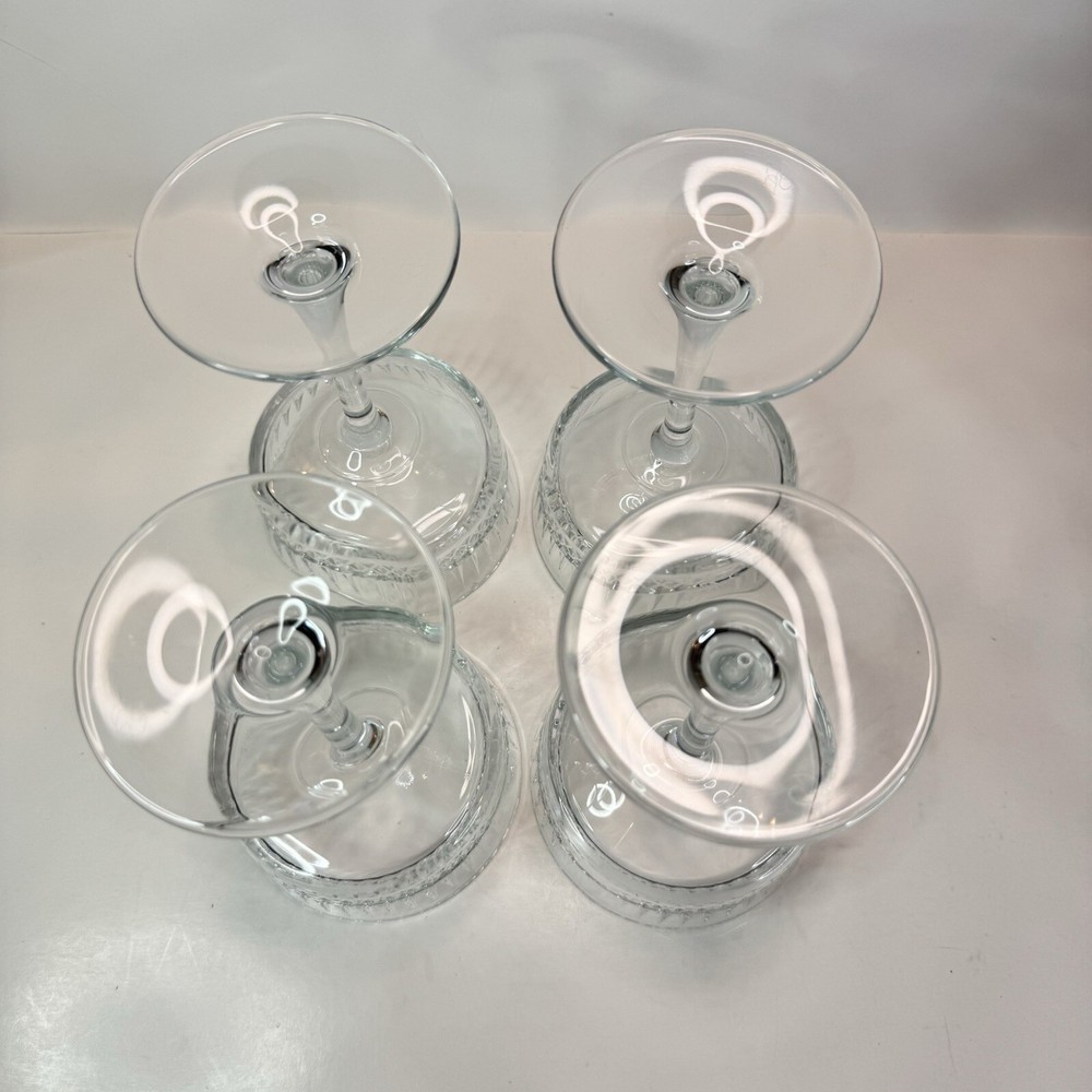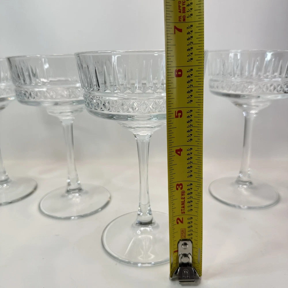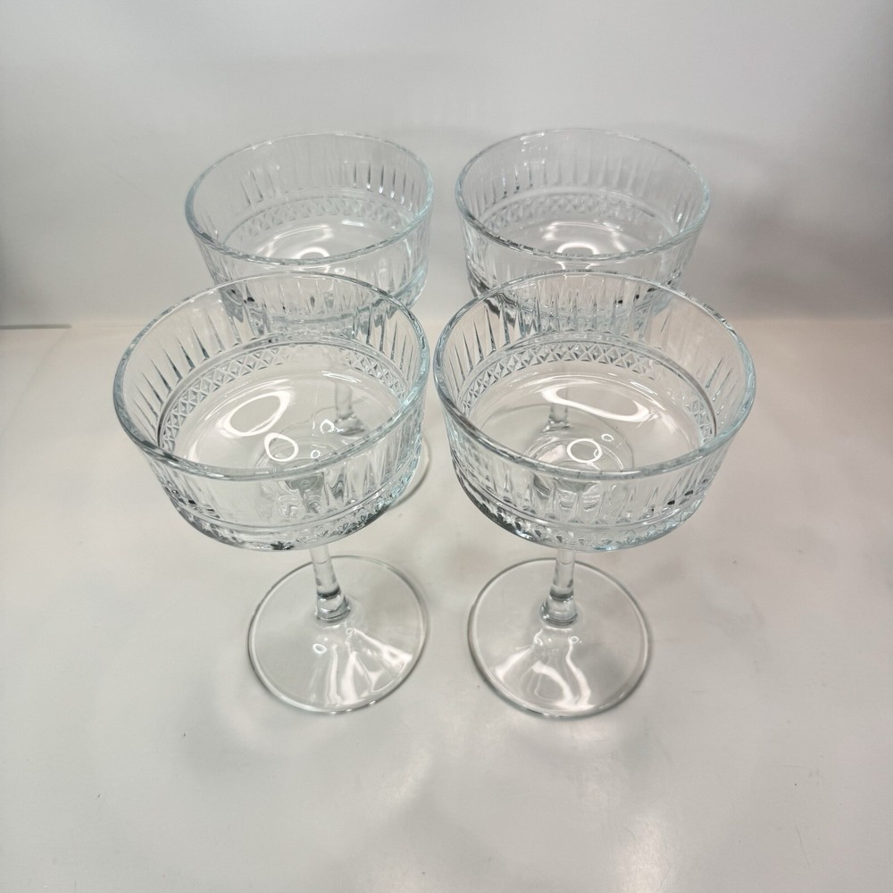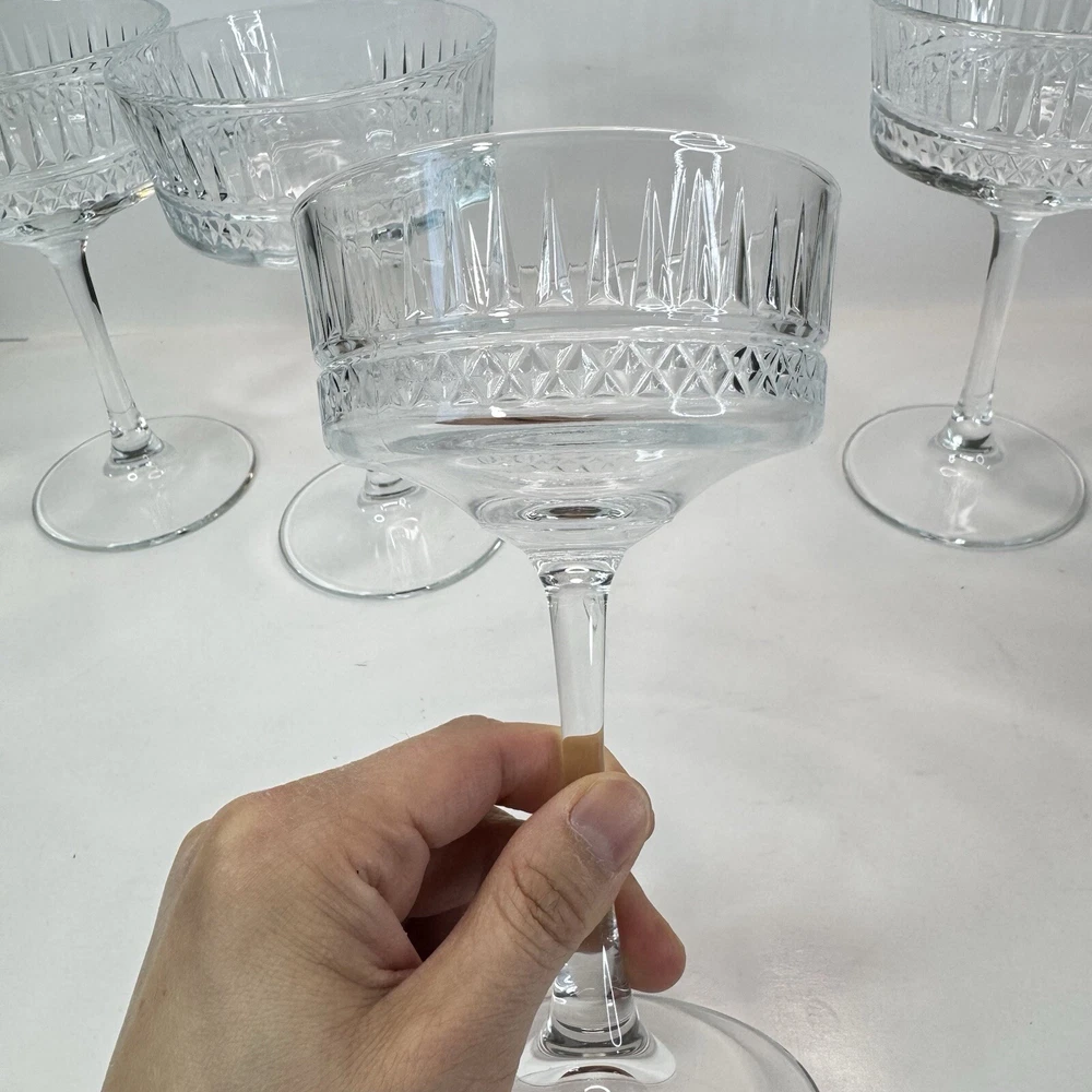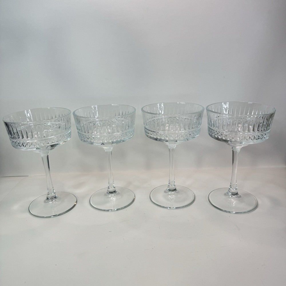 The Pasabache Elysia Champagne Cocktail Glasses Coupes set includes four pieces of elegant glassware perfect for any occasion. Made of transparent glass, the set features Martini and Champagne Flute glasses with a capacity of 225ml each, ideal for serving cocktails and champagne at parties. The glasses have a stylish design, standing at 16.5cm tall and 10 cm wide, adding a touch of sophistication to your glassware collection. Perfect for entertaining, this set of cocktail glasses by Pasabache is a must-have for anyone who loves to host gatherings. Excellent used condition. No chips or cracks.