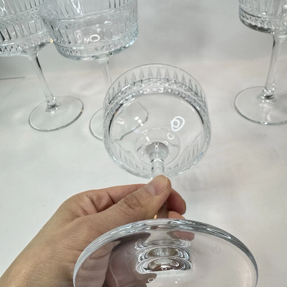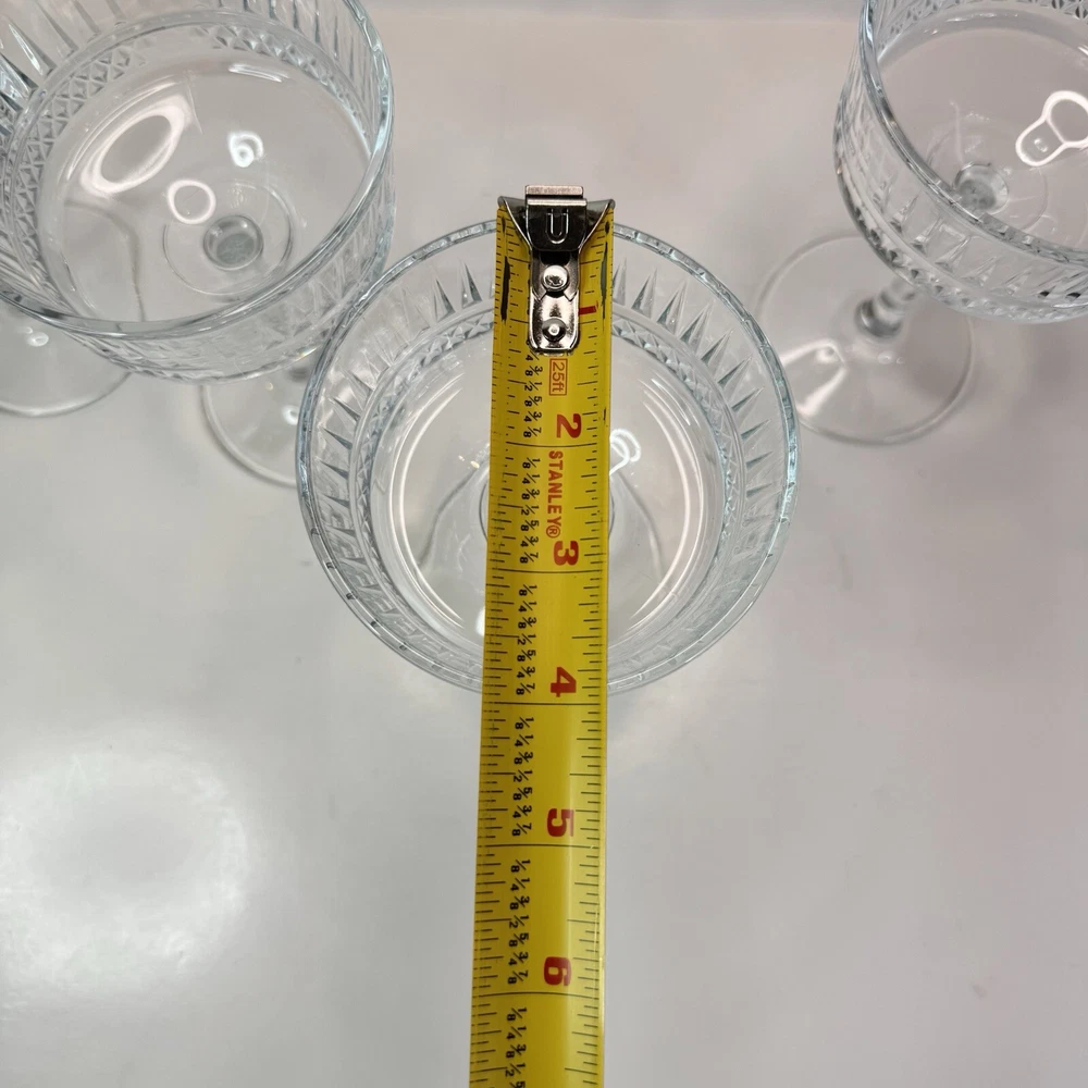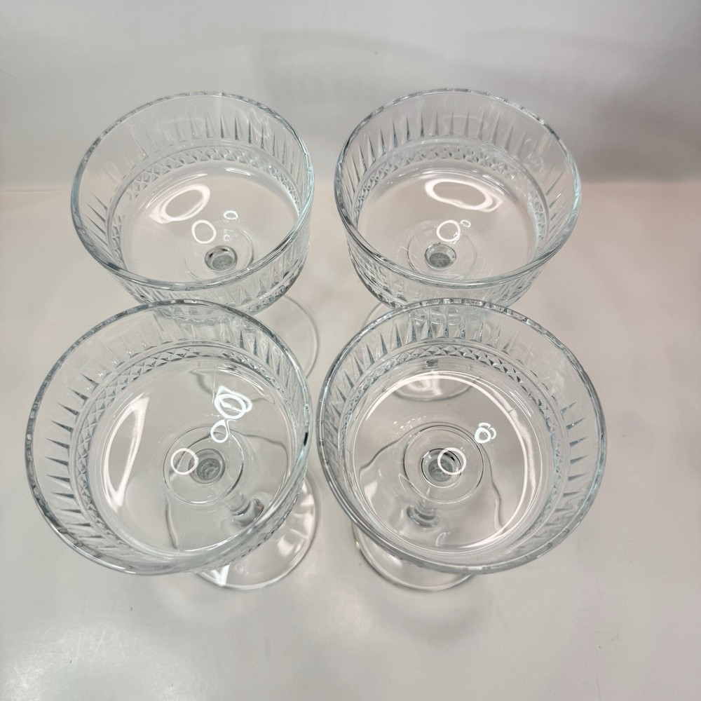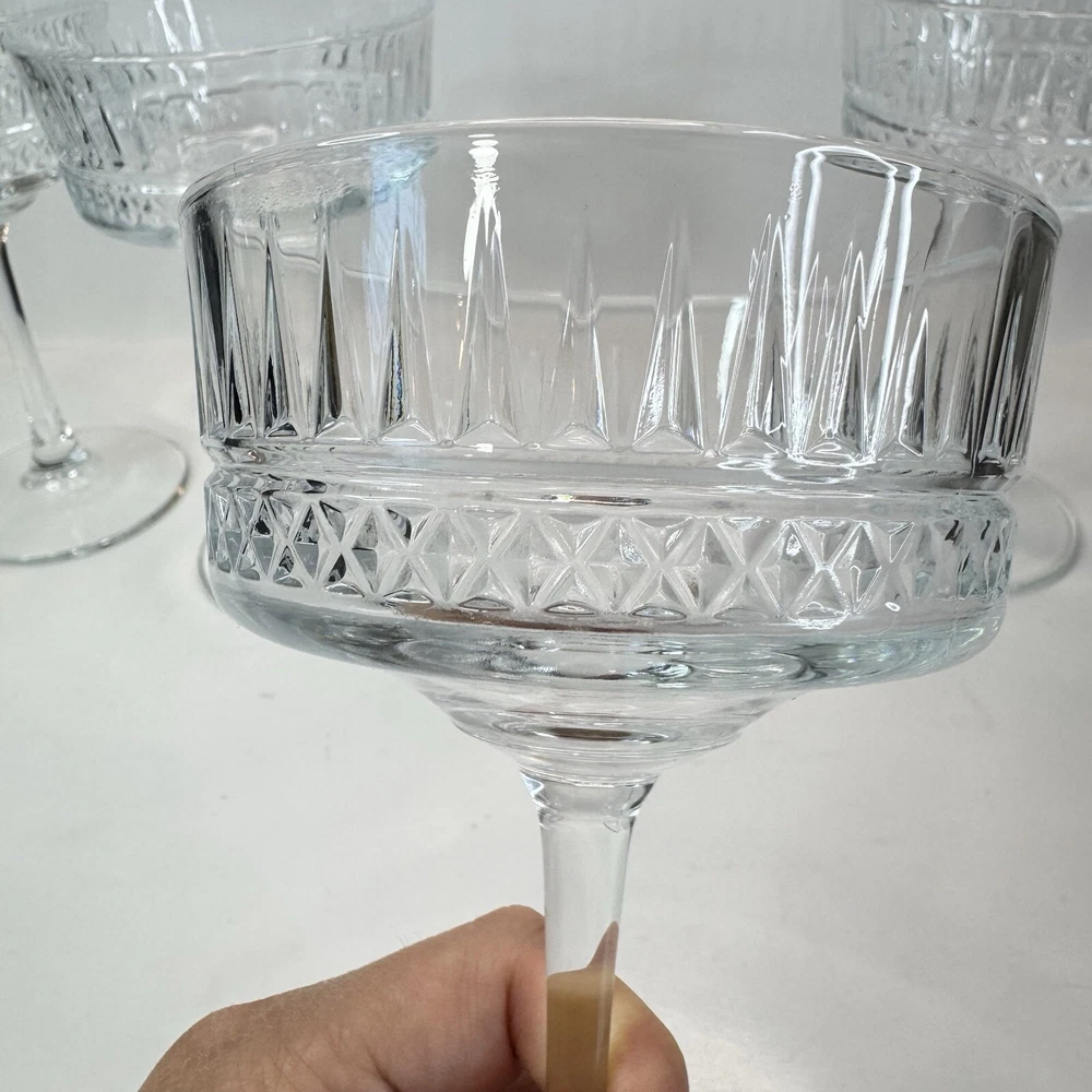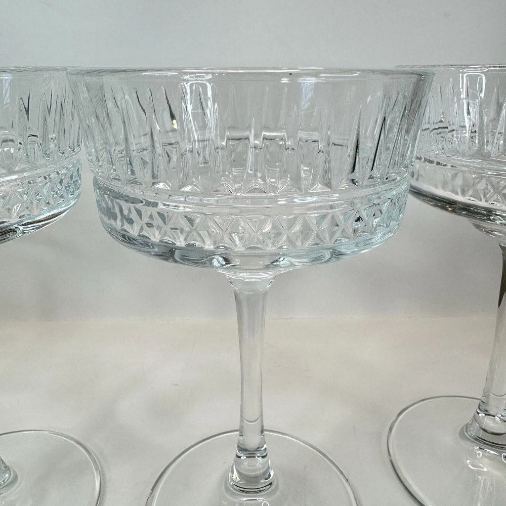 The Pasabache Elysia Champagne Cocktail Glasses Coupes set includes four pieces of elegant glassware perfect for any occasion. Made of transparent glass, the set features Martini and Champagne Flute glasses with a capacity of 225ml each, ideal for serving cocktails and champagne at parties. The glasses have a stylish design, standing at 16.5cm tall and 10 cm wide, adding a touch of sophistication to your glassware collection. Perfect for entertaining, this set of cocktail glasses by Pasabache is a must-have for anyone who loves to host gatherings. Excellent used condition. No chips or cracks.