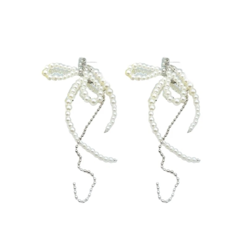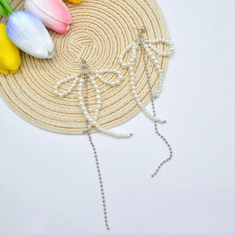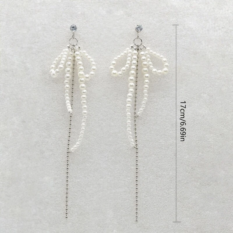 Elegant Pearl Bowknot Tassel Drop Statement Earrings Jewelry