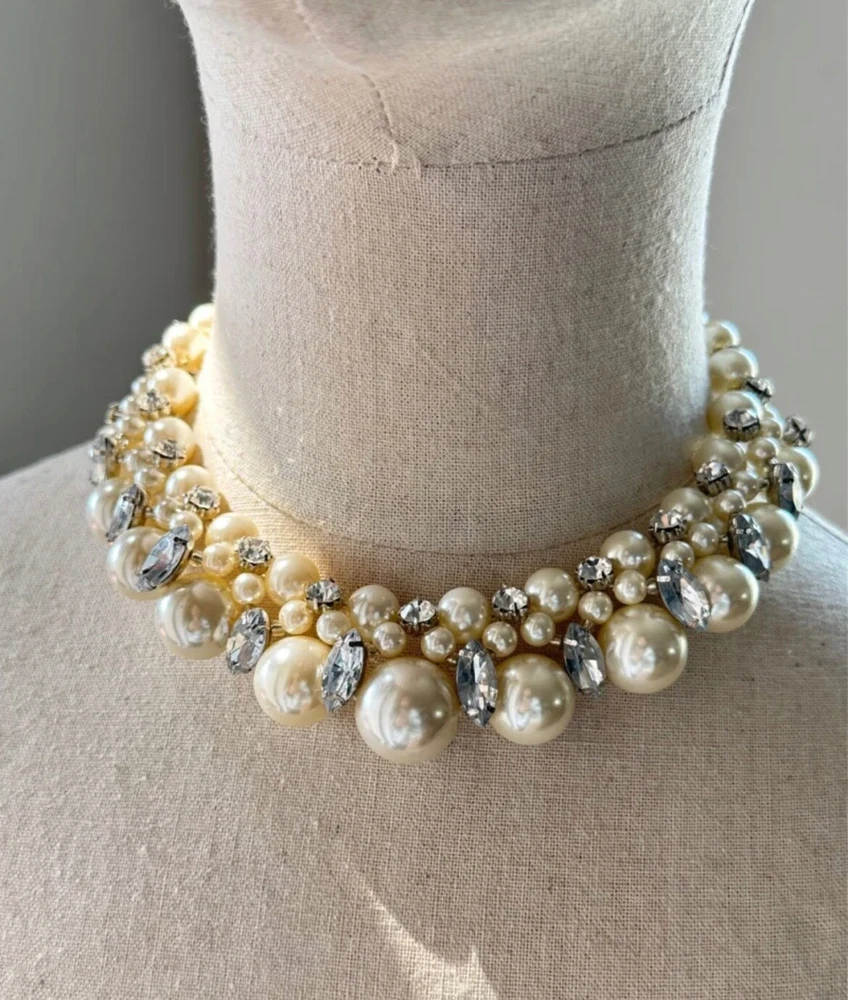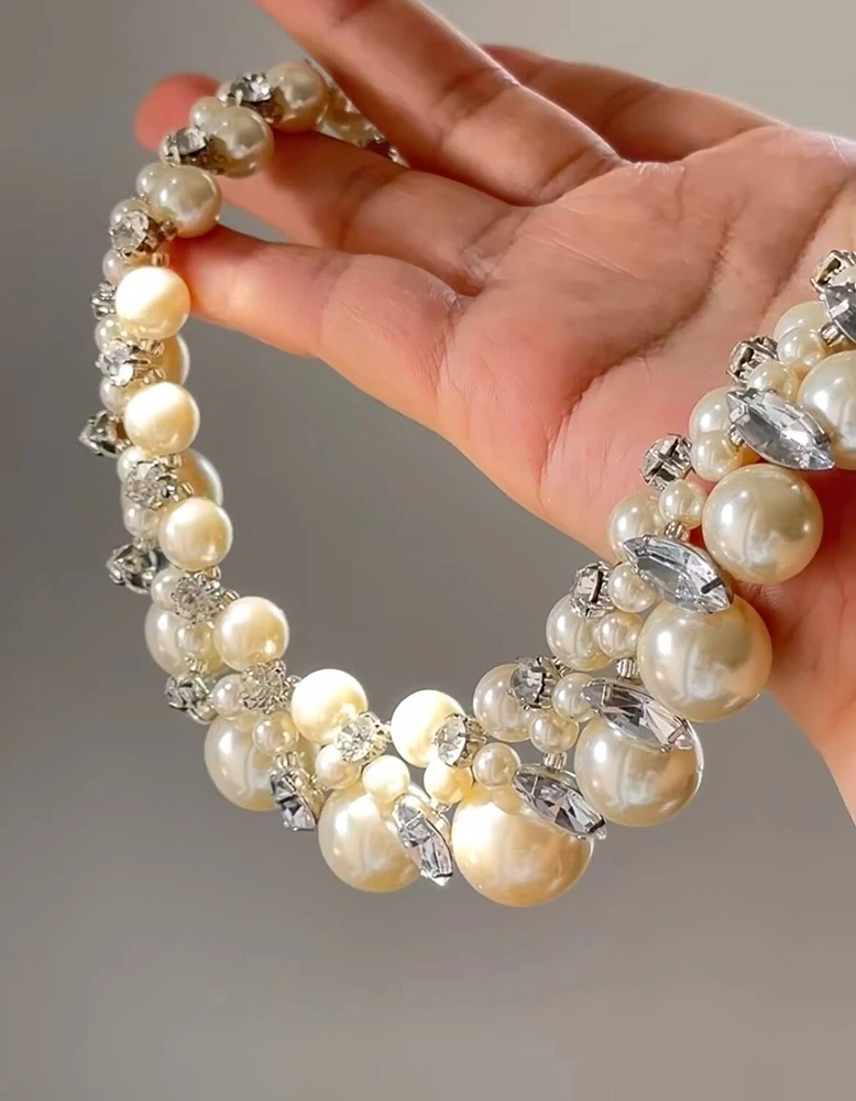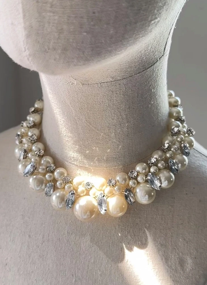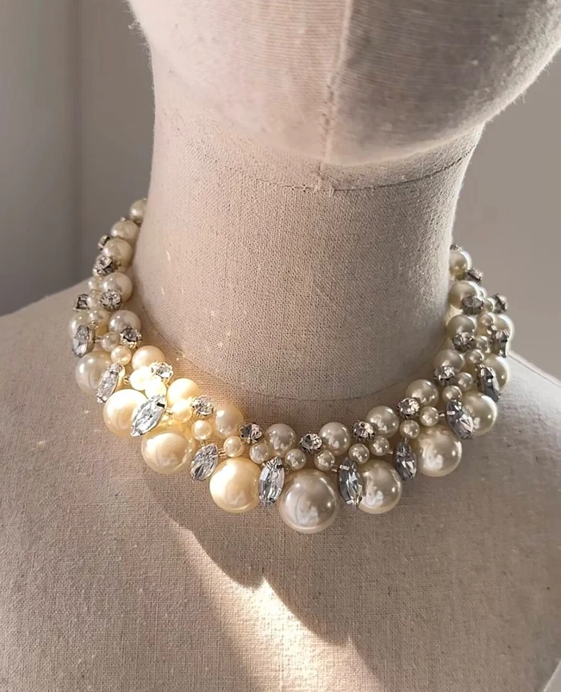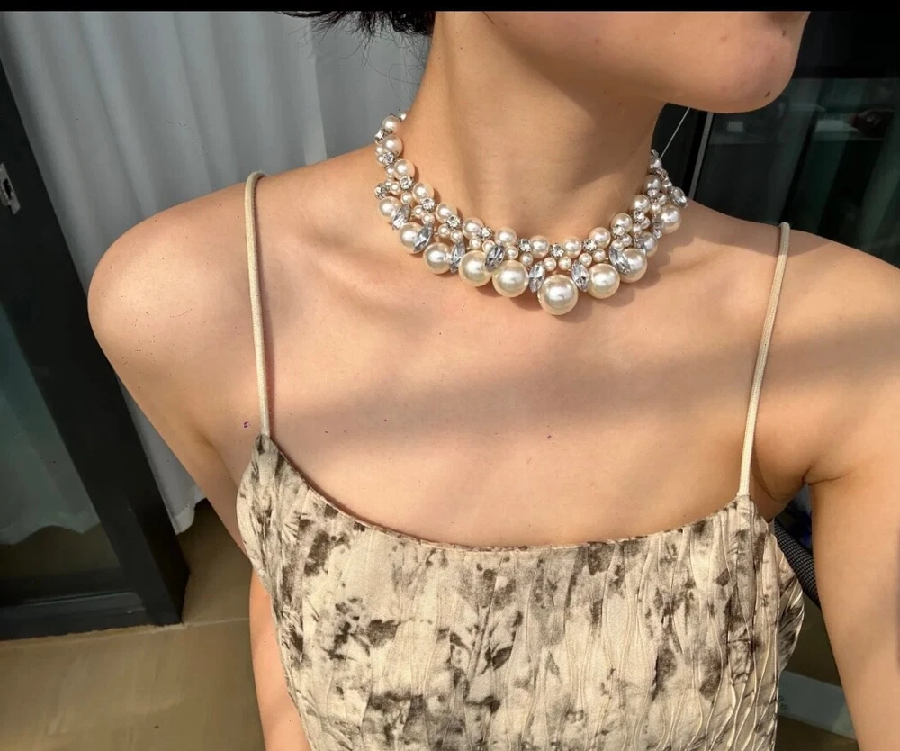 Description: Transform your style with this stunning pearl and crystal statement necklace , designed to elevate any outfit with its vintage-inspired elegance. Perfect for formal events, weddings, or a glamorous night out, this necklace combines luxurious pearls and sparkling crystals to create an unforgettable look. Features: High-Quality Pearls: A mix of large and small pearls for a sophisticated and bold appearance. Brilliant Crystals: Accentuated with sparkling crystals for added glamour. Choker Design: Sits elegantly at the neckline to create a dramatic effect. Vintage-Inspired: Perfect for those who love timeless, elegant jewelry. Why Customers Love This Necklace: π Adds a luxurious touch to both modern and classic outfits. π Ideal for brides, wedding guests, or evening wear. π A stunning gift for loved ones or a treat for yourself. See It Worn by Our Customers! (Include photos of customers wearing the necklace to showcase how it looks in real life. Ensure the photos highlight different angles and styles of wear for maximum impact.)