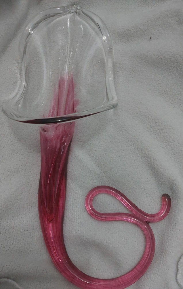 This beautiful vase is a one-of-a-kind piece from Bavin Glassworks. The unique design features a stretched lily shape, handmade with pink and clear glass using the hand blown glassmaking technique. The vase was produced in 2002 and is signed by the artist. Its impressive size of approximately 16 inches at its longest, and about 6 inches wide really catches the eye. There is a small water reservoir for water/flowers. The lily subject is perfect for collectors who appreciate decorative items, and the vase is a great addition to any collection. This piece is perfect for display in any room of your home and will be a conversation starter for sure. Don't miss out on the opportunity to own this stunning handmade glass vase from Bavin Glassworks. No chips or cracks. Experienced glass shipper. Thank you for looking!