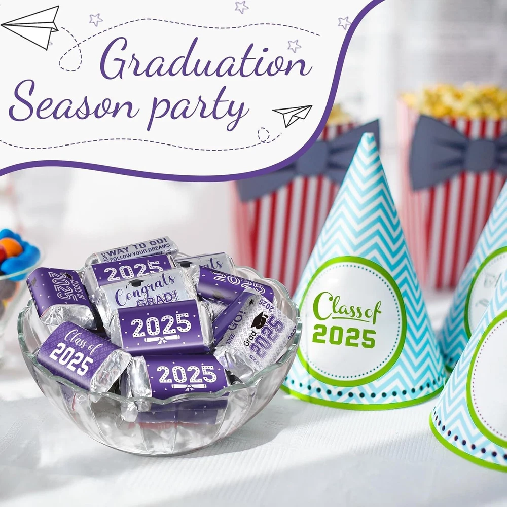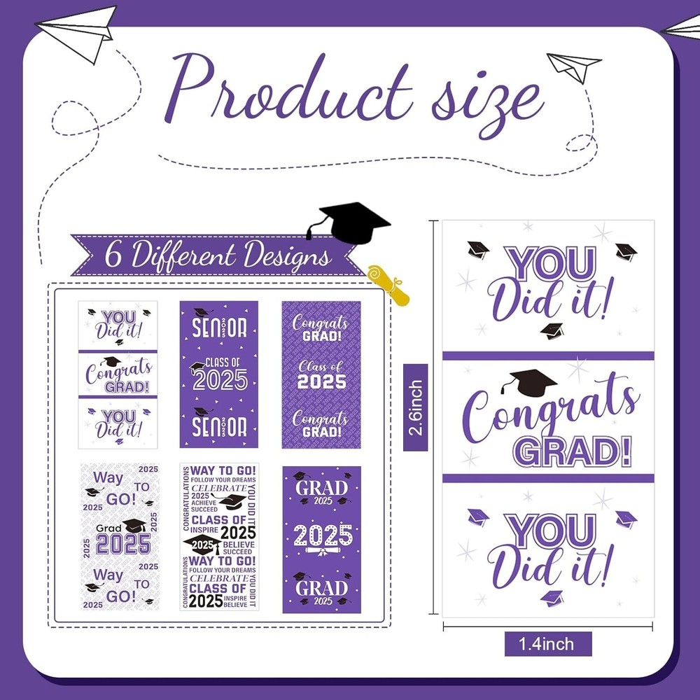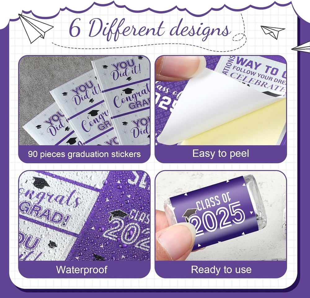 Elegant Purple & White Graduation Sticker Decorations - 90 Mini Candy Wrappers ‹ › ‹ › ‹ › ‹ › ‹ › ‹ › ‹ › ‹ › ‹ › ‹ › ‹ › Elegant Purple & White Graduation Sticker Decorations Transform your graduation celebration with our exquisite 90 Mini Candy Wrappers , intricately designed to embody the spirit of achievement and joy. Key Features: Classic Graduation Elements: Adorned with inspiring phrases like "You Did It!" and "Way to Go!", these shiny metallic wrappers add a touch of elegance and nostalgia to your event. Thoughtful & Safe: Crafted from high-quality shiny adhesive paper, these stickers are both safe and reliable. They adhere effortlessly and peel away without leaving unsightly residue, ensuring a seamless decorating experience. Perfect Size: Each mini candy bar wrapper measures approximately 2.6 x 1.4 inches, making them an ideal fit for wrapping candy bars or enhancing chocolate treats. Their versatile size allows you to personalize not just candy but also cards, gifts, and more. Abundant Content: With a total of 90 pieces, each adorned with various festive graduation motifs, these wrappers will instantly captivate your guests, ensuring a visual feast at your celebration. Versatile Applications: Use these delightful stickers to decorate everything from chocolate and graduation gifts to ceremony invitations, envelopes, greeting cards, and even packaged desserts and cookies. Application Instructions: Applying these charming stickers is simple: Clean the surface where you want to place the sticker. Carefully tear off the graduation sticker, avoiding large areas of contact with the back. Position it accurately and press gently to secure it in place. Specifications: Material: Adhesive paper Color: Elegant purple and white Size: Approx. 2.6 x 1.4 inches Package Includes: 90 x Graduation decoration label stickers Elevate your graduation celebrations with these stunning sticker decorations. They’re not just stickers; they’re a way to showcase your pride and joy. Order today and create lasting memories that shine as brightly as your accomplishments! Shipping Free & Fast Shipping - We offer free shipping to most of the USA with a normal delivery time of 3-7 days. However, due to the current situation, additional delivery time (up to 3 weeks) may be required for some items. Alternative Carriers - We may use alternative carriers (e.g. USPS, FedEx, UPS, etc.) to ensure your package arrives safely and on time. Due to the use of multiple carriers, we are unable to provide a tracking number automatically. Handling Time - Orders are processed and shipped within 1-2 business days of receiving cleared payment. Shipping Restrictions - Shipping to Alaska, Hawaii, Puerto Rico, Guam, and other US territories may incur shipping charges or delivery restrictions. Please contact us before ordering, or your order can be refunded/cancelled. State Restrictions - There may be restrictions based on your state of purchase. For example, certain items may not be shipped to California due to state regulations. Contact for Tracking Updates - If you require tracking updates or have any concerns about the delivery of your order, please feel free to contact us, and we will be happy to assist you. Return 30-Day Hassle-Free Returns - We want you to be completely satisfied with your purchase. If you are not, you can return the item within 30 days of receiving it for a full refund or exchange. Easy Return Process - To start a return, simply contact us and we will provide you with a prepaid return shipping label and detailed instructions. Restocking Fee - There are no restocking fees for returns. However, the buyer is responsible for return shipping costs if the return is not due to a seller's error. Refund Processing Time - Refunds will be processed within 5 business days of receiving the returned item in its condition. Payment We accept all major credit cards, PayPal, and Apple Pay for your convenience. Your payment information is secure and encrypted to ensure a safe and seamless transaction. Please complete your payment within 3 days of purchase to avoid any delays in shipping. Feedback Your feedback is extremely important to us. We strive to provide the best products and customer service possible. If you are satisfied with your purchase, please take a moment to leave us a positive review. If you have any concerns or issues with your order, please contact us before leaving negative feedback. We are committed to resolving any problems and ensuring your satisfaction. Contact Us If you have any questions or concerns, please feel free to out to our customer support team. You can contact us through the eBay messaging system. We are available Monday to Friday, 9:00 am to 5:00 pm EST, and we will do our best to respond to your inquiry within 24 hours. Buy it now and enjoy a pleasant shopping experience! Unit Quantity: 90 Character: Graduation Party Decorations Material: Paper,adhesive paper Type: Sticker Occasion: Graduation Color: Purple Theme: Candy Department: Kids Pattern: Letter Style: Purple and White 2023 Unit Type: oz