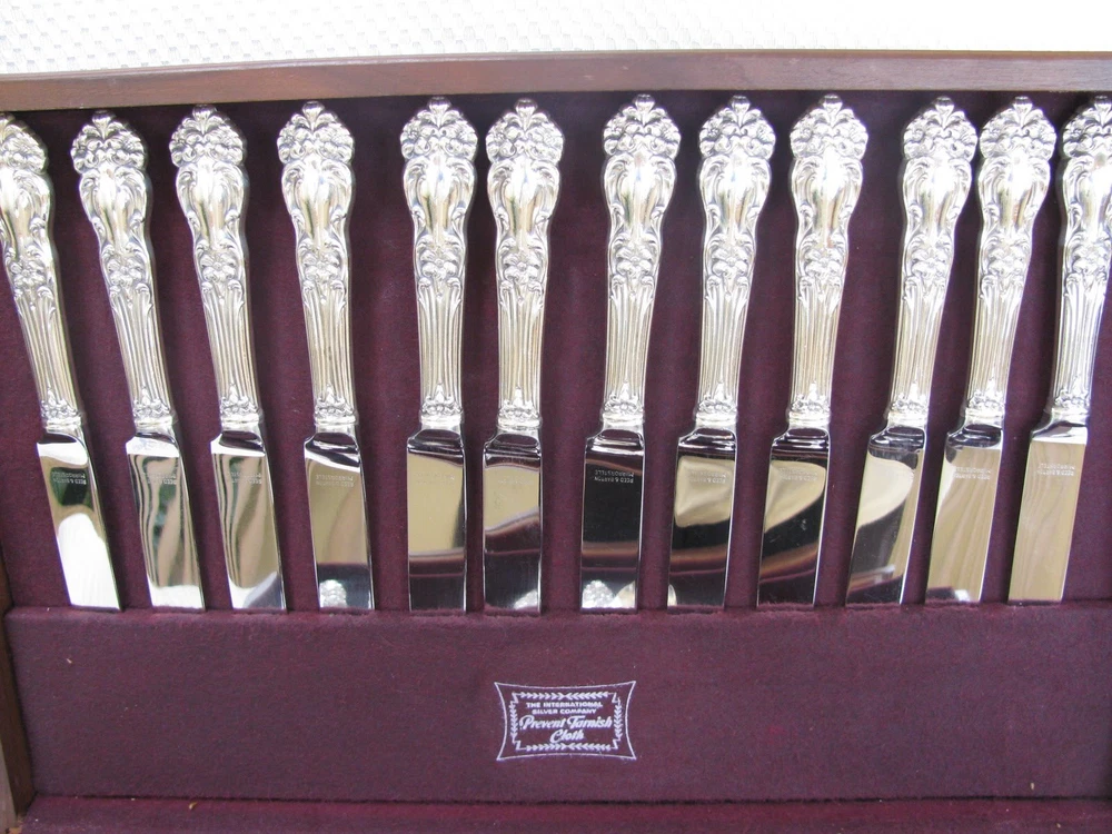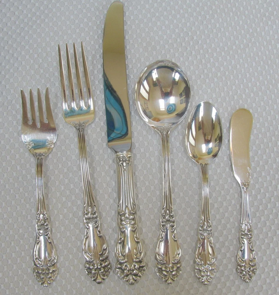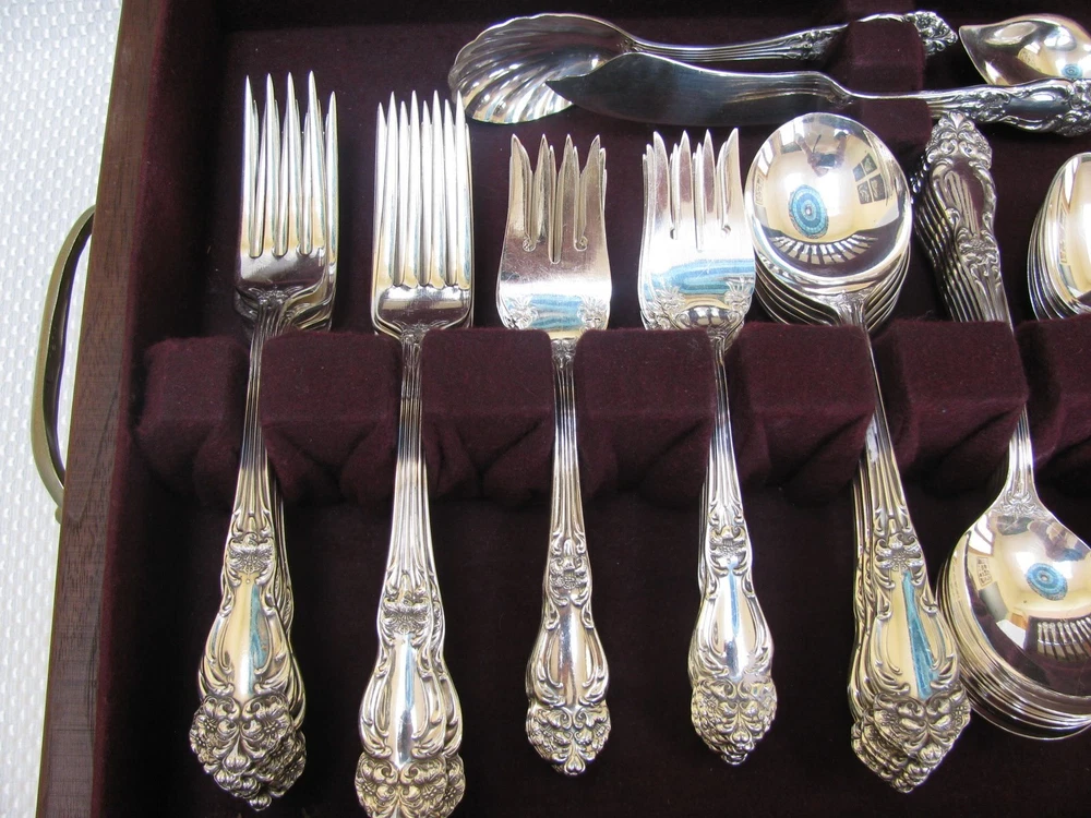 Offered for your consideration is an elegant set of vintage Reed & Barton silverplate flatware in the Tiger Lily or Festivity pattern. This pattern was originally introduced in 1901 as Tiger Lily and then reintroduced in 1945 as Festivity. Included are: 12 dinner knives 9 ½” 12 dinner forks 7 ½” 12 salad or dessert forks 6 ½” 12 round cream soup spoons 7” 24 teaspoons 5 ¾” 12 individual butter knives 5 ¾” 1 pastry server 9 ¾” 1 cold meat fork 8 ½” 1 casserole spoon 8 7/8” 2 solid serving spoons 8 1/8” 1 tomato server 7 ¾” 1 jelly spoon 6” 1 master butter knife 7” 1 sugar spoon 6” Wooden chest The flatware is stamped on the back, “Reed & Barton.” Each piece is in near mint condition. All pieces were carefully hand polished and are ready for your use. The chest is not original to the set, but will serve to keep your flatware safely. Please feel free to ask questions before you buy. This item will be shipped UPS Mail. It will be shipped within 24 hours after payment has been received. dewabit