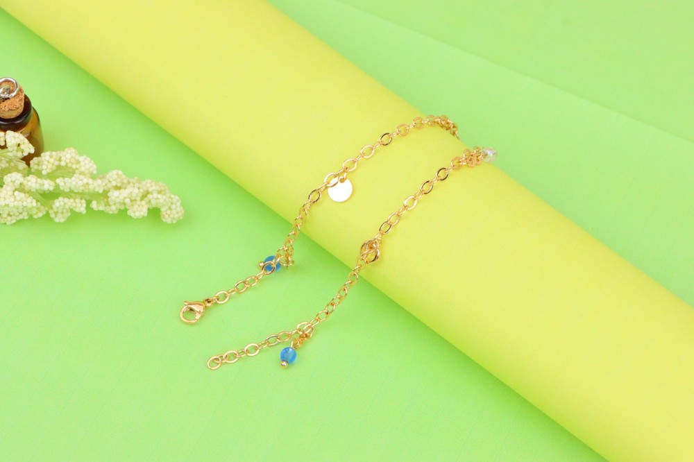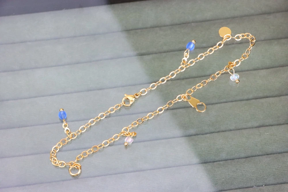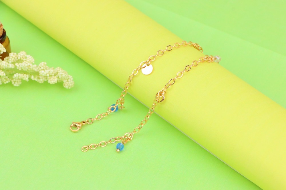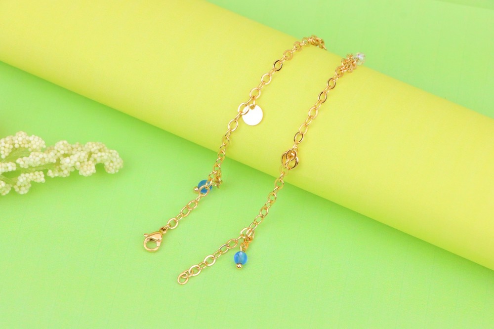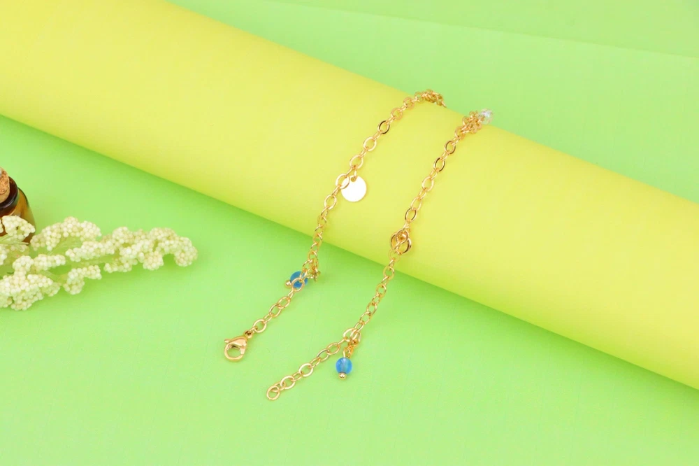 *** Non-Tarnish -- Includes 1-Year No-Tarnish Guarantee *** Chic and Minimal Rose gold anklet featuring dainty blue and white bead charms. ✔ Gold plated over high quality brass ✔ Delicate charm detailing with pearls and blue beads ✔ Lightweight and comfortable for daily wear ✔ Lobster clasp for secure closure ✔ Anklet length: 25 cm (approx. 9.84 inches) ✔ A perfect accessory to enhance any casual or festive look
