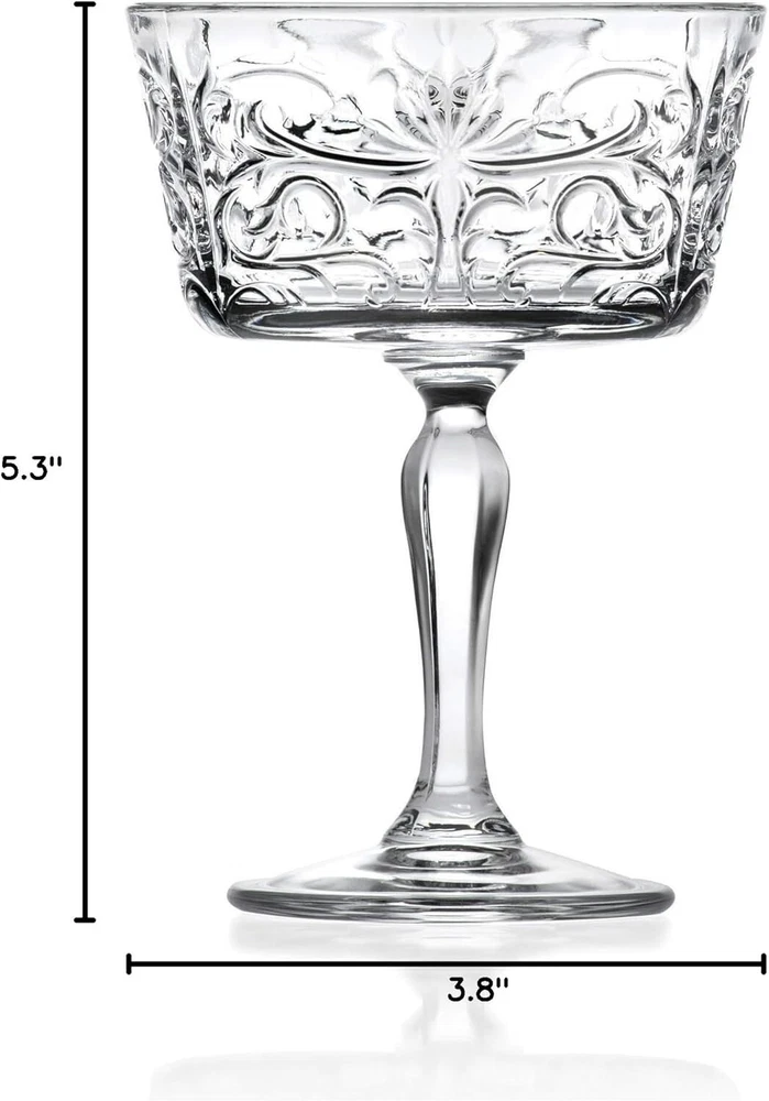 Champagne Glasses - Flute - Saucer - Belle Coupe - Set of 6 Glasses - Glass Crystal - Glass has Tattoo Design -9 oz Made in Europe Superb lead free crystal for outstanding clarity Set of 6 in pretty box " H x " D Dishwasher safe for added convenience Makes a perfect gift for someone that appreciates quality, or for personal use. Inc. has been the leader in the crystal and glass industry for over two decades. Our sterling reputation of providing the consumer with the highest quality merchandise with the most cost effective pricing has been ongoing. This set of 6 Flute glasses are a part of the Tabletop Collection that has been an all time favorite. Artistically designed to coordinate beautifully with any tabletop decor. Rest assured this set will make a statement of elegance, thereby changing the ambiance from the simplest affair to an upscale event.