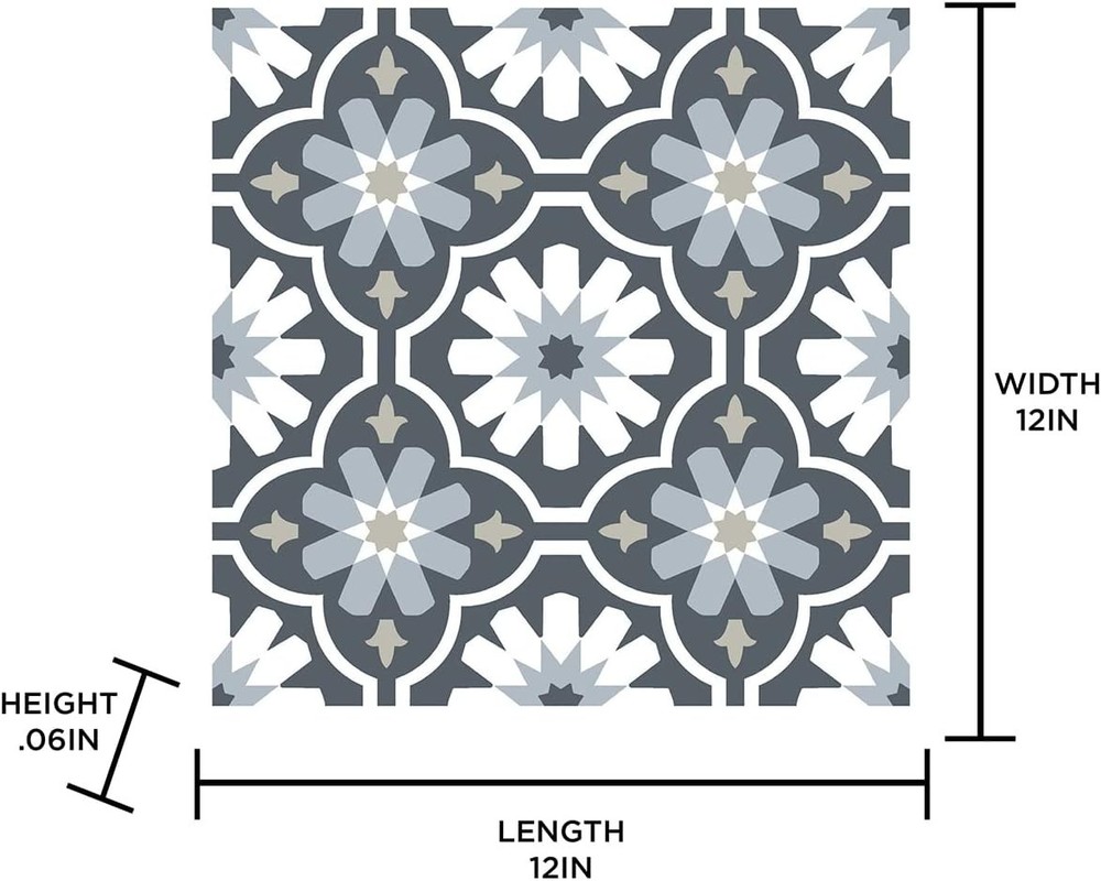 Edge Type: Squared Shape: Square Item Type Name: Vinyl Features: Water Resistant, Easy to Install, Textured, Low Lustre Finish, Permanent Adhesive Brand: Unbranded Finish Types: Semi-gloss Tile Surface Texture: Smooth PEI Rating: 0 - No Foot Traffic Global Trade Identification Number: 00091212327313 Coverage per Case: 10 ft² Tile Look: Patterned UPC: Does Not Apply Size: 60"l X 24"w X 0.06"t Recommended Uses For Product: Floor Item Thickness: 0.06 inches Water Resistance Level: Water Resistant Tile Shape: Square Style: Patterned Finish: Semi-Gloss Grade: Grade 1 Included Components: Peel And Stick Floor Tiles Material Type: Vinyl Installation: Peel-and-Stick Item Height: 0.06 Inches Coverage: 10 Sq Ft / Box Type: Floor Tile Unit Count: 10.0 Square Feet Form Factor: Tile Break Strength: 90 kg gtin13: Does Not Apply Suitable For: Floor Edge Design: Squared Number in Pack: 10 Style Name: Patterned Look Material: Vinyl Installation Method: Peel And Stick Color: Multicolor Item Dimensions L X W: 12"l X 12"w Pattern: Encaustic Series: Sevilla Item Weight: 5.5 lb Room: Kitchen, Bathroom, Living Room, Hallway, Utility/Laundry Room Additional Features: Easy To Install, Water Resistant Tile Size: 12 x 12 inches