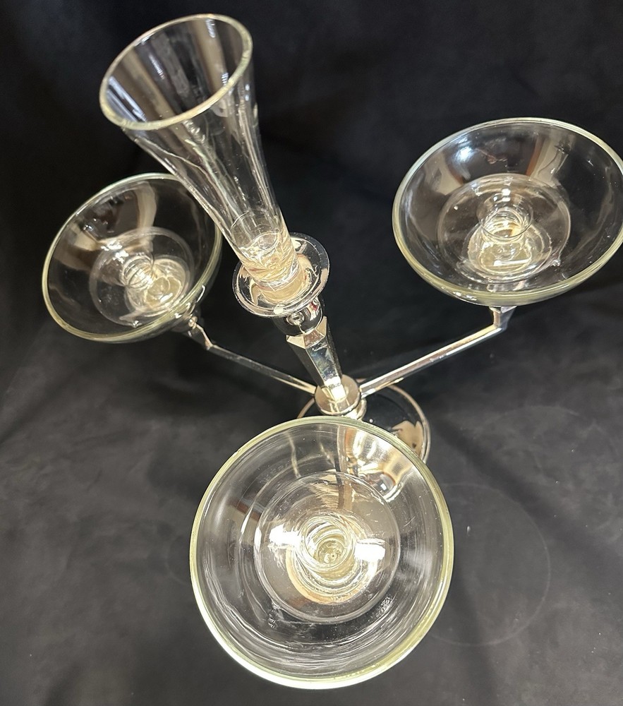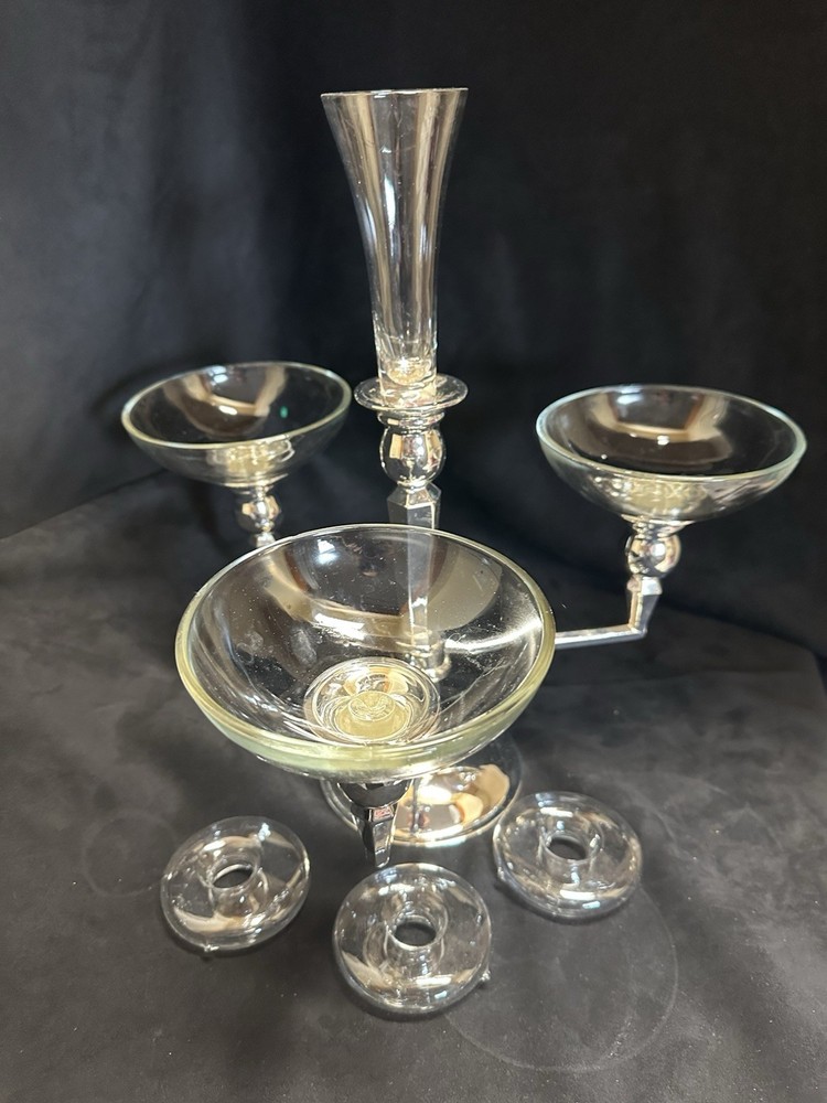 Elevate the ambiance of any room with this polished silver chrome metal candelabra, featuring a classic torch shape that exudes a vintage vibe. With a generous height of 14 inches and an item width of 13 inches, it's perfectly sized for a statement piece without overpowering your space. The sleek silver finish adds a touch of elegance, making it suitable for a variety of decor styles. Designed to accommodate four taper candles or 1 taper and 3 votives candles, this medium-sized candelabra is a versatile addition to your home. The 3 removable glass candle holders provide a subtle sparkle as they catch the light, and the free-standing mounting ensures easy placement in any room. Whether it's for a special event or everyday elegance, this unbranded candelabra is sure to impress. Great condition!