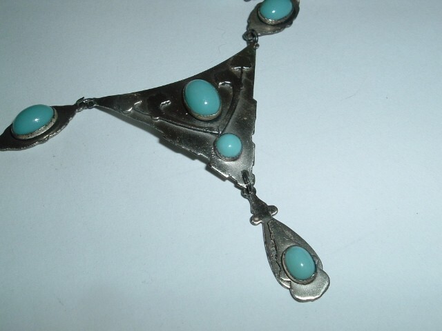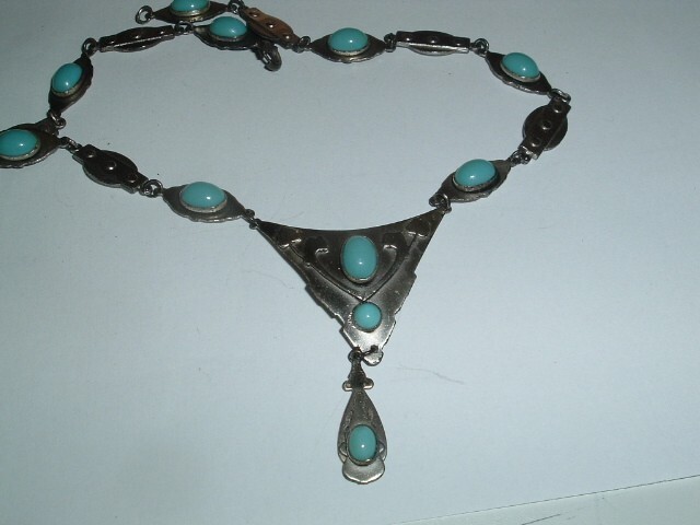 From a Chicago estate sale, an arts and crafts silver (possibly sterling) necklace with oval, bezel set, turquoise blue glass stones. Measures 16" long, beautiful on and condition is excellent, circa 1920. Seller will pay postage and postal insurance. We will ship in jeweler's gift box, perfect gift for MOTHERS DAY which is coming soon.