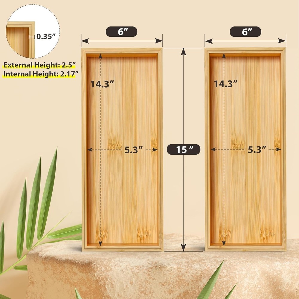 UPC: Does not apply Finish Types: Polished Material Type: Bamboo Unit Count: 2.0 Count Product Dimensions: 15"d X 12"w X 2.5"h Material: Bamboo, Engineered Wood, Plastic Special Feature: Stackable Type: Drawer Organizer Item Width: 15 in Features: Stackable, Multi-functional, Easy to Maintain Finish Type: Polished Color: Natural Bamboo Brand: Unbranded Item Height: 2.5 Inches Item Weight: 2 lbs Style: Modern Wood Tone: Natural Item Depth: 15 in Department: Unisex, Unisex Baby & Toddler, Kids, Teens, Boys, Girls Item Type Name: Toilet Paper Storage Number of Compartments: 2 Number Of Items: 2 Shape: Rectangular Item Dimensions D X W X H: 15"d X 12"w X 2.5"h gtin13: Does not apply Other Special Features Of The Product: Stackable