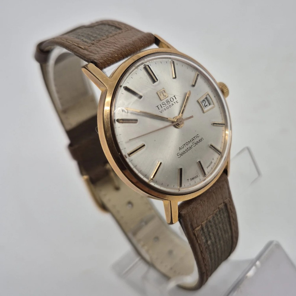 Diese Tissot Visodate Automatic "Seastar Seven" vereint ein zeitloses Design mit Schweizer Präzision. Das silberne Zifferblatt mit goldfarbenen Akzenten wird durch ein robustes Gehäuse in vergoldetem Edelstahl und ein stilvolles, braunes Lederarmband ergänzt. Ein ideales Sammlerstück für Liebhaber klassischer Uhren. Details: Marke: Tissot Artikelnummer: FES0332 Zustand: Gebraucht Material: Vergoldeter Edelstahl Herkunft: Schweiz Funktionen: Automatikwerk, Datumsanzeige Gewicht: Ca. 75 g Besondere Merkmale: Klassisches Design mit vergoldeten Akzenten Automatikwerk für zuverlässige Präzision Wasserfestes Gehäuse mit graviertem Boden