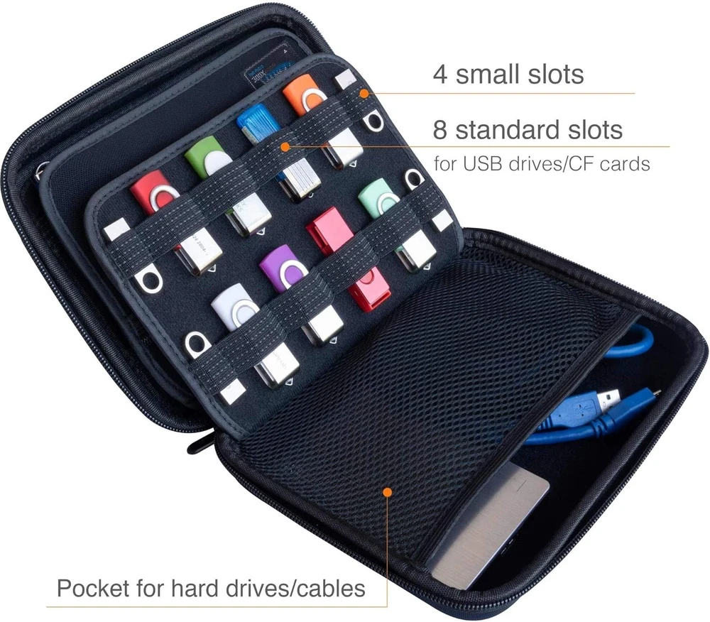 Elegant USB Thumb Drive and SD Card Holder Case - Large Capacity Black Organizer ‹ › ‹ › ‹ › ‹ › ‹ › ‹ › ‹ › ‹ › Elegant USB Thumb Drive and SD Card Holder Case Discover the perfect blend of sophistication and functionality with our Elegant USB Thumb Drive and SD Card Holder Case. Designed for the discerning individual who values organization and style, this case offers a large capacity for an array of electronic accessories. Key Features: Updated design with strong elastic bands for secure storage of memory cards, USB flash drives, batteries, and more. 26 universal slots accommodating all sizes of USB drives. 8 dedicated slots for smaller USB drives. Holds 18 SD cards or Switch game cartridges effortlessly. Two zipped mesh pockets: a small one for micro SD and CF cards, and a larger one suitable for external hard drives and cables. Versatile arrangement to suit your diverse storage needs. Organization At Its Finest: With dimensions ranging from 6.3 x 4.8 x 1.7 inches to 9 x 6.8 x 1.8 inches , our cases offer ample room without sacrificing portability. The sleek design not only looks stunning but ensures your valuable gear is stored securely, protecting it from damage while making it easily accessible. Why Choose Our Holder Case? Whether you're traveling or simply need a refined solution for organizing your tech, this case is unparalleled. The improved usability, elegant design, and thoughtful compartments revolutionize how you store and transport your devices. Don't let disarray hold you back – elevate your storage with an accessory that complements your style and meets your needs. Get yours today and experience the luxury of ultimate organization and class. Shipping Free & Fast Shipping - We offer free shipping to most of the USA with a normal delivery time of 3-7 days. However, due to the current situation, additional delivery time (up to 3 weeks) may be required for some items. Alternative Carriers - We may use alternative carriers (e.g. USPS, FedEx, UPS, etc.) to ensure your package arrives safely and on time. Due to the use of multiple carriers, we are unable to provide a tracking number automatically. Handling Time - Orders are processed and shipped within 1-2 business days of receiving cleared payment. Shipping Restrictions - Shipping to Alaska, Hawaii, Puerto Rico, Guam, and other US territories may incur shipping charges or delivery restrictions. Please contact us before ordering, or your order can be refunded/cancelled. State Restrictions - There may be restrictions based on your state of purchase. For example, certain items may not be shipped to California due to state regulations. Contact for Tracking Updates - If you require tracking updates or have any concerns about the delivery of your order, please feel free to contact us, and we will be happy to assist you. Return 30-Day Hassle-Free Returns - We want you to be completely satisfied with your purchase. If you are not, you can return the item within 30 days of receiving it for a full refund or exchange. Easy Return Process - To start a return, simply contact us and we will provide you with a prepaid return shipping label and detailed instructions. Restocking Fee - There are no restocking fees for returns. However, the buyer is responsible for return shipping costs if the return is not due to a seller's error. Refund Processing Time - Refunds will be processed within 5 business days of receiving the returned item in its condition. Payment We accept all major credit cards, PayPal, and Apple Pay for your convenience. Your payment information is secure and encrypted to ensure a safe and seamless transaction. Please complete your payment within 3 days of purchase to avoid any delays in shipping. Feedback Your feedback is extremely important to us. We strive to provide the best products and customer service possible. If you are satisfied with your purchase, please take a moment to leave us a positive review. If you have any concerns or issues with your order, please contact us before leaving negative feedback. We are committed to resolving any problems and ensuring your satisfaction. Contact Us If you have any questions or concerns, please feel free to out to our customer support team. You can contact us through the eBay messaging system. We are available Monday to Friday, 9:00 am to 5:00 pm EST, and we will do our best to respond to your inquiry within 24 hours. Buy it now and enjoy a pleasant shopping experience! Model: USB Flash Drive Case Unit Quantity: 1 Item Height: USB Flash Drive Case Item Length: USB Flash Drive Case Interface: USB Compatible With: Android,iOS,iPhone,Laptop,Mac,Memory Vault,PC Features: Versatile space arrangement,Zipped mesh pocket,Strong elastic bands,Universal slots for USB drives,SD card holders,Mesh pockets for small items Type: External Hard Drive Case Color: Black USB Specification: USB 3.0