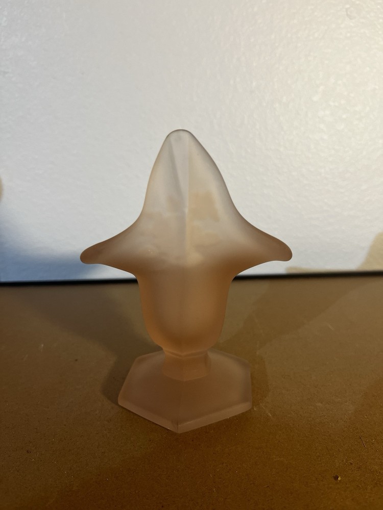 This is a vintage Westmoreland Art Deco vase originating from America. It features a pink frosted glass Jack in Pulpit design with a rose motif. The vase is 5 1/4 inches tall and hand-blown, showcasing intricate floral details. This elegant piece reflects a miniature theme and was produced in the 1970s, showcasing the exquisite artistry of Westmoreland's art glass production.