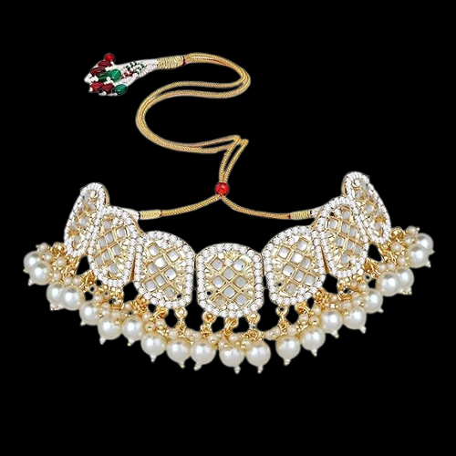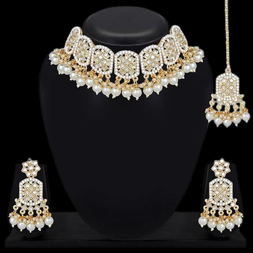 Traditional White Pearl Kundan Necklace Set | Kundan Choker | Fancy Jewellery with Earring and Maang Tikka for Women Girls