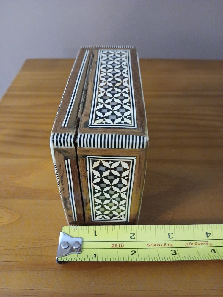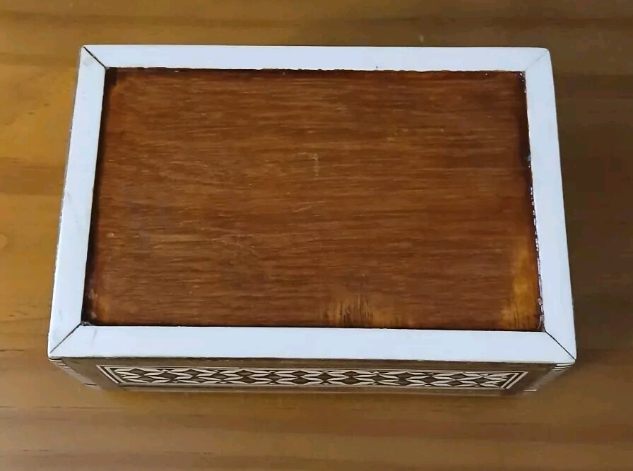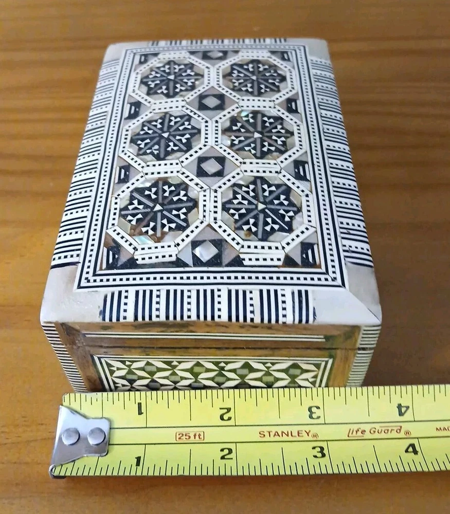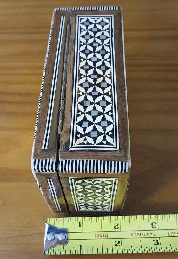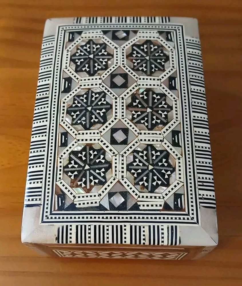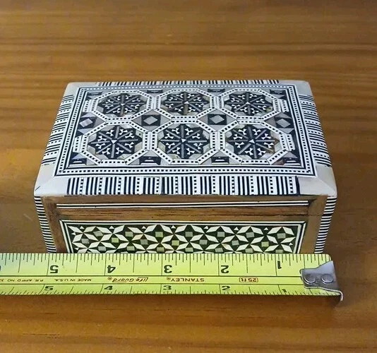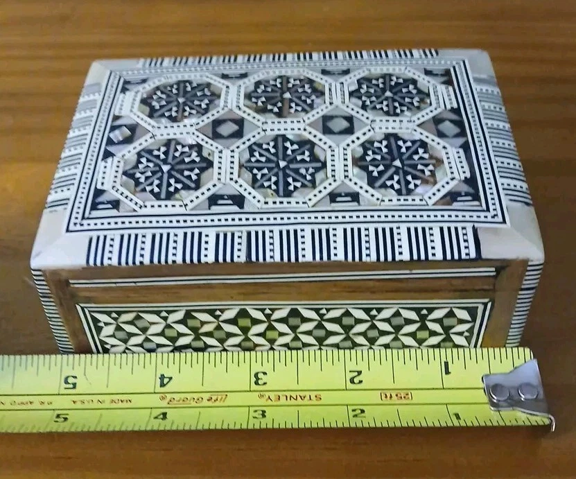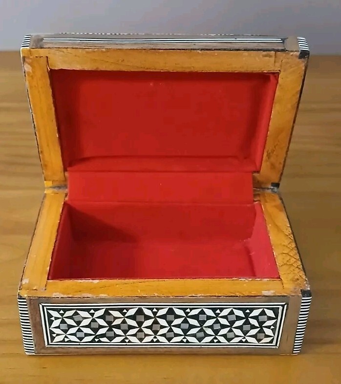 This exquisite Egyptian box is crafted with intricate inlaid mother of pearl designs. It features a luxurious red velvet interior that adds a touch of elegance to any collection. Measuring 5 inches long by 3.5 inches wide this handmade piece is a must-have for collectors of tobacco and other unique items. Pre-owned and in good pre-owned condition.