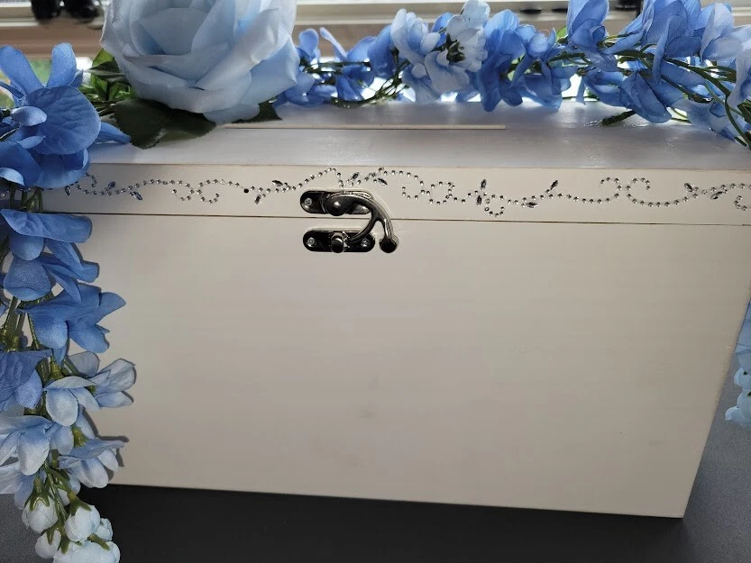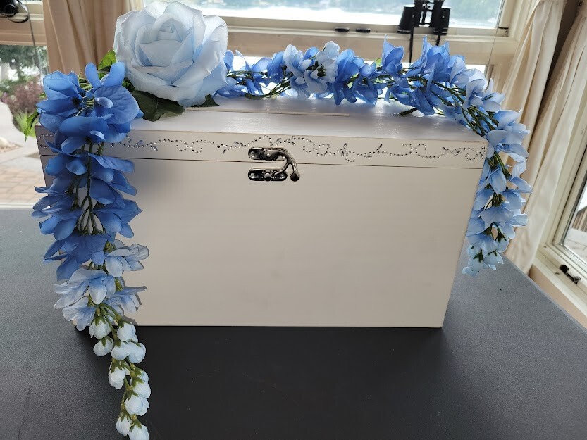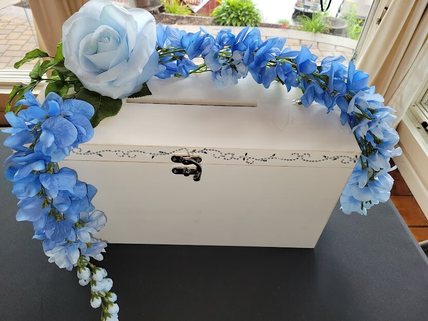 Have a beautiful place for all your gift cards at your wedding or shower. This is a large wooden rectangle shaped box. It measures approx 16" wide. It has pretty crystals applied along the front. There is a latch closure, no key required. I have attached lovely blue flowers to the top that hang over the sides. You can adjust as you like. Only used once at my own wedding, a month ago. Worked great. I had applied a photo to the front when we used it. Please see photos. This will meet your requirements of something old and something blue. Don't pay those high prices at the stores. Smoke and pet free home.