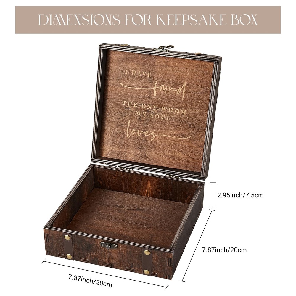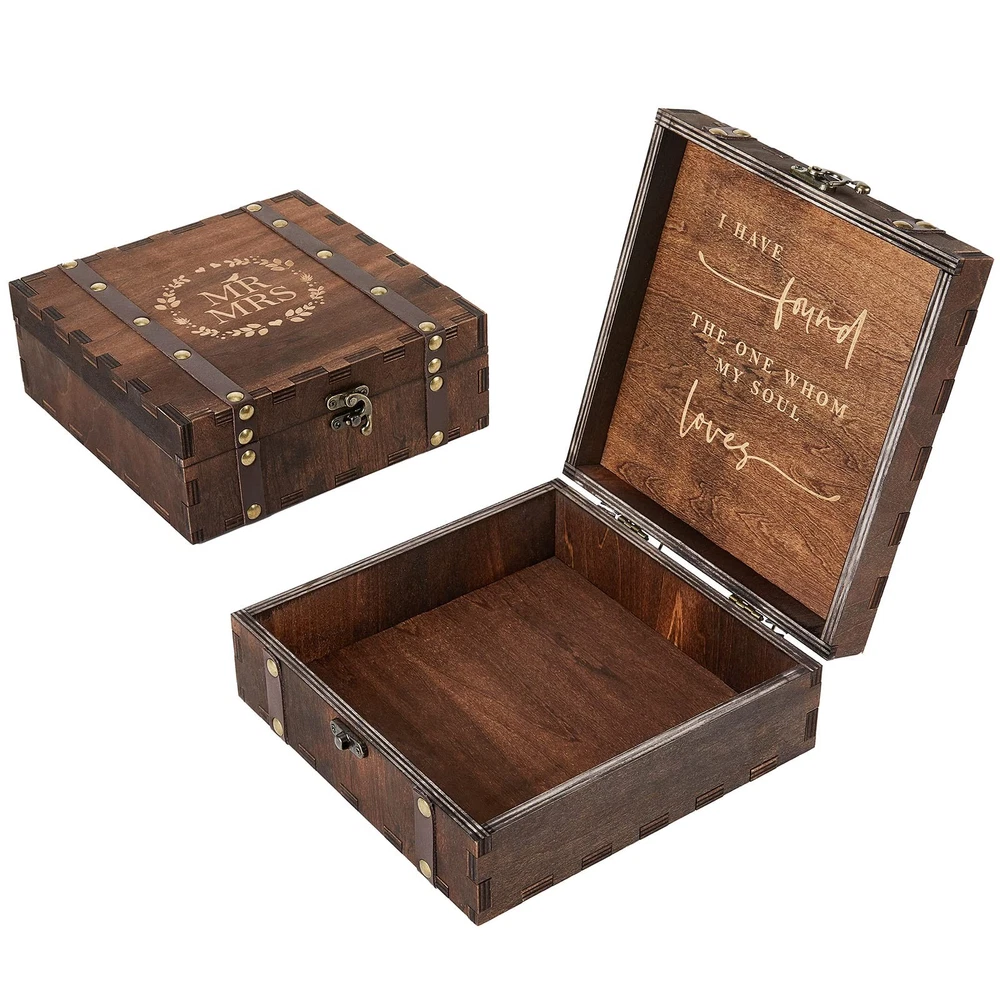 【Design】Engraved "Mr & Mrs" on the outside lid, both engraved inside of the box. Decorated with dark brown PU leather and rivet, vintage and novelty, a sturdy latch for security. Our beautifully engraved box is a sweet way to share your love. 【Size and Material】Dimensions are 7.8” long x 7.8'' wide and 2.9” high for this wood box. Made of plywood and wood, handcrafted with a matte finish to bring out the natural grains of the wood. 【Gifts Ideal】Make unique wedding gifts, engagement gifts, anniversaries gifts for couples, and also ideal birthday gifts and Christmas gifts for women, girlfriend, wife, and parents. 【Multi-Use】Keepsake box with lids can be used to any kind of items such as first souvenirs, trinkets, toys, photographs, plane tickets, stubs from concerts, religious items, jewelry, makeup, and more. 【Personalized Engraved】Free personalized engraving service: Name, Initials, and Date. Personalize with details on the memory box to make this a unique and thoughtful present that will be treasured.