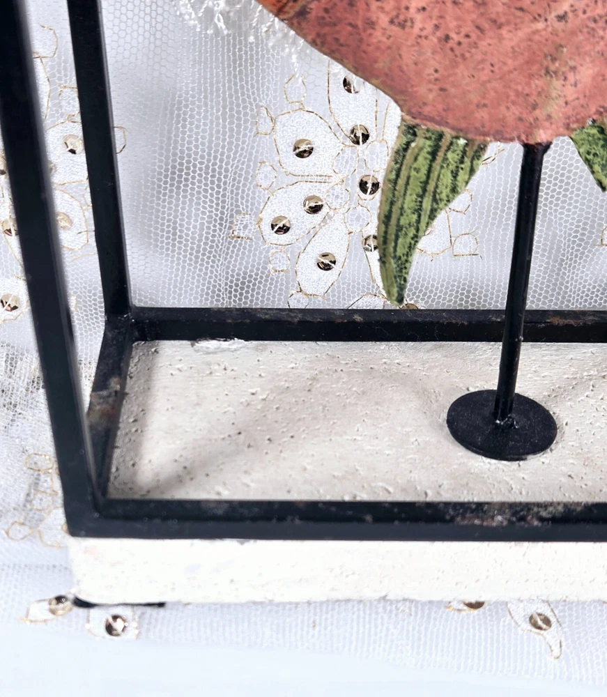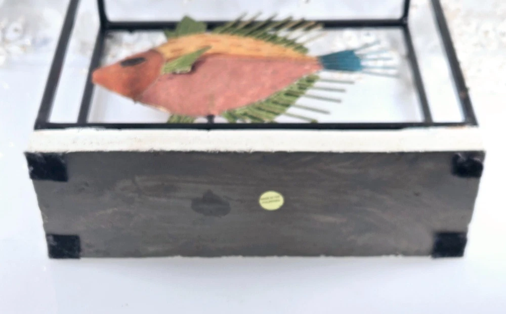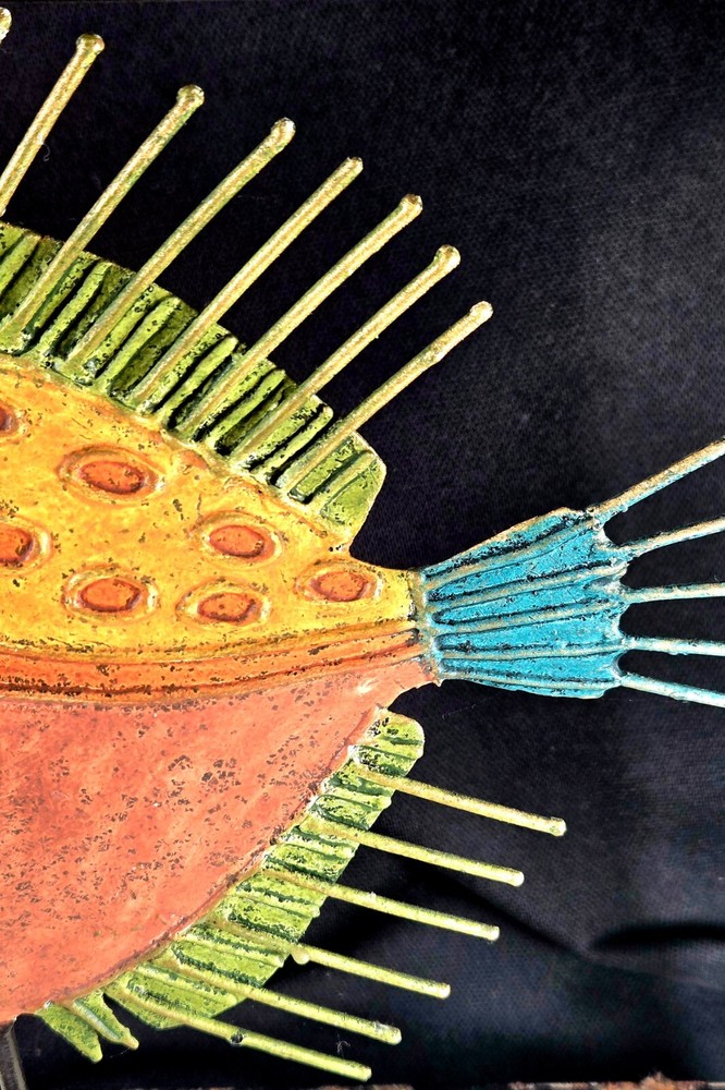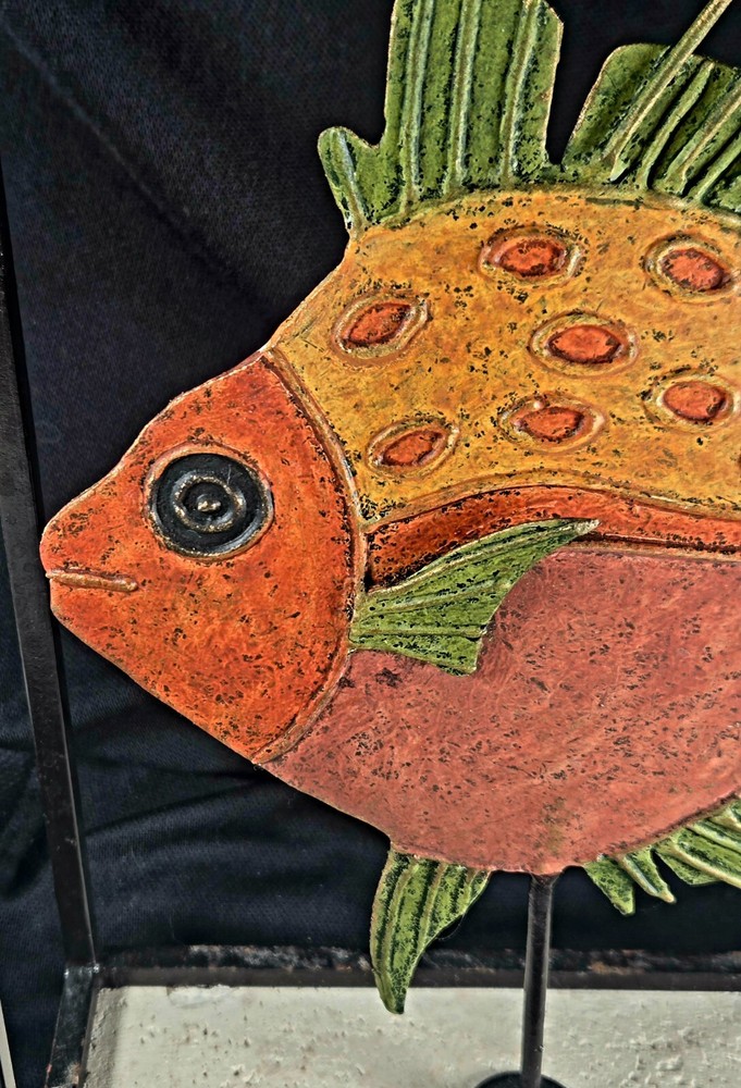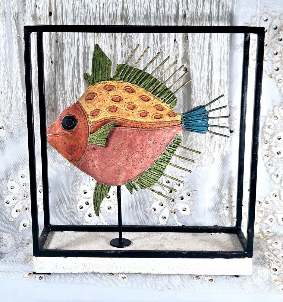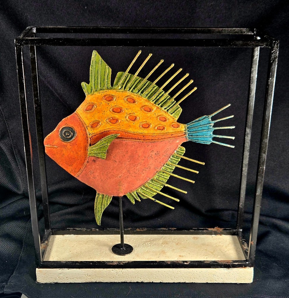 This handmade metal sculpture features a 3D design of a colorful tropical fish suspended within a wrought iron frame, giving it a unique and artistic look. The medium-sized piece measures 9.5 inches in length and showcases intricate metalwork craftsmanship. The nautical theme and art style make this sculpture a standout decor piece for any art enthusiast's collection. Made in the Philippines, this sculpture is a creative representation of marine life that is sure to add a touch of artistry to any space. J066