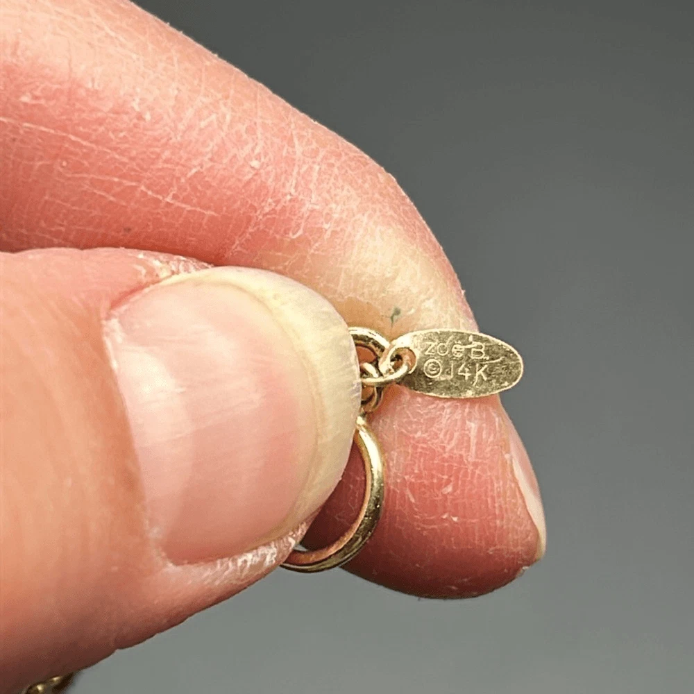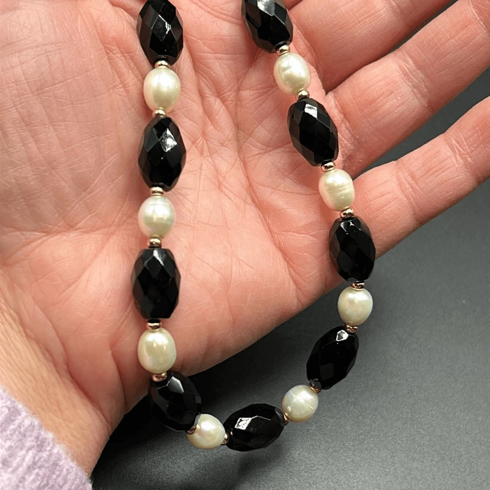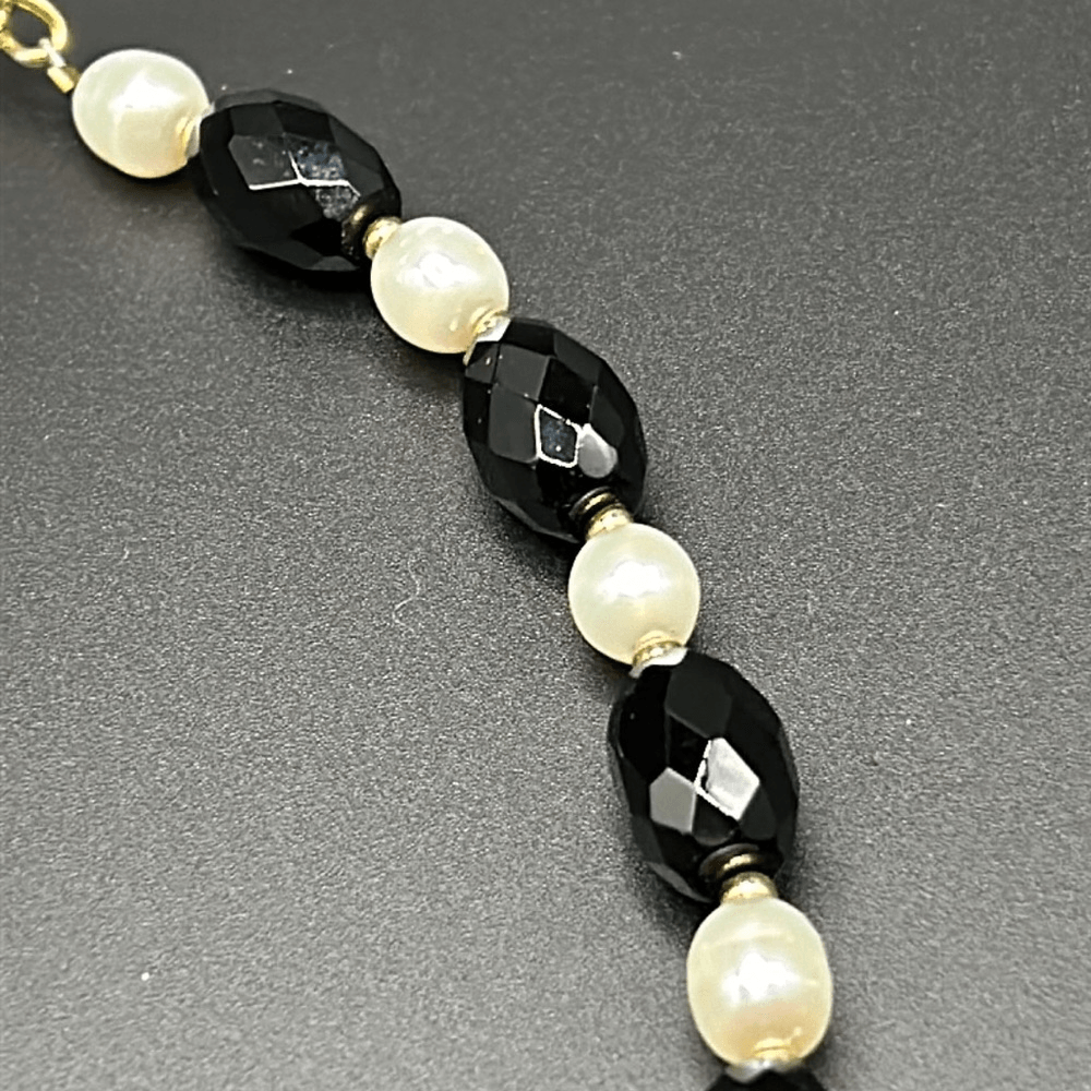 Faceted onyx stones with cultured pearls, and 14K gold spacer beads 14K gold clasp with hangtag marked "Zoe B. 14K" 8" drop with 2.5" extender Great condition