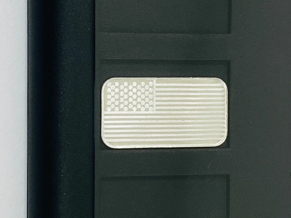 Element Card is here! Finally a vehicle for your precious metals that fits right into your wallet. Larger slots for the Element Card have been the most requested design change from the original Element Card. This particular Element Card holds single gram bullion bars from many different manufacturers including Pamp Suisse, Istanbul Gold Refinery, APMEX, and Credit Suisse. Included: 1 Element Card in matte black 1 Gram of silver bullion bar (15mm tall) American flag.