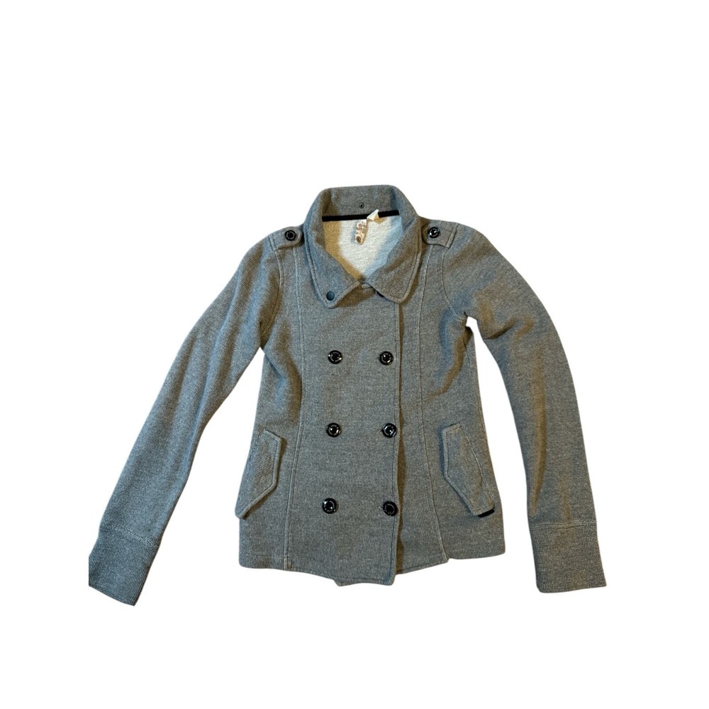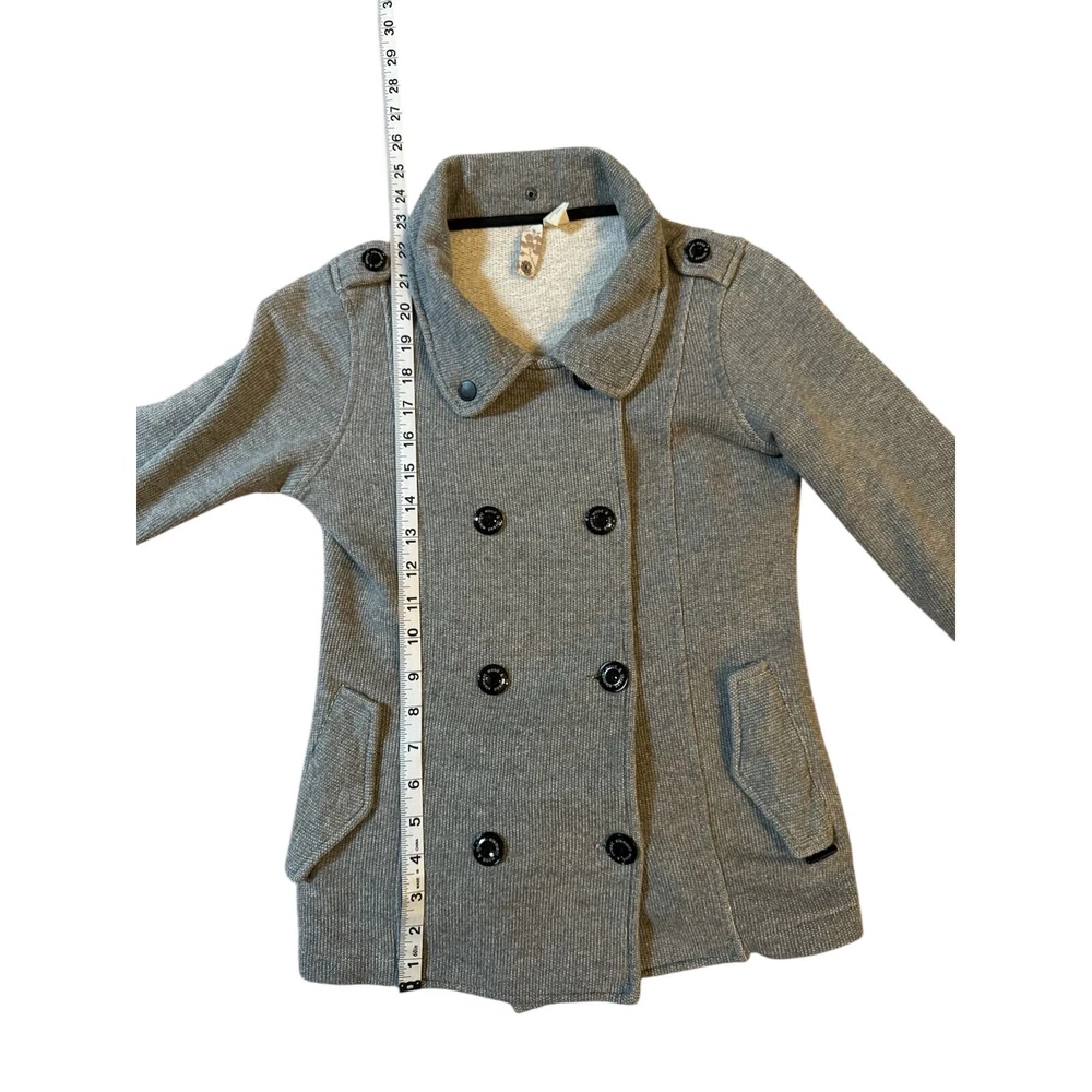 Element Wood & Thread double breasted soft gray peacoat Soft with stretch Button closure Double breasted Button detail on shoulders Light weight Similar to a soft sweatshirt material Measurements in photos