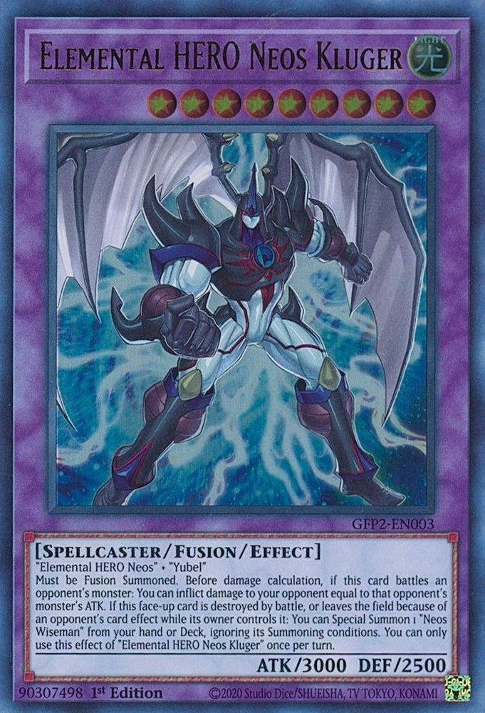 Must be Fusion Summoned. Before damage calculation, if this card battles an opponent's monster: You can inflict damage to your opponent equal to that opponent's monster's ATK. If this face-up card is destroyed by battle, or leaves the field because of an opponent's card effect while its owner controls it: You can Special Summon 1 "Neos Wiseman" from your hand or Deck, ignoring its Summoning conditions. You can only use this effect of "Elemental HERO Neos Kluger" once per turn.Features:1st EditionAdditional Description:Elemental HERO Neos KlugerLanguage:EnglishRarity:Ultra Rarebrand:KonamiGame:Yu-Gi-Oh! TCGCard Type:Effect, FusionCard Number:GFP2-EN003Set:Ghosts from the Past: the 2nd HauntingManufacturer:Konami