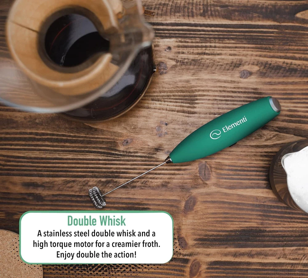 Elementi Milk Frother Handheld Double Whisk - Matcha & Drink Emerald Product Details Brand: Elementi Special Feature: Compact Design, Double Whisk Color: Emerald Material: Stainless Steel Product Dimensions: 1.97"W x 9.06"H Recommended Uses For Product: Residential Model Name: MF-NOSTNDDBLWSK-PRT Included Components: Stainless Steel Whisk Item Weight: 3.04 ounces Product Care Instructions: Hand Wash Only Style: Batteries Not Included Power Source: Corded Electric Manufacturer: Elementi Item model number: MF-NOSTNDDBLWSK-PRT PERFECT FOAM EVERY TIME: With the specially crafted double whisk, this handheld frother creates the ideal foam for your favorite beverages. WORKS IN UNDER 30 SECONDS: Enjoy rich and creamy froth in seconds with handheld milk frother. This compact and portable device is easy to use and clean, making it perfect for everyday use. ELEVATE YOUR COFFEE EXPERIENCE: With our electric whisk for coffee, you can enjoy café quality drinks in the comfort of your home. Easily craft cappuccinos, macchiatos and more with this convenient and versatile handheld frother. MORE THAN COFFEE: Make matcha tea, powder mixes, protein powder, and more. We’ve spent hours testing and honing to ensure you can use the Elementi frother for nearly anything, including a quick mix of mixed greens for a nutritious drink.