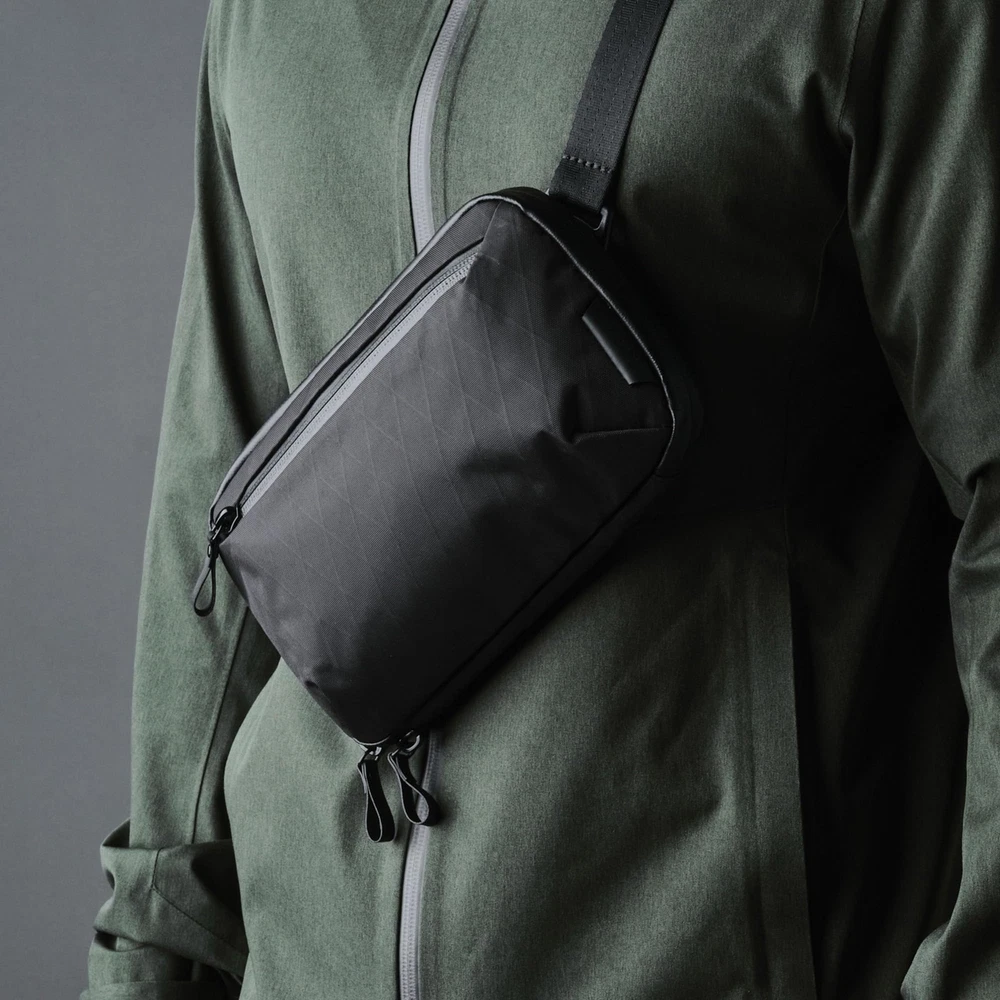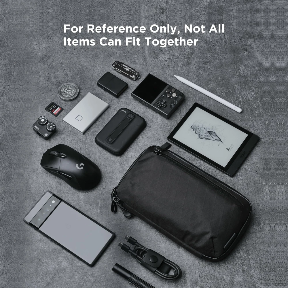 Elements Tech Case Mini Axoflux 600D: A deliberately compact organizer (9x5.3x2.8”, 0.6LB, 1.5L) designed specifically for professionals who carry only essentials. This is not a tablet case or laptop sleeve. It's an intentionally sized tech organizer for charging cables, power banks, earbuds and accessories up to iPhone 17 Pro Max dimensions. The Axoflux 600D fabric delivers structured,protective construction, creating a durable feel that maintains shape and shields electronics while offering more flexibility than rigid laminates. Weather-resistant recycled materials and YKK waterproof zippers keep valuables secure in most weather conditions. The accordion-style opening provides simultaneous access to two main compartments, six thoughtfully sized internal pockets, one pen loop and a front zippered pocket - ideal for organizing chargers, cables, earbuds, portable batteries and small daily necessities. Stands upright on desks and tables for quick visibility of contents. Convert instantly from tech organizer to mini crossbody with the included reinforced shoulder strap or carry by the rear grab handle. Fits inside larger bags for modular organization or functions independently for light daily carry. Built for essential-only carry philosophy - maximum organization in minimum space. Capacity varies based on specific items and packing method, designed for small electronics and accessories. Not for tablets or larger devices. INTENTIONALLY COMPACT DESIGN: Purpose-built for essential electronics only - not designed for iPads, tablets, or laptops. Measuring 9x5.3x2.8” and weighing just 0.6LB. The accordion-style opening reveals two main compartments and six internal pockets. Ideal for organizing power banks, earbuds, charging cables and small accessories up to iPhone 17 Pro Max size. Fits devices up to Kindle Paperwhite dimensions. Does not fit an iPad Mini, tablets or laptops.