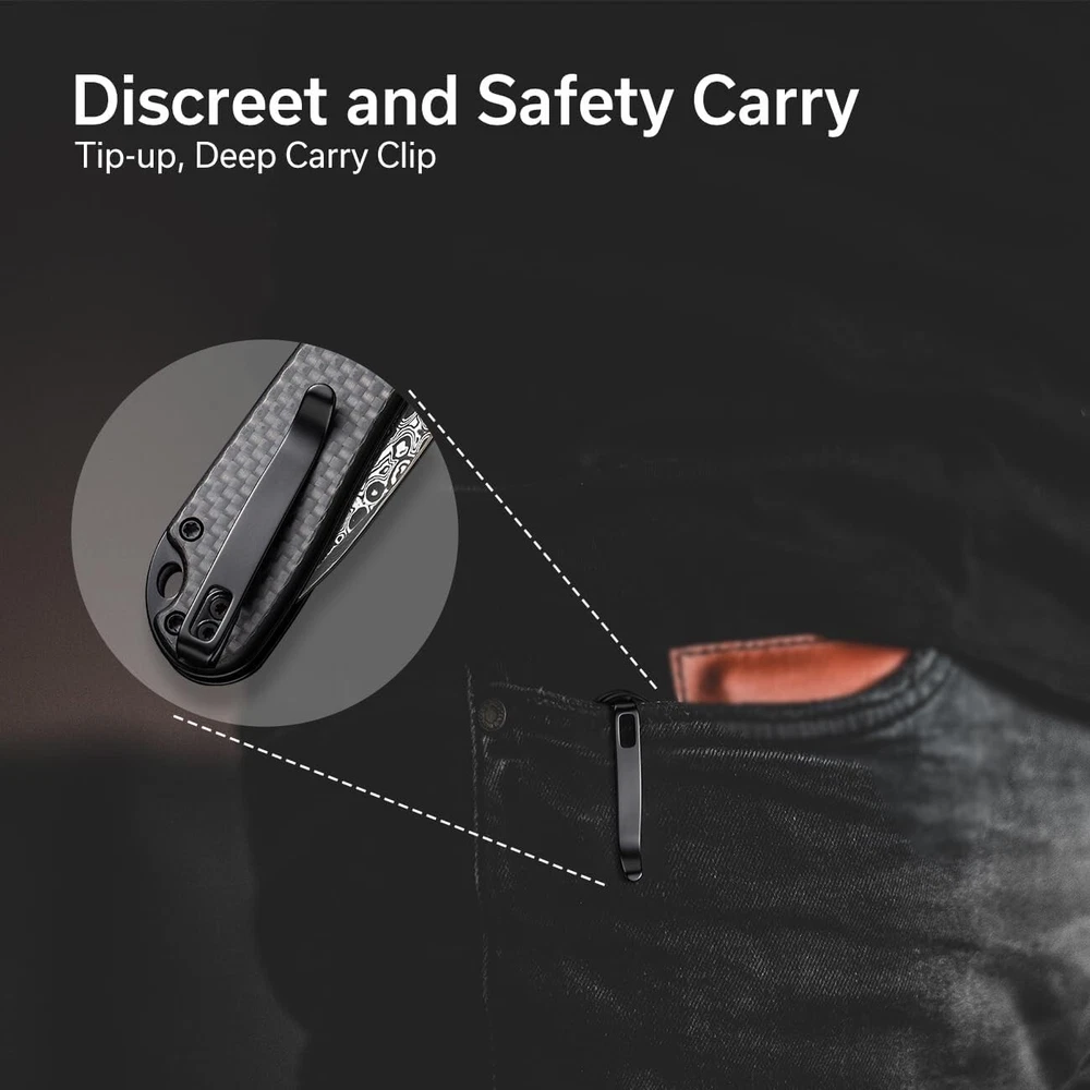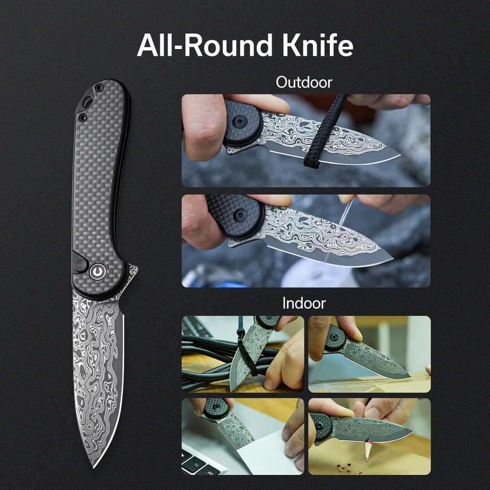 Elementum II Pocket Folding Knife, " Damascus Blade Utility Knife with Deep Carry Pocket Clip for EDC Classy, Minimalist, Aesthetic --- Flipper opener with a ceramic ball bearing pivot ensures a smooth and reliable action. The knife blade is secured in place via a button lock. Damascus Blade --- Its razor-sharp edge and ergonomic handle style effectively perform everyday tasks. All-Round Knife for Men --- This folding knife is built to excel in any environment with confidence, makes it a reliable tool for both outdoor and indoor needs. Discreet and Safety Carry --- Carry with confidence with a deep carry clip whether in your pocket or backpack, ready for immediate use. Voted "Best Edc Knife"--- This pocket knife is easy to use, suitable for all adults, also can be a nice gift to a friend whether they're into knives or not. USA Service Center --- knives and tools provide a service against defects in material and workmanship.