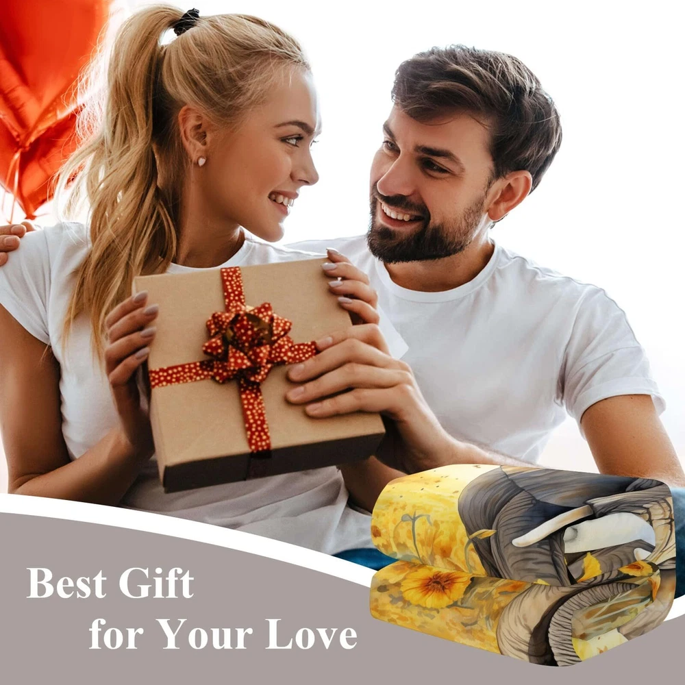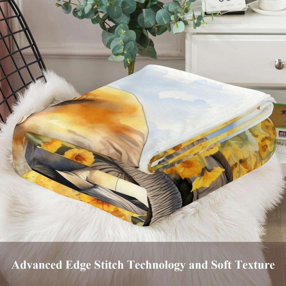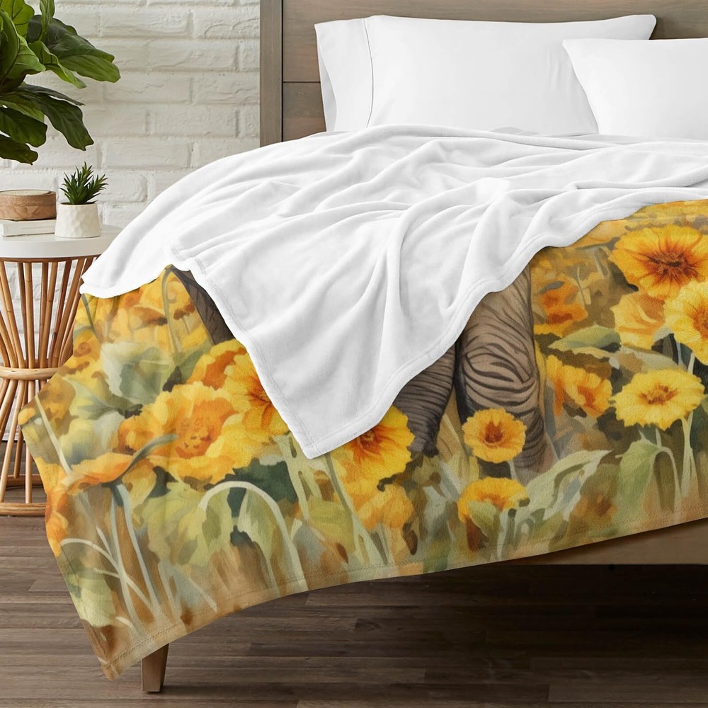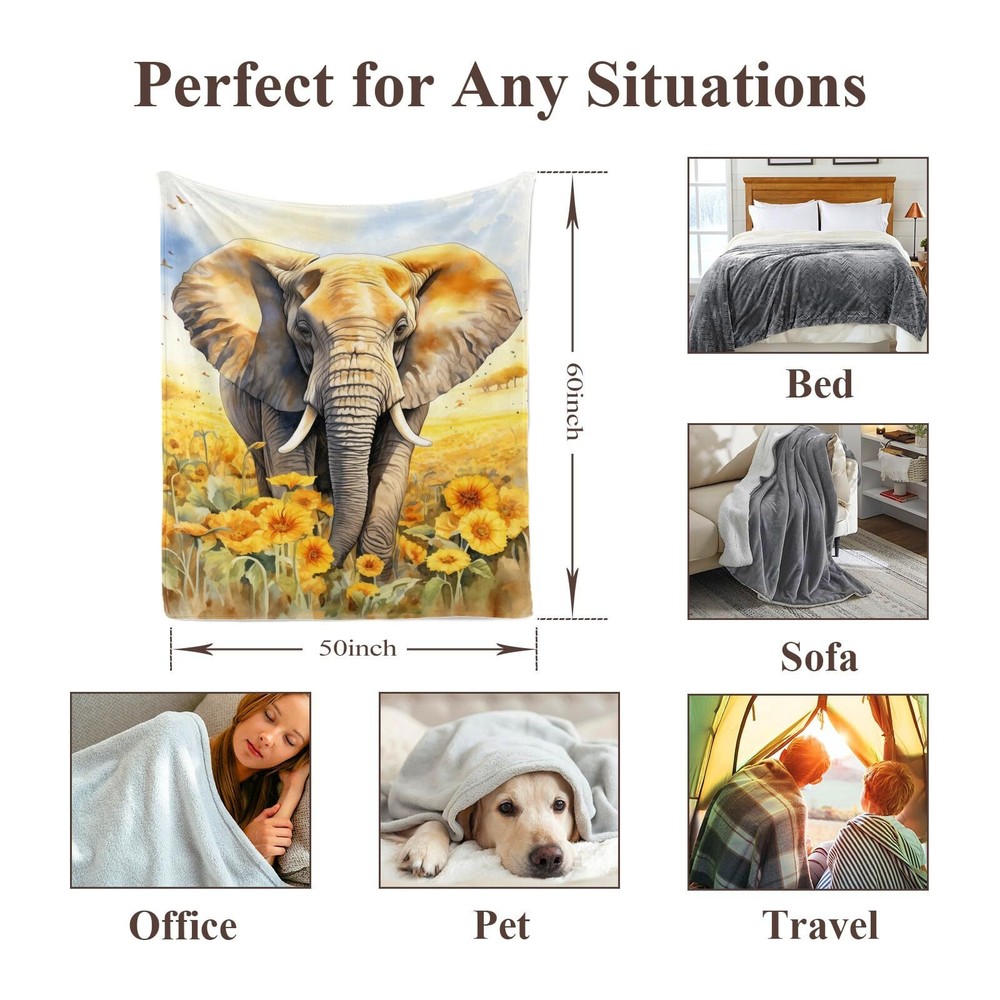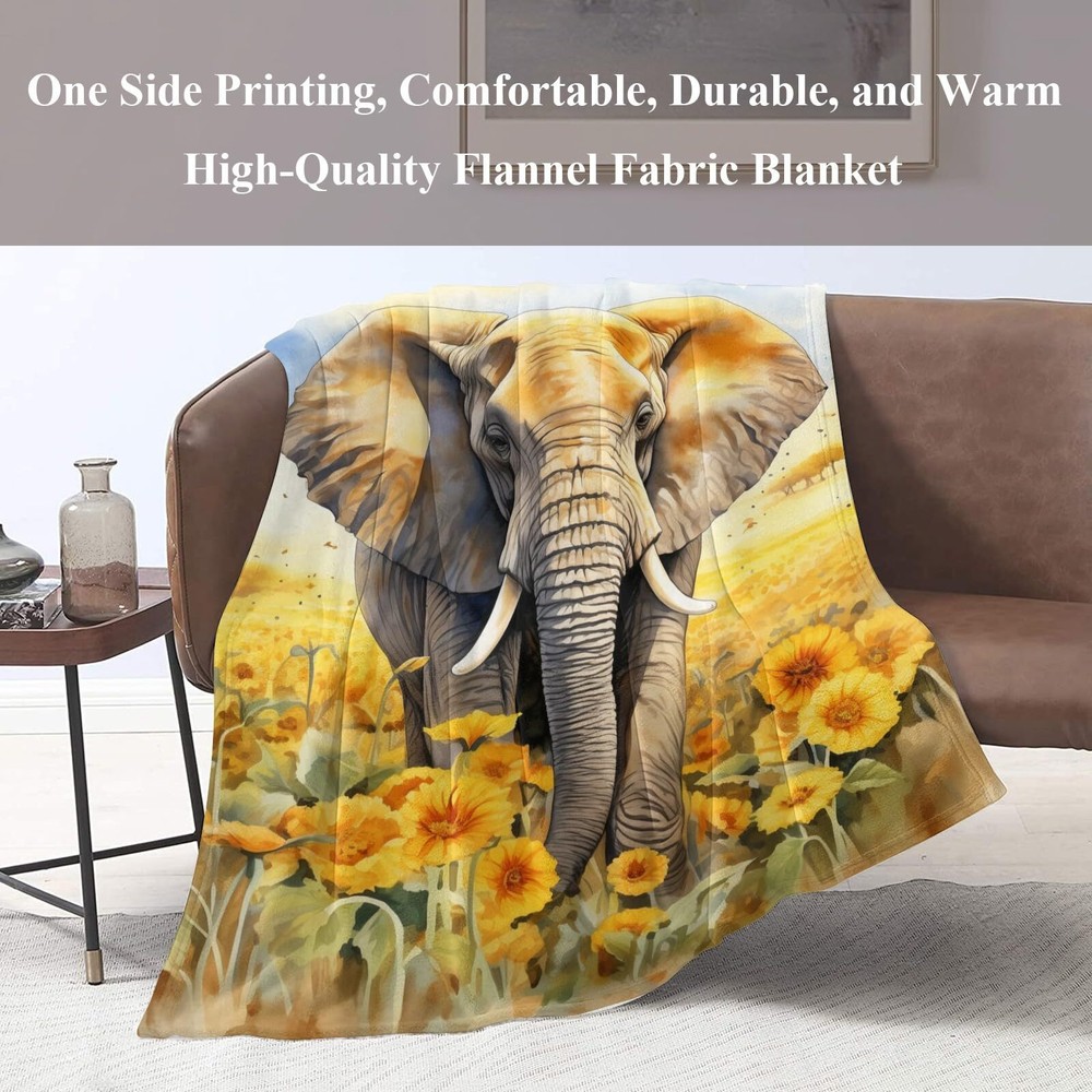 BLANKET SIZE & WEIGHT -Our elephant blanket measures 50"x 60" (130x150 cm) and weighs 740g (1.63 lbs).Made of 350 GSM flannel fabric, this thick blanket offers superior warmth compared to other flannel blankets because of its higher gram. It keeping you warm, helping to retain heat without feeling stuffy.It is suitable for women, men, babies, children, dogs, pets, and more. Enjoy warmth and enhance your home decor with our super soft, fuzzy, fluffy ,comfy blanket. HIGH QUALITY MATERIAL -Colorful sunflowers throw blanket is made of high quality microfiber polyester flannel. One side printing,a super soft,lightweight and comfortable design.Skin friendly,durable, warm,and resistant to wrinkles, discoloration, pilling, and shedding,this is easy to care for a flannel blanket can provide warmth at any time. APPLICABLE OCCASIONS-Our thick and cozy blanket is suitable for all seasons, indoor and outdoor. It serves as an ideal bed blanket,living room sofa blanket or office couch spare blanket for reading, watching TV, or taking a nap.Additionally, it makes the perfect companion for your movie nights, park picnics, camping trips, or vacation travels.It can be used as photographic props for a beautiful home decor to take beautiful photos and provide a soft feeling that pets will love. PERFECT BLANKET GIFT -The animal and flowers blanket is a cute and thoughtful gift for your family,friends,colleagues.It is also an ideal gift for birthdays,valentine's day, mother's day,father's day,Christmas, weddings, and housewarming parties.Colorful flannel blanket throw makes the person who receives cute throw blankets feels happy and warm. Our unique blanket is your best gift choice. 100% SATISFACTION SERVICE:If you are not satisfied with the throw blanket,we offer free replacement and service,Enjoy this soft and cozy bed blanket with confidence. We are committed to your shopping experience,please feel free to let us know your any questions.