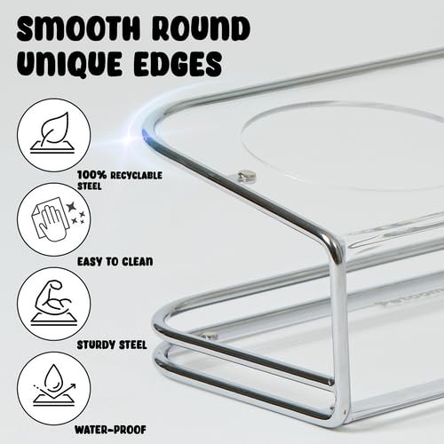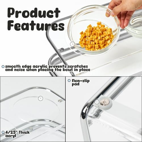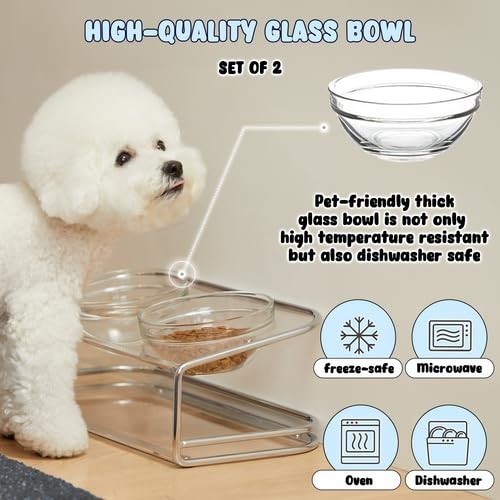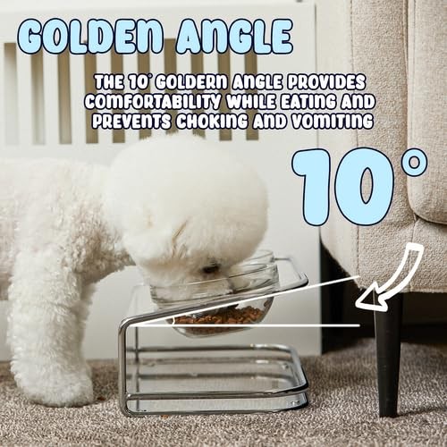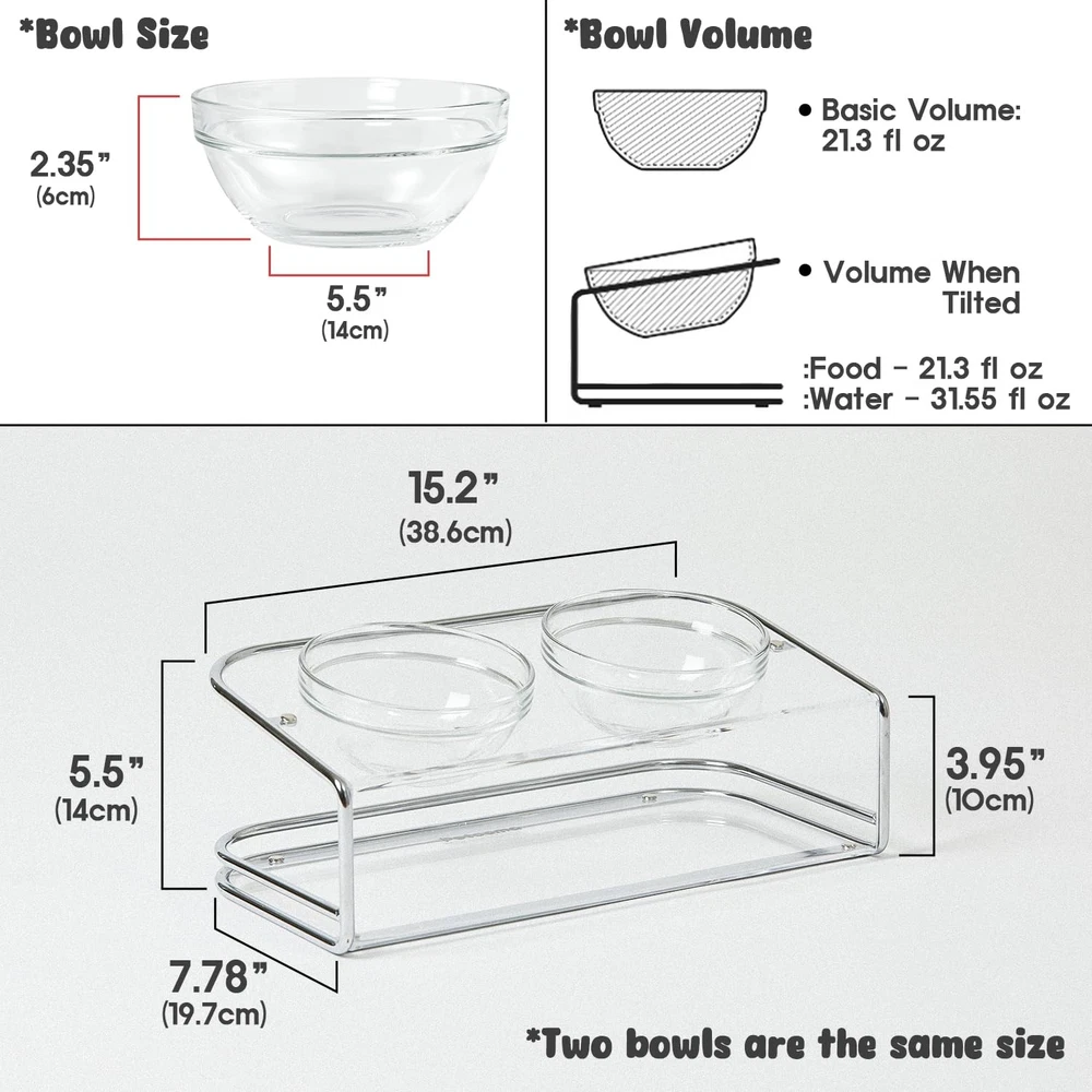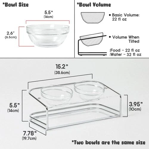 The elevated dual bowl stand, designed for medium to small dogs prone to spilling, features an optimal tilt for a comfortable, healthy eating experience, and includes two durable, dishwasher and oven-safe tempered glass bowls [ELEVATED FOOD BOWL]- Our pet bowl stand is raised at an optimal 10° angle tilt helps alleviate neck and back joint strain, while providing pets with a comfortable eating experience. Moreover, the elevated design helps promote digestion and easy swallowing while eating and drinking [PREMIUM QUALITY GLASS BOWL]- Includes 2 tempered glass bowls that are durable and ensures safety of your pets meal as they are dishwasher, microwave and oven safe. Pet food and water bowls has a capacity of 22fl oz, which makes itthe perfect size for dry food, wet food, treats and water [CATS AND DOGS FRIENDLY STAND]- Our feeding bowl stand is 3.95" high at the front that makes it the perfect size for comfortably feeding and ensuring a smoother food delivery to puppy, kittens, big adult cats and small dogs [ELEGANT DESIGN]- Our elevated dual food and water stand is made of thick acrylic base and sturdy silver steel frame which complements with any interior space. It features a round edge for extra safety and its extremely strong against impact [STABLE & EASY TO MAINTAIN]- The quality acrylic base is very easy to clean when spilling food and water with a cloth, which makes an excellent choice for messy eating dog. Additionally, with the steel frame and anti slip pads on the bottom it adds extra support and stability preventing playful pets from knocking over the bowls