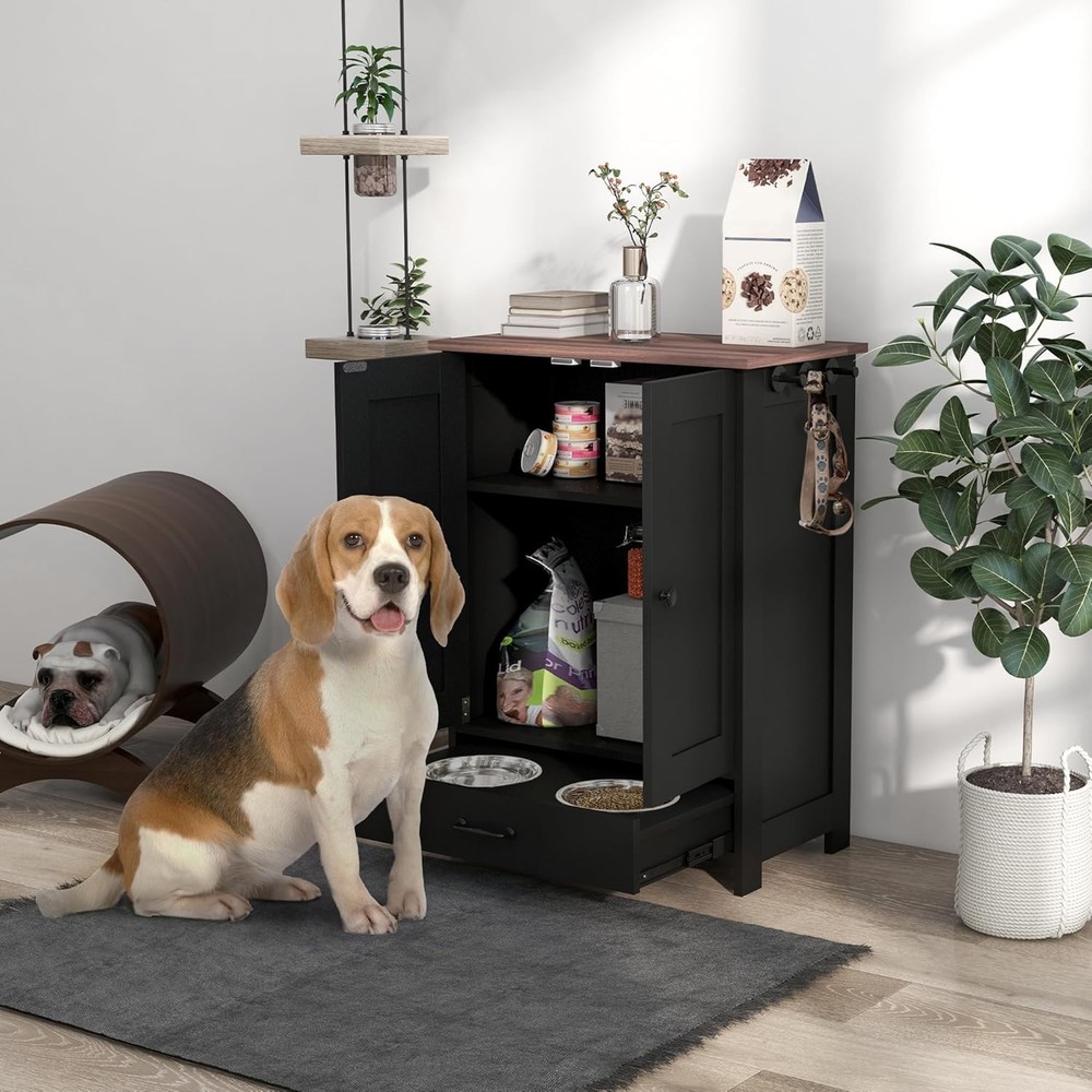 Product Description About this item Hidden Pet Food Container: The dog food storage cabinet is designed with a bottom pull-out drawer. When eating, pull out the bottom drawer to reveal the food and water bowls. When the feeding time is over, just push it back. Keep your environment as clean and tidy as ever. Store Pet Supplies: Use this pet feeding station to store all your pet supplies in one place. Three hooks on the side can hang harnesses and leashes. Cabinet can store food bags. Countertop can store cans, pet jackets or treats. Use at Home: You can use this pet food storage cabinet as a coffee table in the living room or a side table in the office or bedroom. Suitable for Bulldog, Boston Terrier, Chihuahua, Shih Tzu, Yorkshire Terrier, Labrador Retriever, Golden Retriever, German Shepherd, Rottweiler, Doberman Pinscher, etc. Beautiful and Sturdy: Our pet feeding station has a particleboard frame and base that is smooth and easy to keep clean. Comes with 2 stainless steel bowls for safe and hygienic feeding of your pets, creating a vintage industrial look that blends seamlessly into any home decor. Overall dimensions are 23.6"L x 13.8"W x 31.5"H. Installation and Service: The elevated dog bowl holder includes clear illustrated instructions and all accessories for easy installation. If you encounter any product problems after purchasing the pet storage box from us, regardless of its quality or use, don't worry, please feel free to contact us. We will provide you with a satisfactory solution and give you a good shopping experience. Product Features Hidden Feeding Solution: This dog feeding station includes two concealed bowls, ensuring a tidy space for your pet to enjoy their meals - great for maintaining a clean and organized area. Versatile Storage: Equipped with a pet food storage cabinet featuring a removable panel and three adjustable heights, this pet station adapts to your storage needs, simplifying pet mealtime routines. Convenient Accessories: This pet dish bowl set with storage offers three side hooks for hanging leashes or collars, keeping your pet's accessories organized and within reach. Stylish and Functional: The large top of our dog food storage container with bowls is a functional piece of furniture, blending seamlessly with your home decor while providing a dedicated space for your pet's feeding area. Dog Feeder Station Info: Overall Dimensions: 23.6" L x 13.8" W x 31.5" H. Suitable for medium-sized pets measuring 14"-20" in shoulder height. Assembly required. Specification Main Material: Particle Board Product Dimensions: 23.6"L x 13.8"W x 31.5"H. Weight (lbs.): 18.20 Package Size: 36"L x 25.4"W x 5.7"H. Weight (lbs.):45.20
