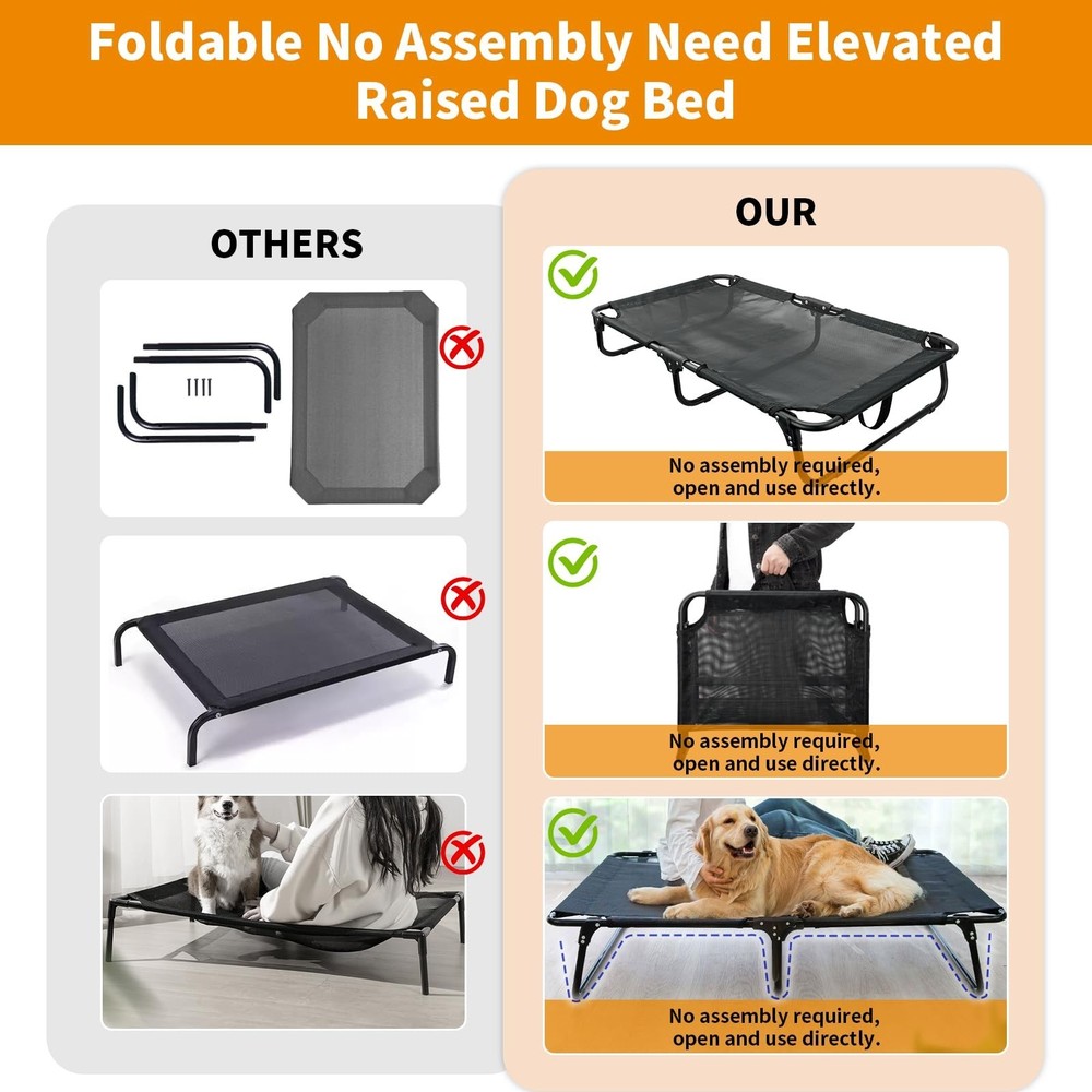 Elevated Raised Dog Bed for Large Sized Dogs Foldable Outdoor Cooling Dog Bed Cot with Breathable Mesh, Chew-Proof, No Assembly Need, Black Product Details Size: 43"L x 7"W x 23"H Brand: Loebelle MPN: Raised Dog Bed UPC: 637586992308 EAN: 0637586992308 Brand: Loebelle Breed Recommendation: All Breed Sizes Special Feature: Foldable Material: Alloy Steel Product Dimensions: 43"L x 7"W x 23"Th Product Dimensions : 43 x 7 x 23 inches; 6.06 Pounds Item model number : Raised Dog Bed Date First Available : November 29, 2024 Manufacturer : Loebelle Country of Origin : China Best Sellers Rank: #75,345 in Pet Supplies (See Top 100 in Pet Supplies) #1,001 in Dog Beds #1,001 in Dog Beds Customer Reviews: 4.5 4.5 out of 5 stars 41 ratings Item Weight: 6.06 pounds Manufacturer: Loebelle Country of Origin: China Item model number: Raised Dog Bed Date First Available: November 29, 2024 Item Package Dimensions L x W x H: 23.7 x 21.06 x 5.39 inches Item Dimensions LxWxH: 43 x 7 x 23 inches Item Weight: 6.1 Pounds Brand Name: Loebelle Target Audience Keyword: Dogs, dogs Directions: Directly deployed for use without the need for assembly Warranty Description: no Model Name: Elevated Dog Bed Color: Black Size: 43"L x 7"W x 23"H Material: Alloy Steel Number of Items: 1 Breed Recommendation: All Breed Sizes Included Components: Dog Bed,pillow Specific Uses for Product: Joints Large Dog Bed Dimensions: Loebelle large elevated dog bed measures 43 x 23 x 7 inch(109 x 58 x 18 cm), fits up to 0-200 lbs; The overall structure is very stable, weighing 5.55 lbs; Elevated dog bed adopting an 8-inch elevated design right for dogs of all ages to increase air circulation, creates low-impact areas to pressure points and joints Stable and Sturdy: Made of mesh fabric with heat resistance, durability, and breathability, relieve joint pain in pets and keep them cool during hot summers and prevent scratching and chewing; Adopting three sided support increases the stability of the structure, can accommodate multiple dogs at once No assembly: Raised dog bed has no assembly required, easy to fold, can be packed and taken away at any time, perfect for travel and camping, providing a safe and comfortable resting space for pets; Bottom anti slip pad can protect the floor and increase structural stability User and Pet friendly: Cooling Elevated Dog Bed is very lightweight, only 4 inches high when folded; The middle Velcro makes the folding structure more stable, and the Velcro at the handle can prevent pinching Easy to Clean: After rinsing with water, wipe with a cloth and let dog cot bed dry naturally