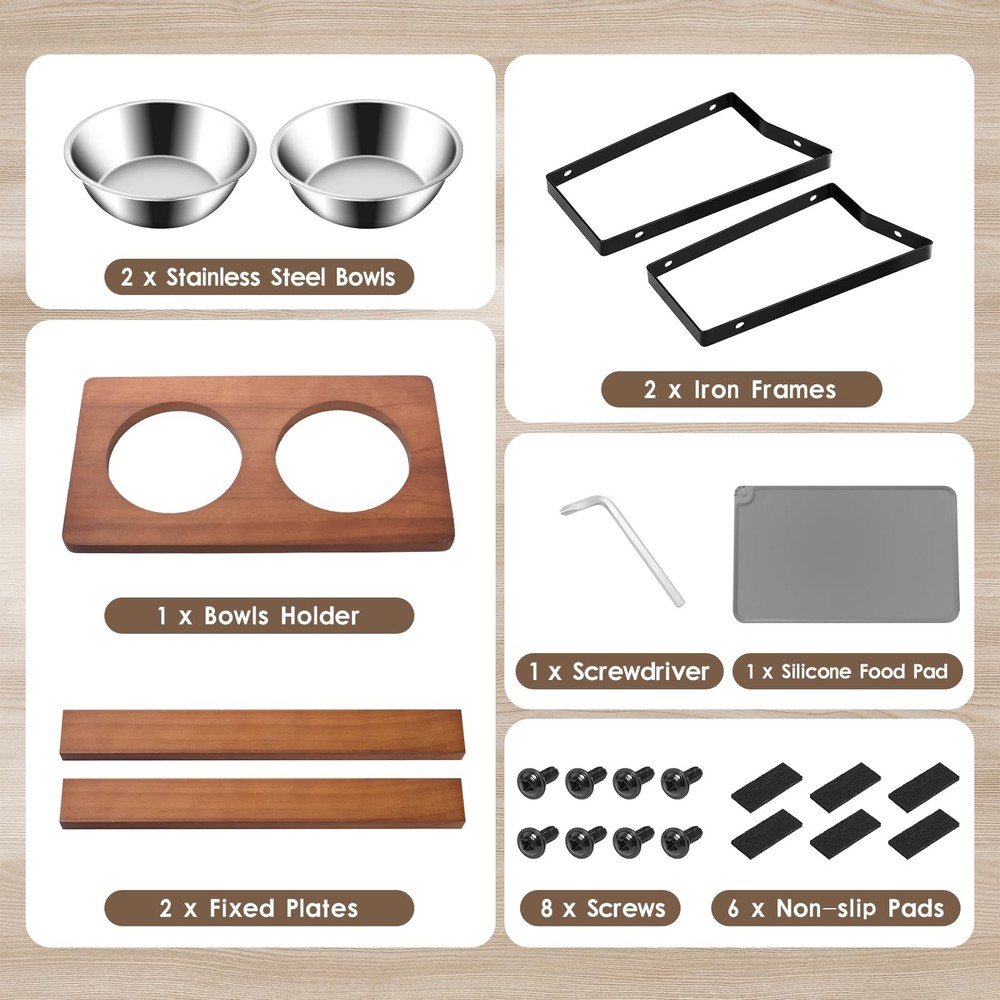 15°Tilted Elevated Cat Bowls with Food Mat, 2 Stainless Steel Bowls 【Easy to Assemble】 Step 1: Connect the bowl holder to the iron frame with screws. Step 2: Use screws to connect the 2 fixed wooden slats with the corresponding holes, and put a non-slip pads on each of the bottom 4 feet to avoid scratching the floor 【Packing List】 Elevated cat bowls set includes 1 x solid wood bowl holder, 2 x fixed solid wood plates, 2 x iron frames, 2 x stainless steel bowls, 1 x silicone food mat, and accessories: 1 x screwdriver, 8 x screws, 6 x non-slip pads 【Solid Wooden Stand】 Our cat bowl is made of natural wood, anti-deformation. It is polished to be thornless, no odorless, will not harm your pet (Note: Wood products should not be exposed to continuous humidity. If it gets wet, please dry it in time !) 【Upgraded Pet Bowls】 2 stainless steel bowls, each with a capacity of 12.9 OZ. Silicone food mat can prevent cats and puppies from spilling food residues on the floor while feeding, and keep the room or carpet clean. Food mat size: 18.9" x 11.8" 【15° Tilted Design】 Our cat bowls elevated tilted 15° design protect the cervical spine of pets, which can effectively relieve the pressure on the neck and stomach of cats when eating, and help reduce the risk of vomiting and indigestion