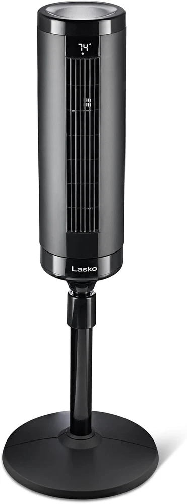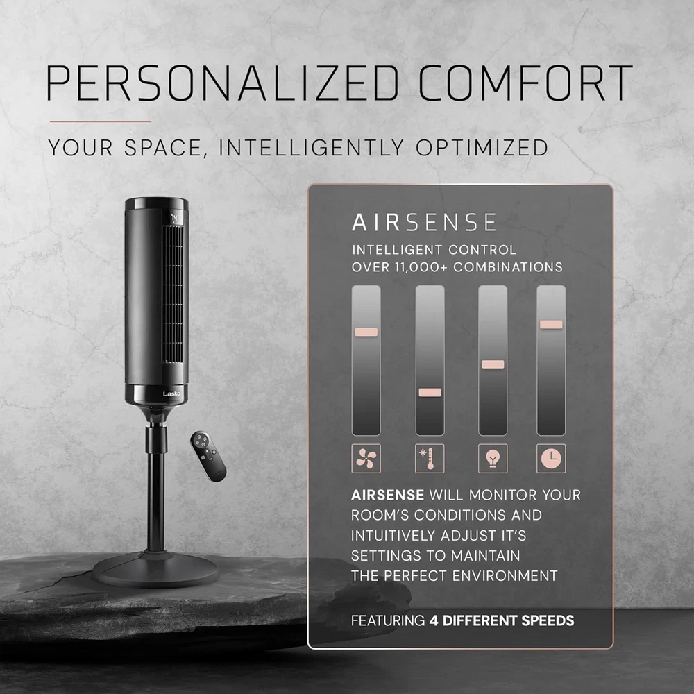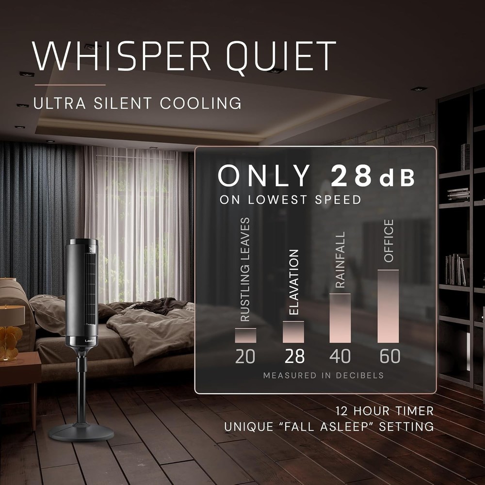 Product details HEIGHT-ADJUSTABLE COOLING: Elevation tower fan scales up to 54 inches, making it a useful tower fan for bedroom; this oscillating fan with remote has customizable airflow that brings comfort and coolness to your room environment POWERFUL AIRFLOW: This oscillating tower fan features 90° oscillation and 31 ft/s speed, cooling spaces up to 40 feet away; this Lasko tower fan is a standing fan that has convenient remote control operation QUIET OPERATION: Operating at just 28dB, this quiet fan produces a gentle breeze without disrupting activities like conference calls or TV watching, making it a good bedroom fan or office fan INTELLIGENT AIR OPTIMIZATION: With AirSense technology, this tower fan with remote adjusts speed based on room temperature, offering four adaptable modes for cooling CUSTOMIZABLE COOLING EXPERIENCE: Offering 4 speeds and 4 wind modes, this stand up fan includes Auto and Sleep settings; this remote control fan has a timer for convenience and ease of use