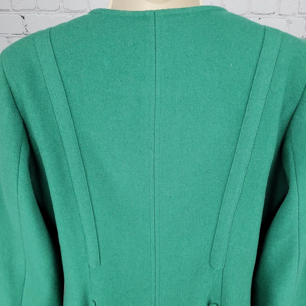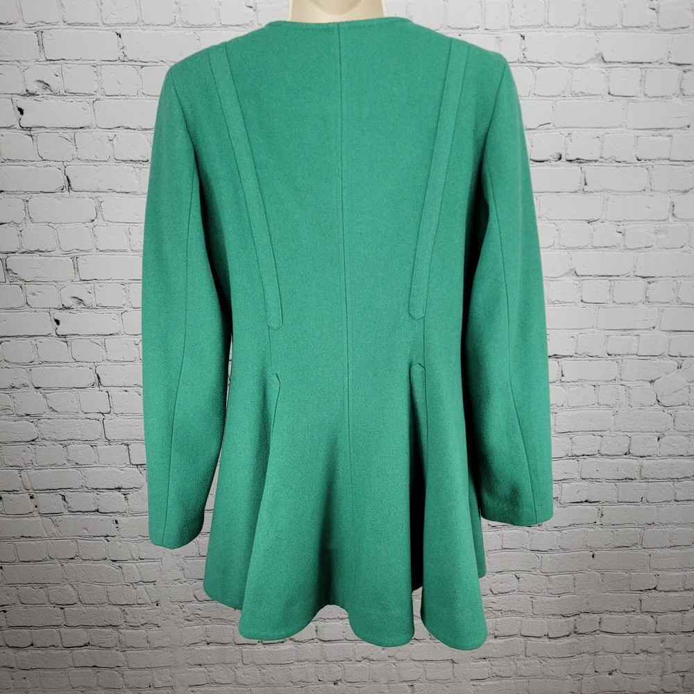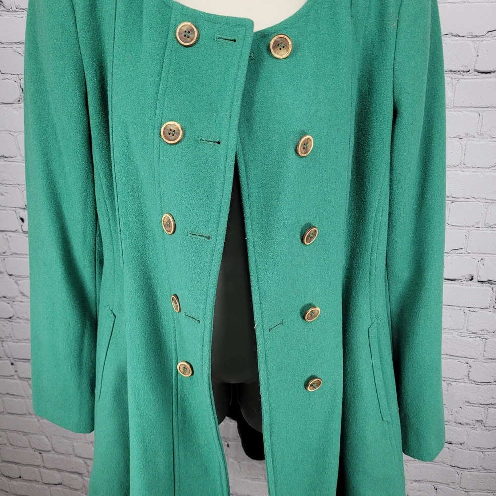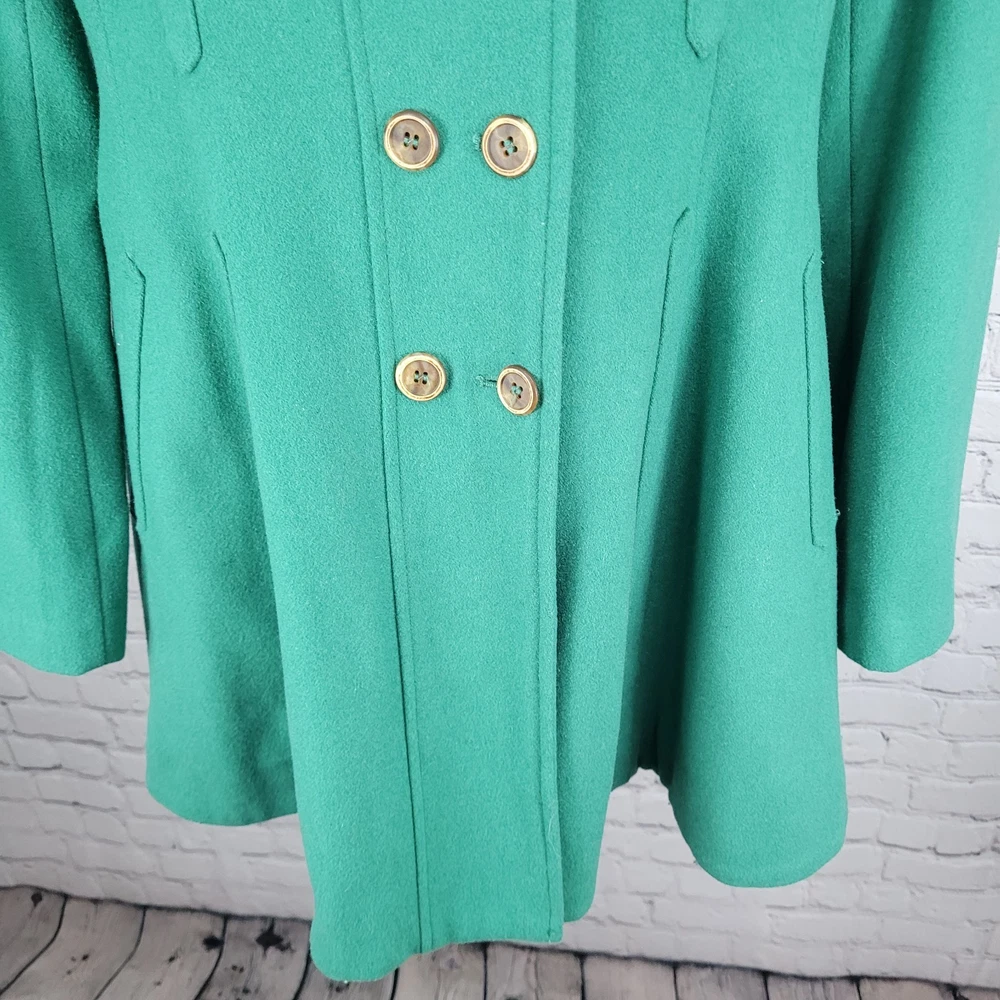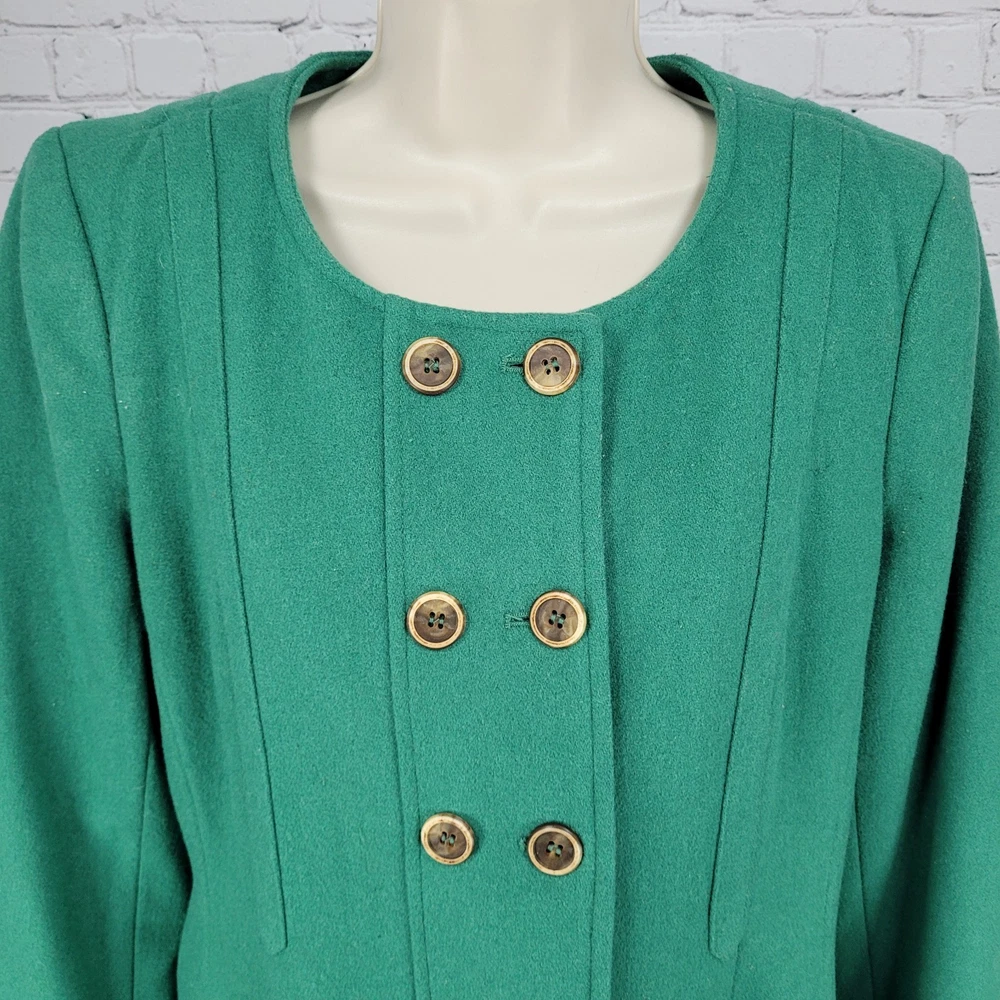 The Elevenses Anthropologie Green Wool Blend Double Breasted Buttoned Pea Coat in size 12 is a stylish and sophisticated addition to any women's wardrobe. Made from a warm wool blend with a cozy lining, this jacket is perfect for colder weather. Its classic pea coat design, complete with double-breasted buttons, adds a touch of vintage charm to any outfit. The rich green color adds a pop of color to your look, making it a versatile piece that can be dressed up or down for any occasion. Pit to pit 19" Shoulder to hem 34" Sleeve outer 26.5"