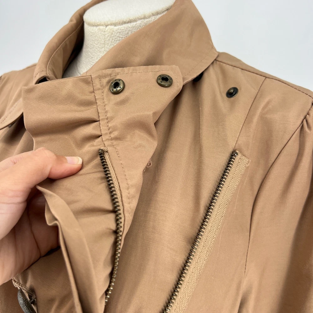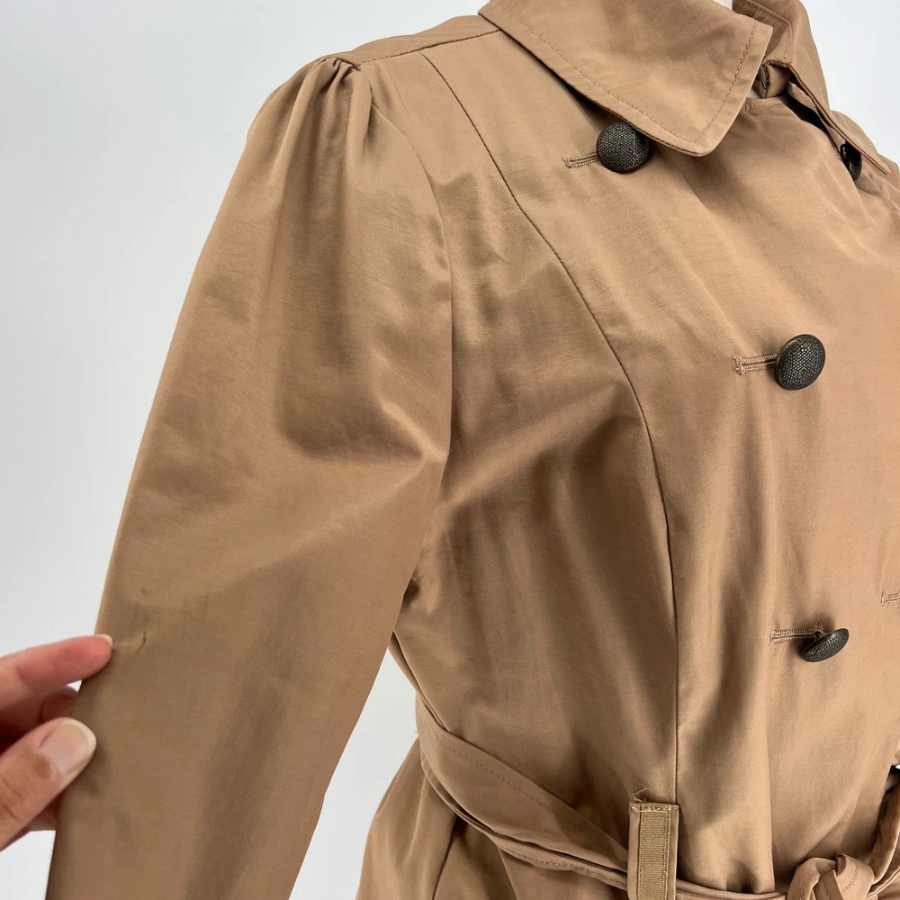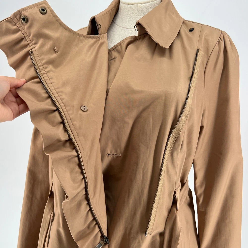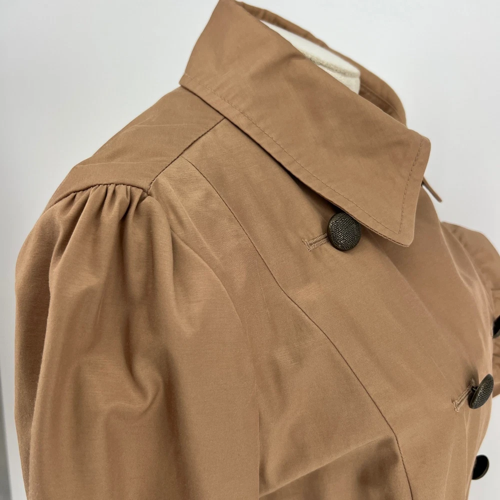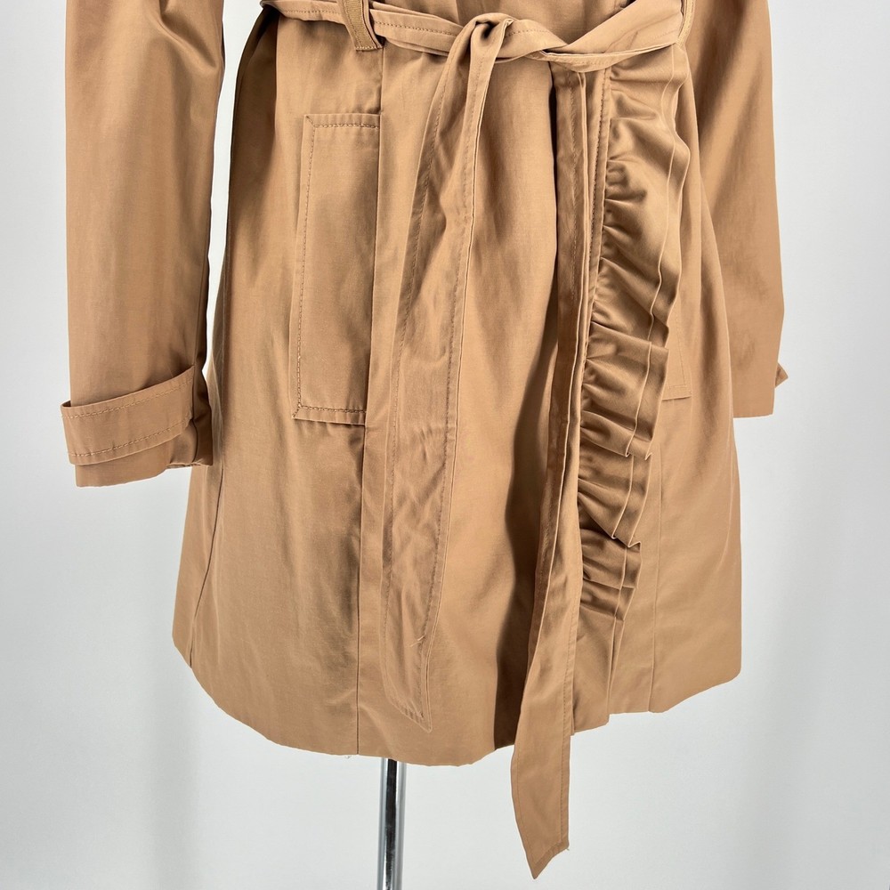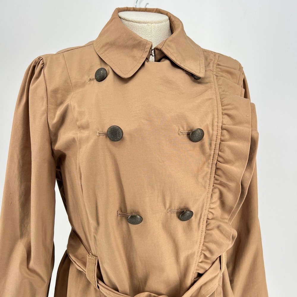 cuff buttons missing on both sleeves shown in photos. Sleeve cuff strap safety pinned to sleeve. Measurements: • Pit to Pit: 20 in • Length: 35 in • Waist: 18 in Keywords: Anthropologie, trench coat, tan, double breasted, ruffle trim, belted, classic, lightweight, fall fashion, spring fashion, outerwear, Sophisticated, chic, • Please note: An AI-generated model was used to showcase this item for visual styling purposes only. • Please refer to all photos for the most accurate representation of condition. • Please compare the measurements to something you already own. • Fast shipping; Same day or next day shipping! Thanks so much!