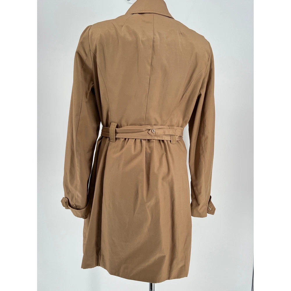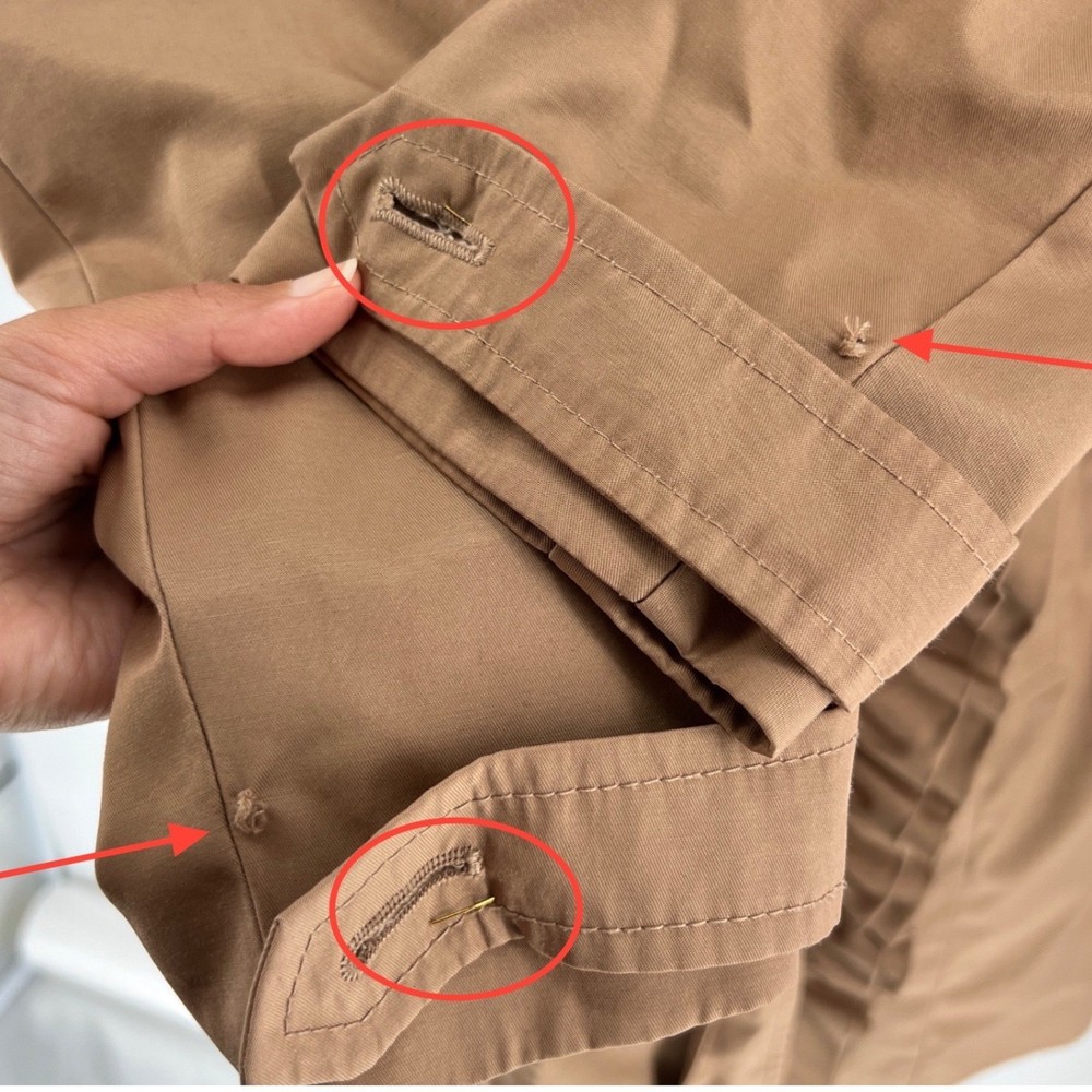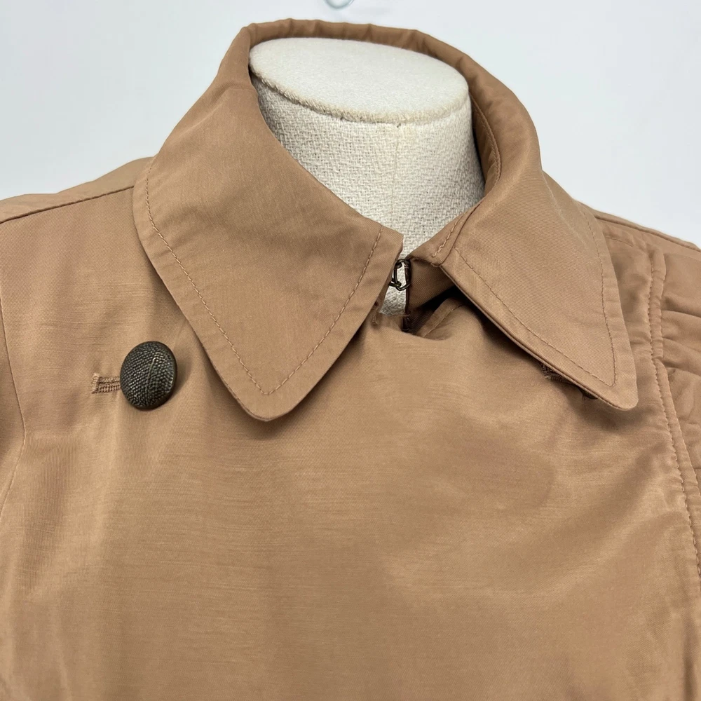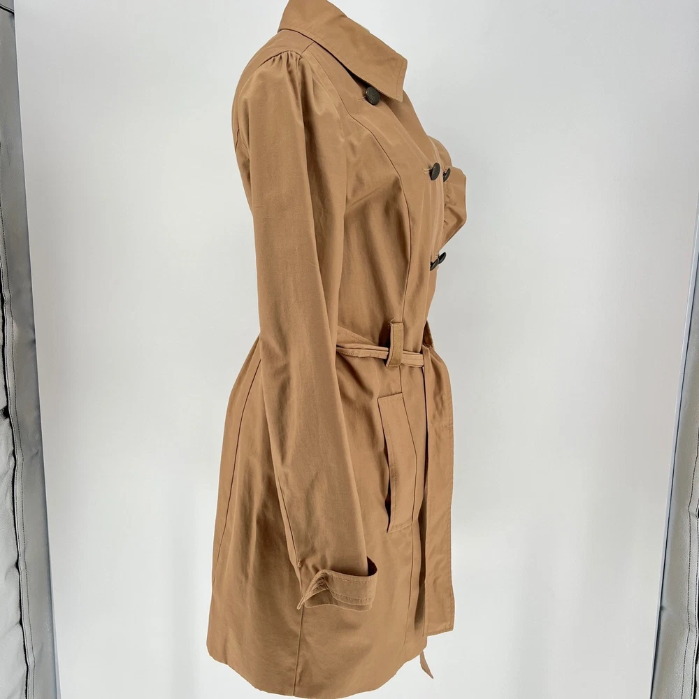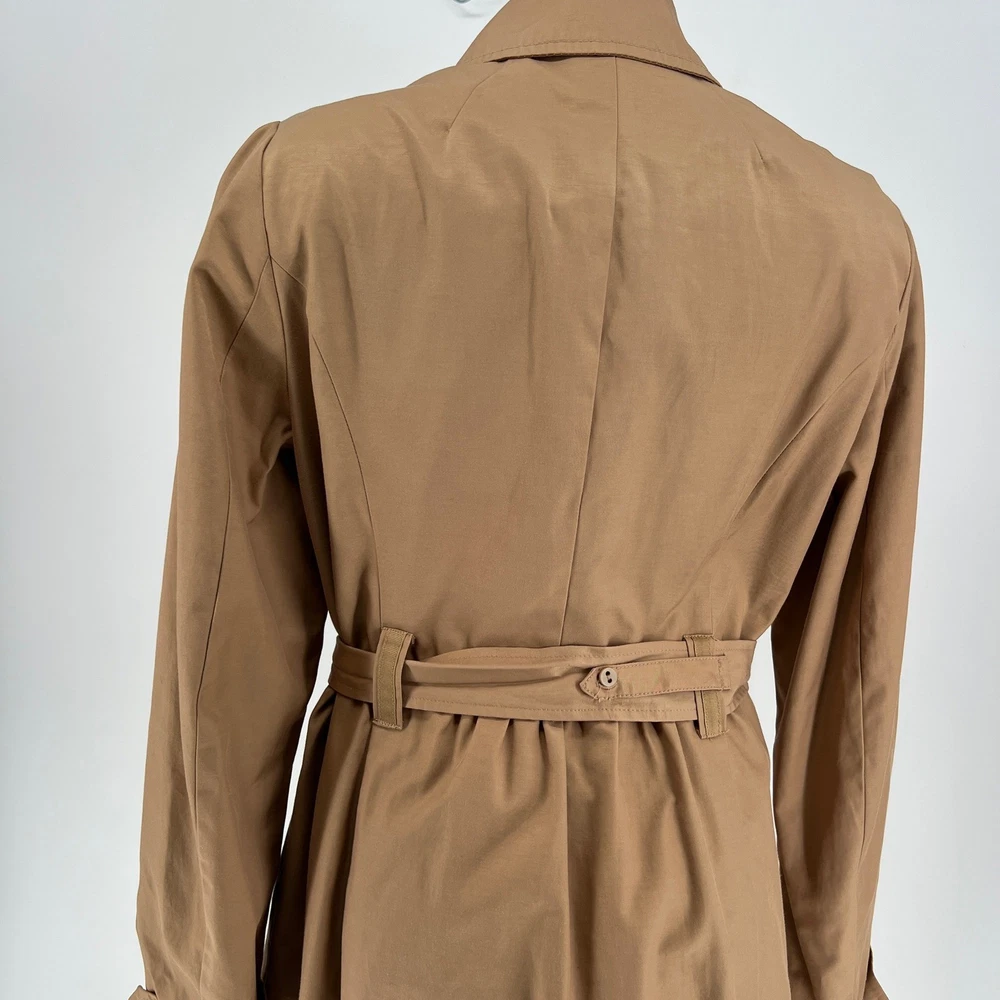cuff buttons missing on both sleeves shown in photos. Sleeve cuff strap safety pinned to sleeve. Measurements: • Pit to Pit: 20 in • Length: 35 in • Waist: 18 in Keywords: Anthropologie, trench coat, tan, double breasted, ruffle trim, belted, classic, lightweight, fall fashion, spring fashion, outerwear, Sophisticated, chic, • Please note: An AI-generated model was used to showcase this item for visual styling purposes only. • Please refer to all photos for the most accurate representation of condition. • Please compare the measurements to something you already own. • Fast shipping; Same day or next day shipping! Thanks so much!