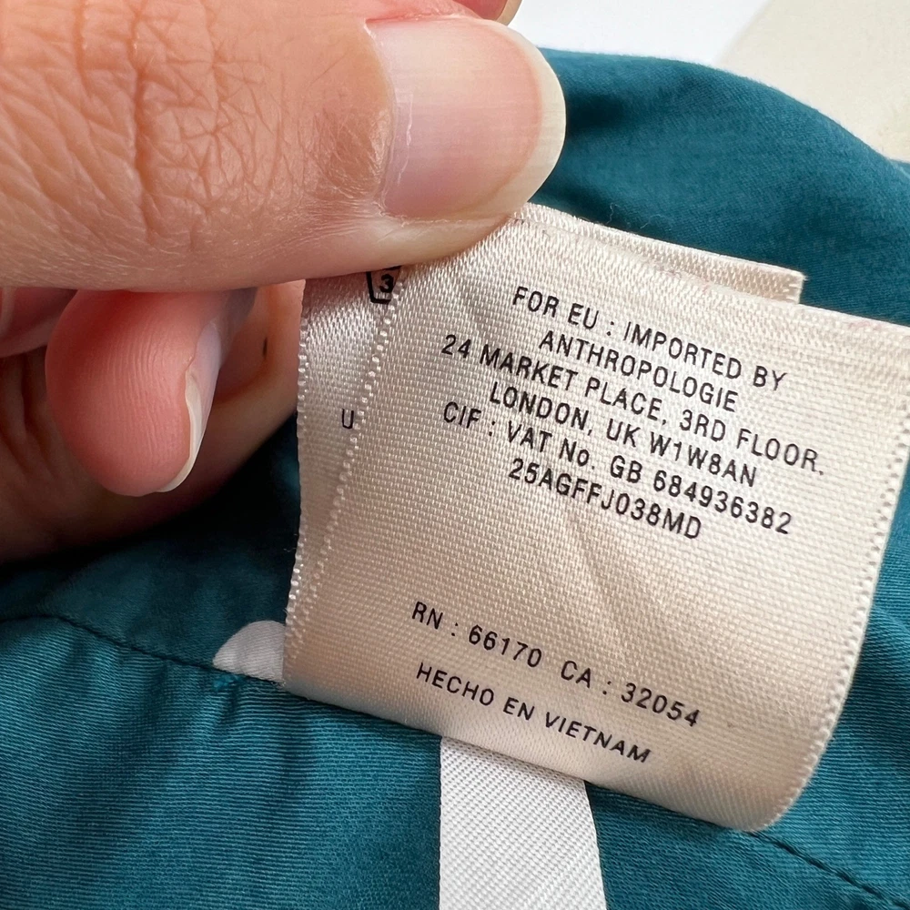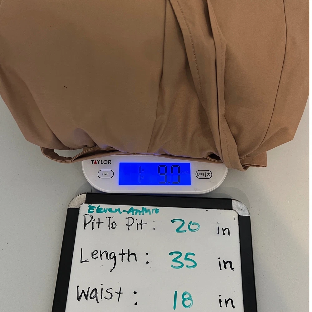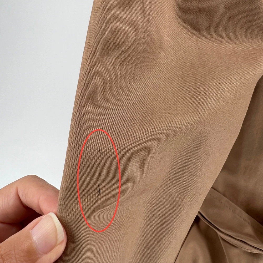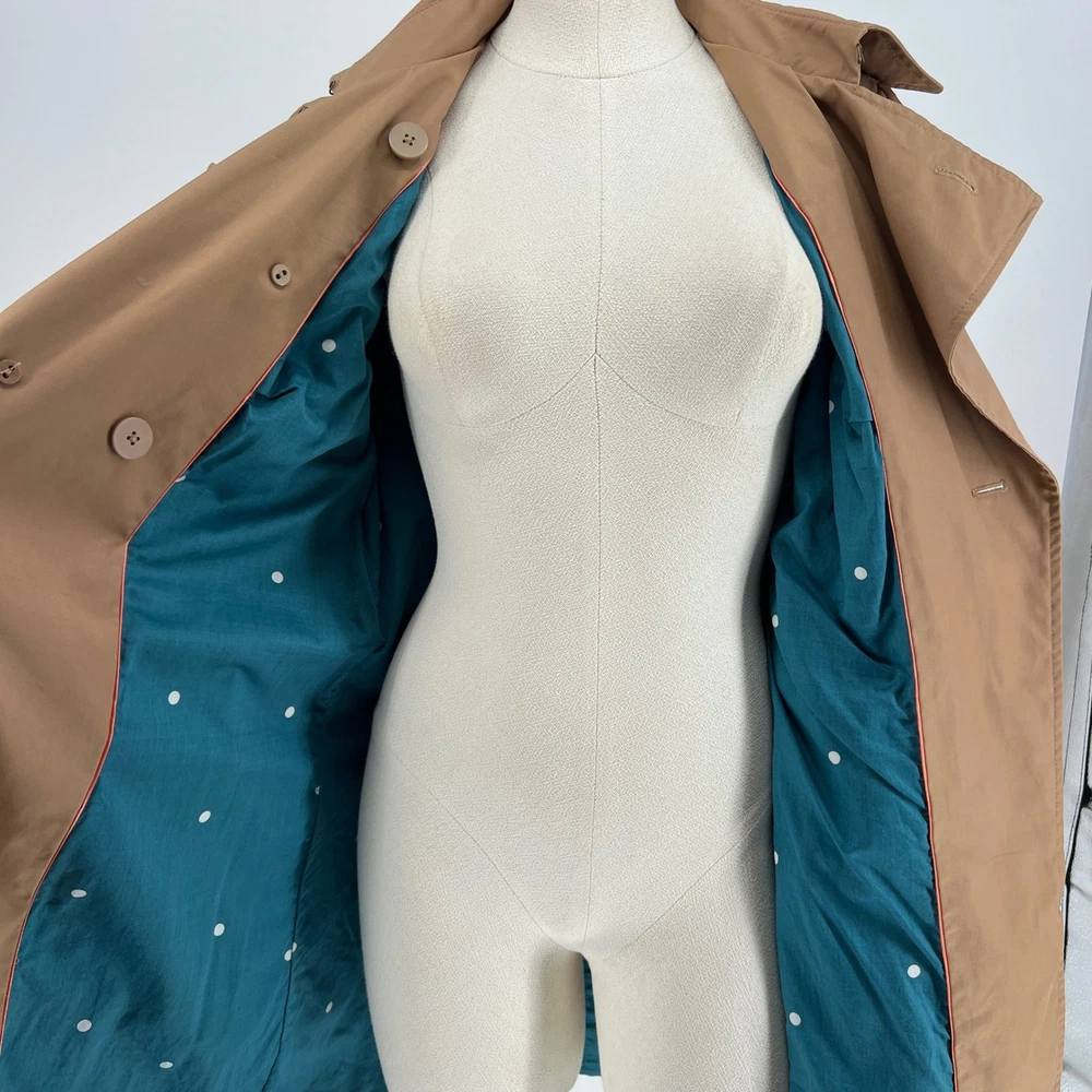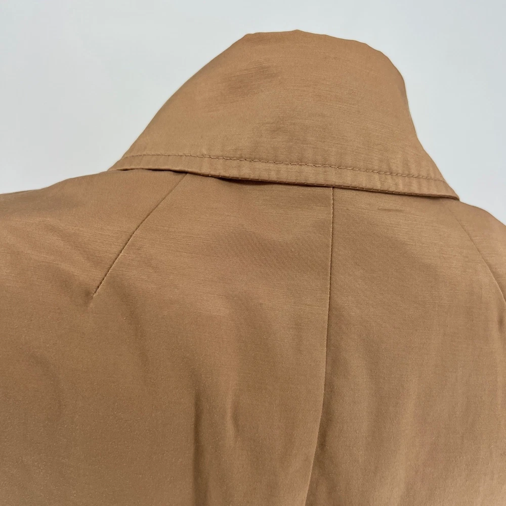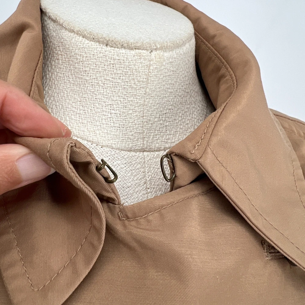 cuff buttons missing on both sleeves shown in photos. Sleeve cuff strap safety pinned to sleeve. Measurements: • Pit to Pit: 20 in • Length: 35 in • Waist: 18 in Keywords: Anthropologie, trench coat, tan, double breasted, ruffle trim, belted, classic, lightweight, fall fashion, spring fashion, outerwear, Sophisticated, chic, • Please note: An AI-generated model was used to showcase this item for visual styling purposes only. • Please refer to all photos for the most accurate representation of condition. • Please compare the measurements to something you already own. • Fast shipping; Same day or next day shipping! Thanks so much!