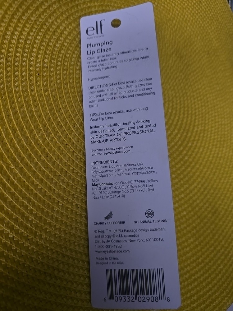 Effect: plumping lip glaze Shade: baby doll Type: Lip Glaze Size: Standard Brand: ELF Model: Glaze 2908 Volume: .06