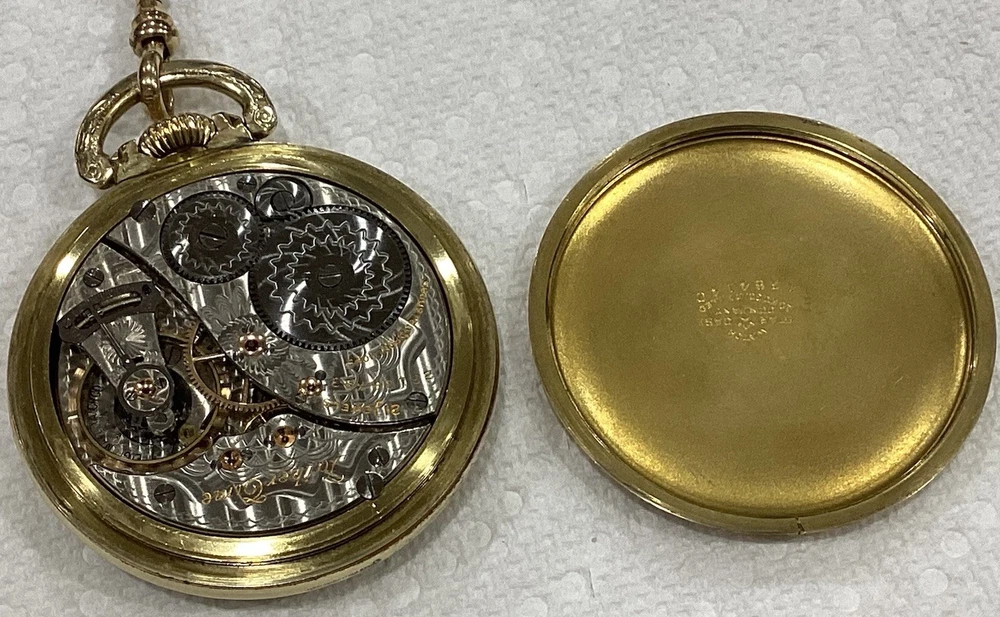For your consideration is this circa 1921 Elgin Father Time Grade 454 Model 15 Railroad Grade 21 jewel, size 16, open face, lever set, adjusted to 5 positions Men’s pocket with Simmons watch chain. The case and movement are both in good preowned condition with normal wear from age and use, the case has some light scratching as does the crystal but the plating is strong and I see no dents. The porcelain or enamel dial looks great with no damage. The case is marked “STAR WATCH CASE COMPANY 10 KT. GOLD FILLED , see photos. The Simmons chain is marked “SIMMONS” and is n good condition. The watch itself has been running and keeping time but I have not had it cleaned or tested for exact timing so as always it may need adjustment after shipping. Check out all of the photos for the best description and ask questions if you have them. Please check my other listings as I will be listing several Railroad Grade Pocket Watches from the estate of a collector. The serial number on this pocket watch is “23128793”. My shipping charge includes insurance for the final value realized on the watch and I pack very securely. Thanks for looking and good luck should you decide to bid.