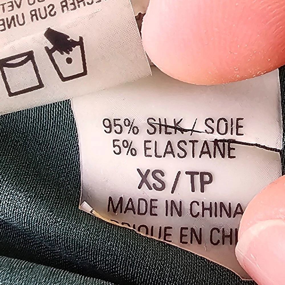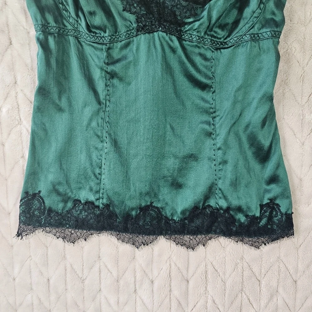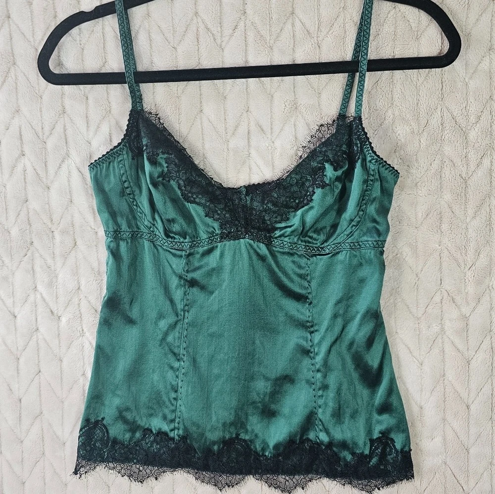 Beautiful emerald green silk camisole with black lace trim. Has a zipper closure on the back. Babydoll bust line with defined cups. Elastic around the top for the best fit! Embroidered style detail down the front to mimic the look of boning. Adjustable straps. In excellent pre owned condition, has one small spot that will come out with treatment.